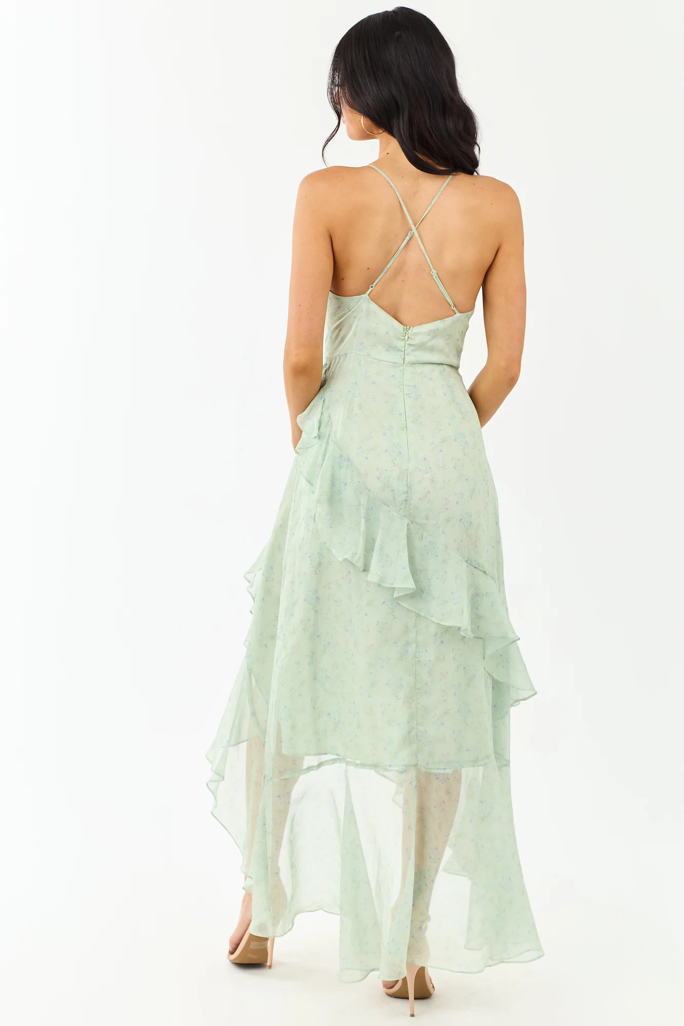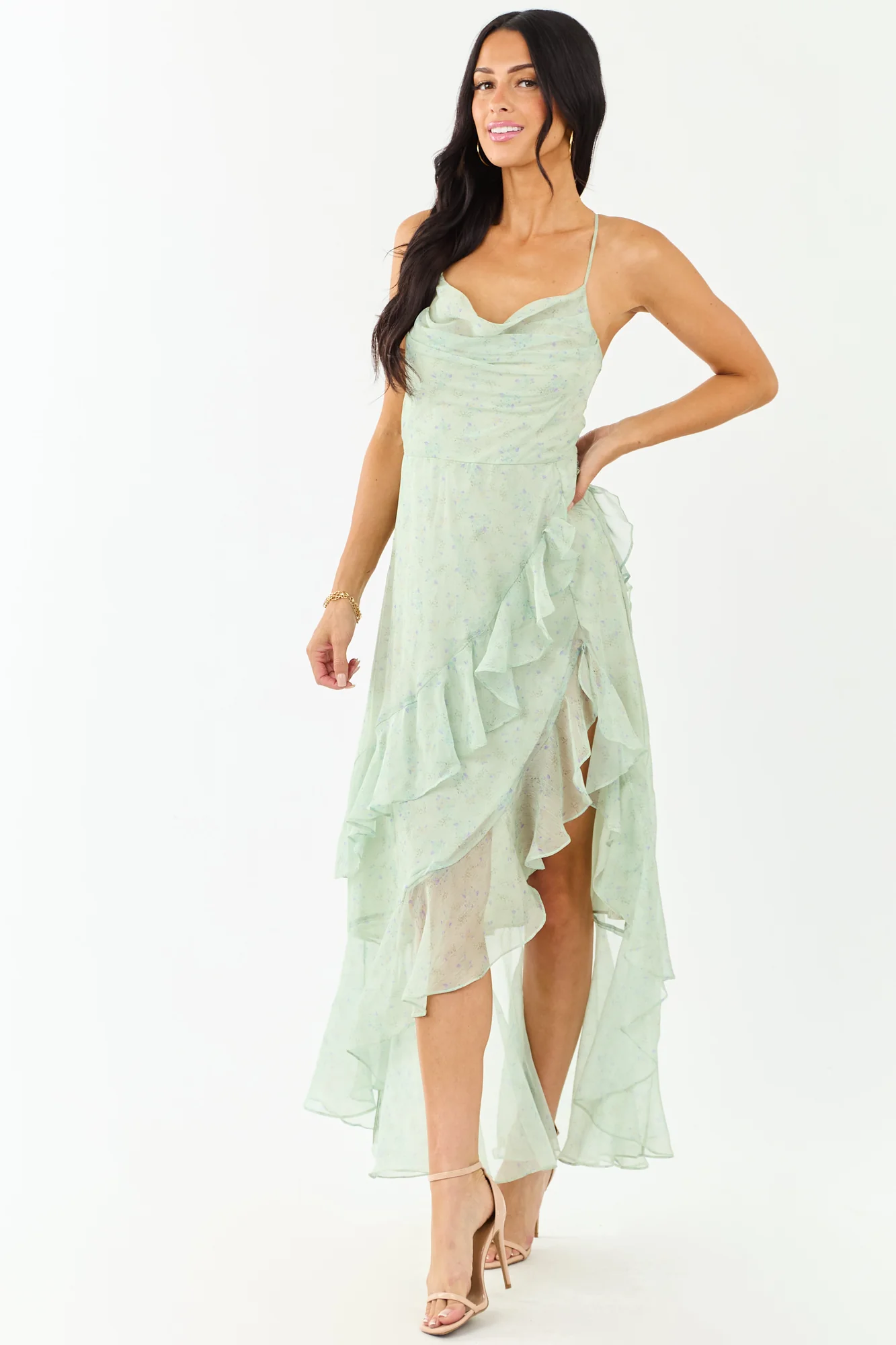 Embrace ruffles, romance, and a high slit in this floral chiffon boho maxi dress. Perfect for a breezy day outing, featuring a cowl neckline, adjustable spaghetti straps, and a flattering high side slit. This dress is non-stretchy with a sheer chiffon overlay in Sage, Lavender, Sea Blue, and Berry tones. Stay cool and stylish in this 100% Polyester dress. Available in sizes XS to XL.