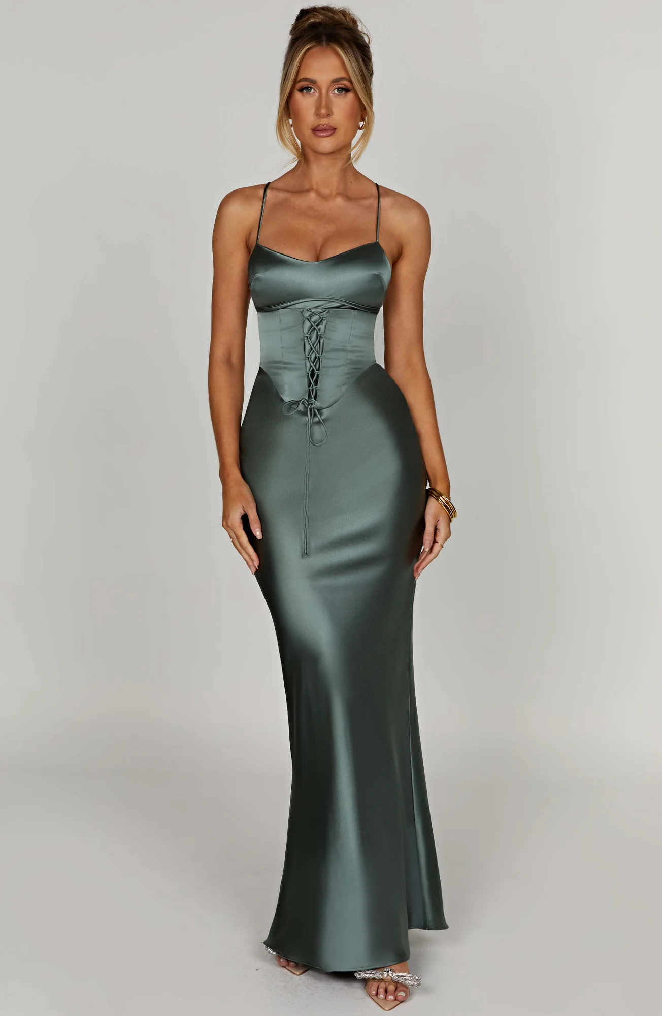 Indulge in the elegance of the Sage Maxi Dress, crafted from luxurious premium bias cut satin. This ultra-feminine dress features a corset bodice with in-built boning and lace-up detail for a cinched waist. Adorned with soft bust and thin straps, this maxi dress delivers a stunning silhouette. Ideal for bridesmaids, evening events, formals, proms, races, and weddings. Experience the enchantment of the Enchante Collection in this must-have attire. Available in sizes XS to XXL.