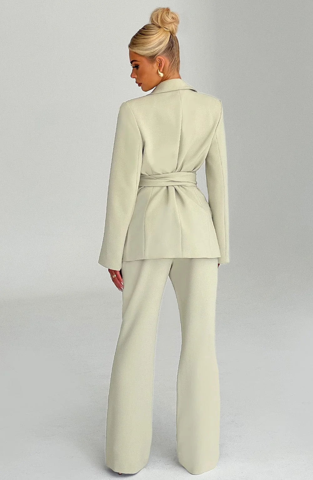 Introducing the Hazel pants, a beautifully tailored design in sage color. These high-waisted pants feature a slight flare at the hem, offering a sophisticated look. Made from premium soft tailored fabric, the Hazel pants are designed for a perfect fit. Pair them with the matching Hazel jacket for a chic ensemble. Get yours today!