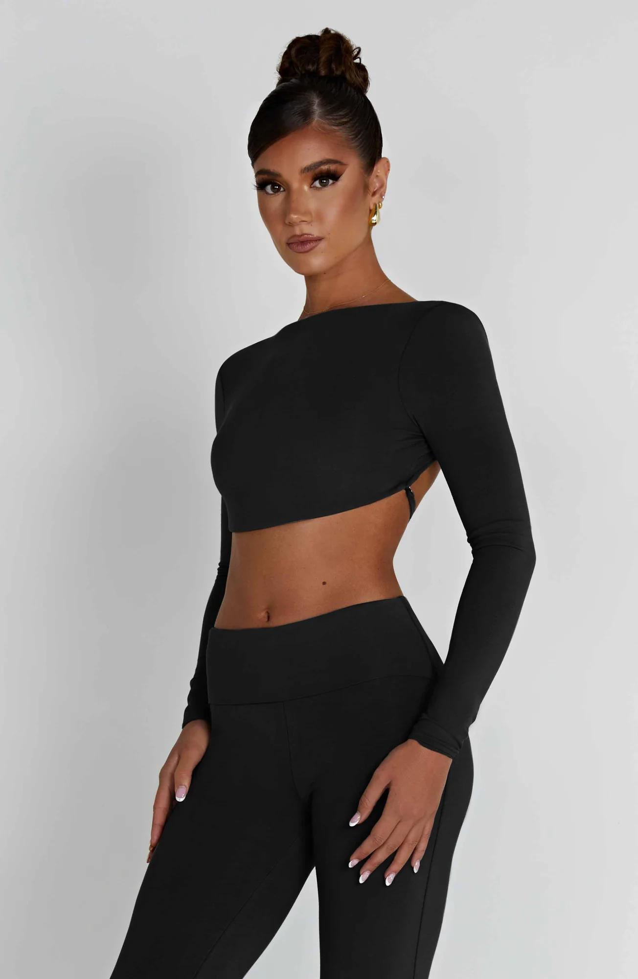 Indulge in the luxury of our Sahra black modal crop top, meticulously crafted for comfort and style. This double-lined garment offers a second skin feel with exceptional flexibility, contouring to your bodys shape effortlessly. Made with premium modal fabric, it features a high neck, long sleeves, and a captivating backless tie strap detail. Elevate your wardrobe by pairing it with our Yasmin maxi for a chic ensemble. Get yours today!