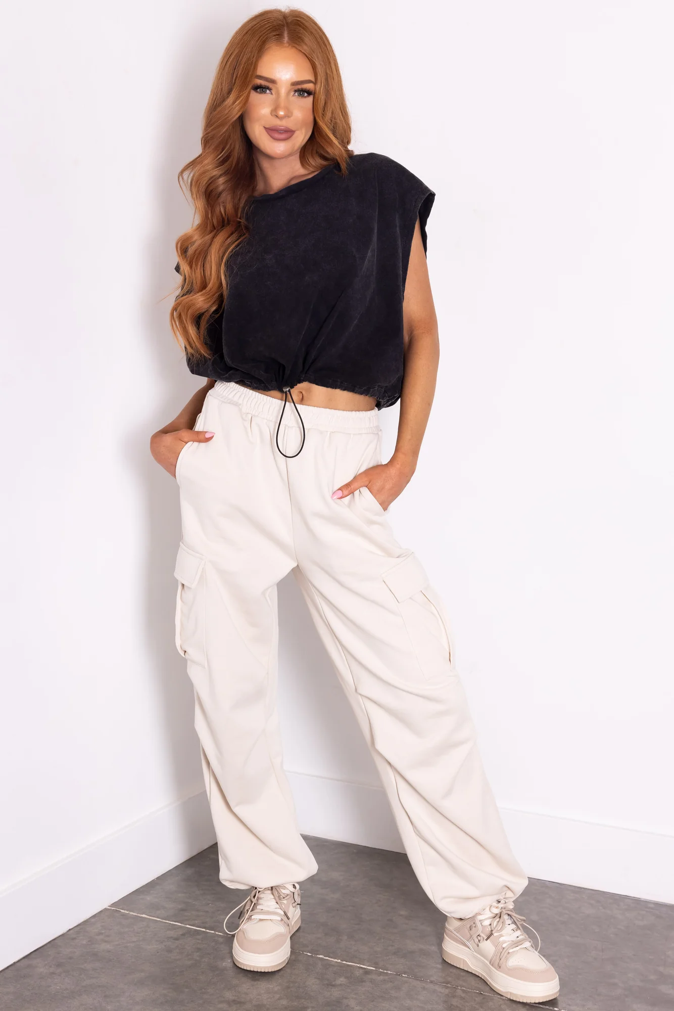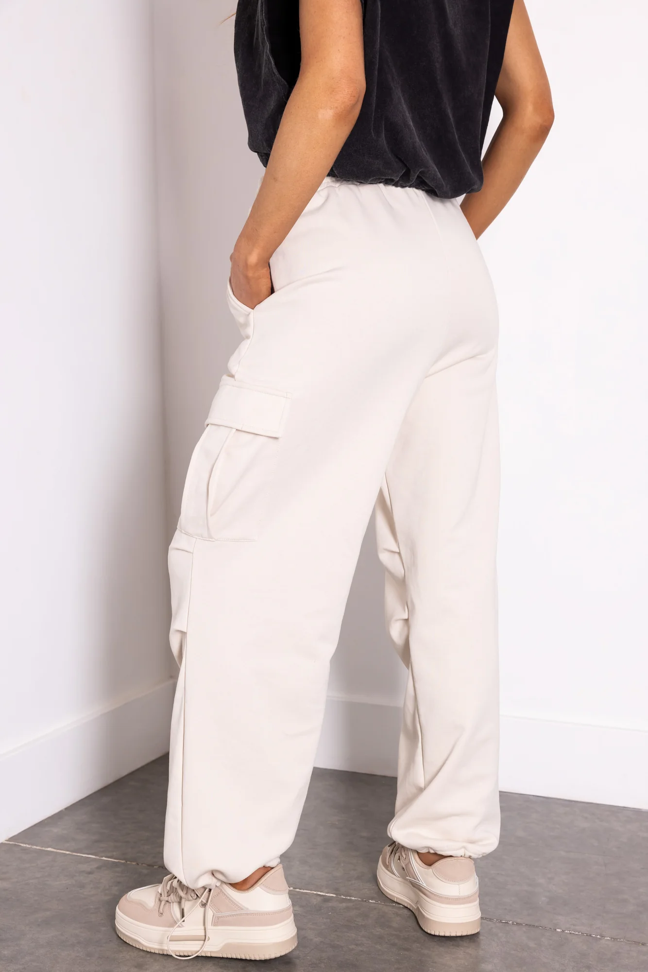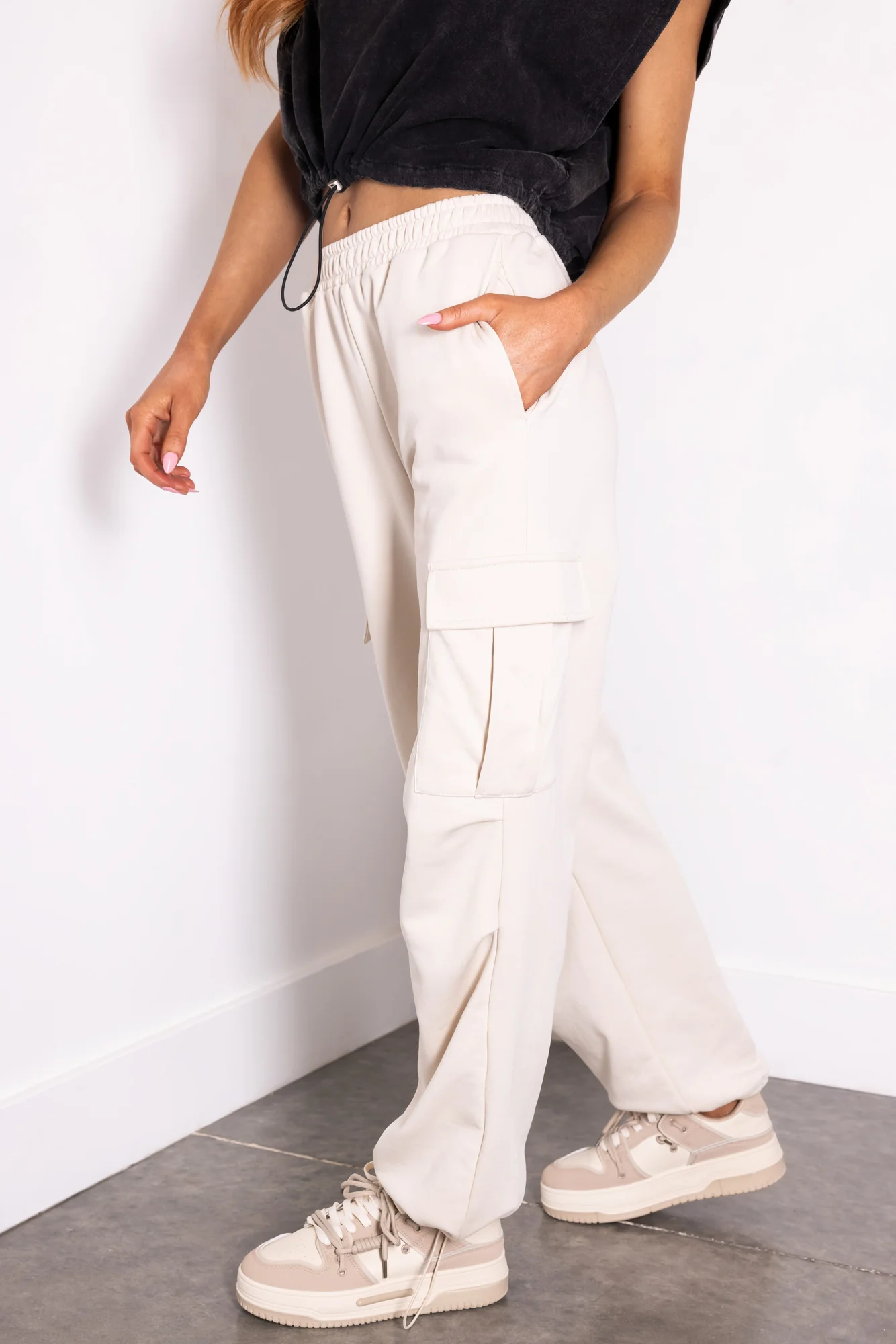 Experience the perfect blend of comfort and style with our Sand Wide Leg Cargo Pants. Available in sizes Small, Medium, and Large, these pants feature a smocked waist and are made of soft and stretchy knit fabric for a snug fit. The adjustable bungee drawstring on the cuffs adds a touch of versatility, while the side pockets and cargo pockets offer convenience and functionality for your daily activities. Handcrafted from 80% Cotton and 20% Polyester, these pants are perfect for casual daytime wear during spring and summer seasons. Model height: 55″, Size: 1, Bust: 31″, Waist: 24″.