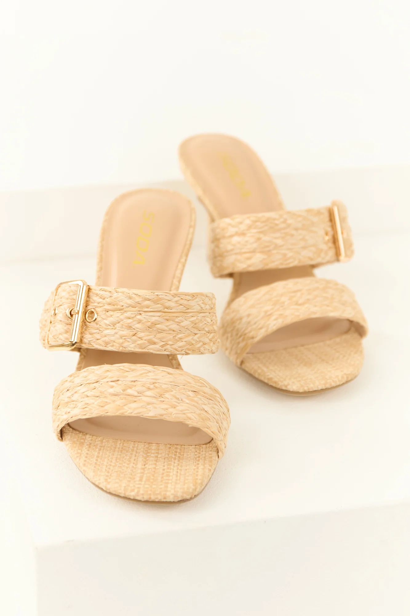 Experience sophistication with our Sand Woven Double Strap Stiletto Heels in a chic blend of Taupe and Ivory. These heels feature woven details, a rounded square open toe, adjustable buckle strap, slightly cushioned insole, and a slip-on design. With a 3.25″ stiletto heel, they exude elegance and style. Imported.