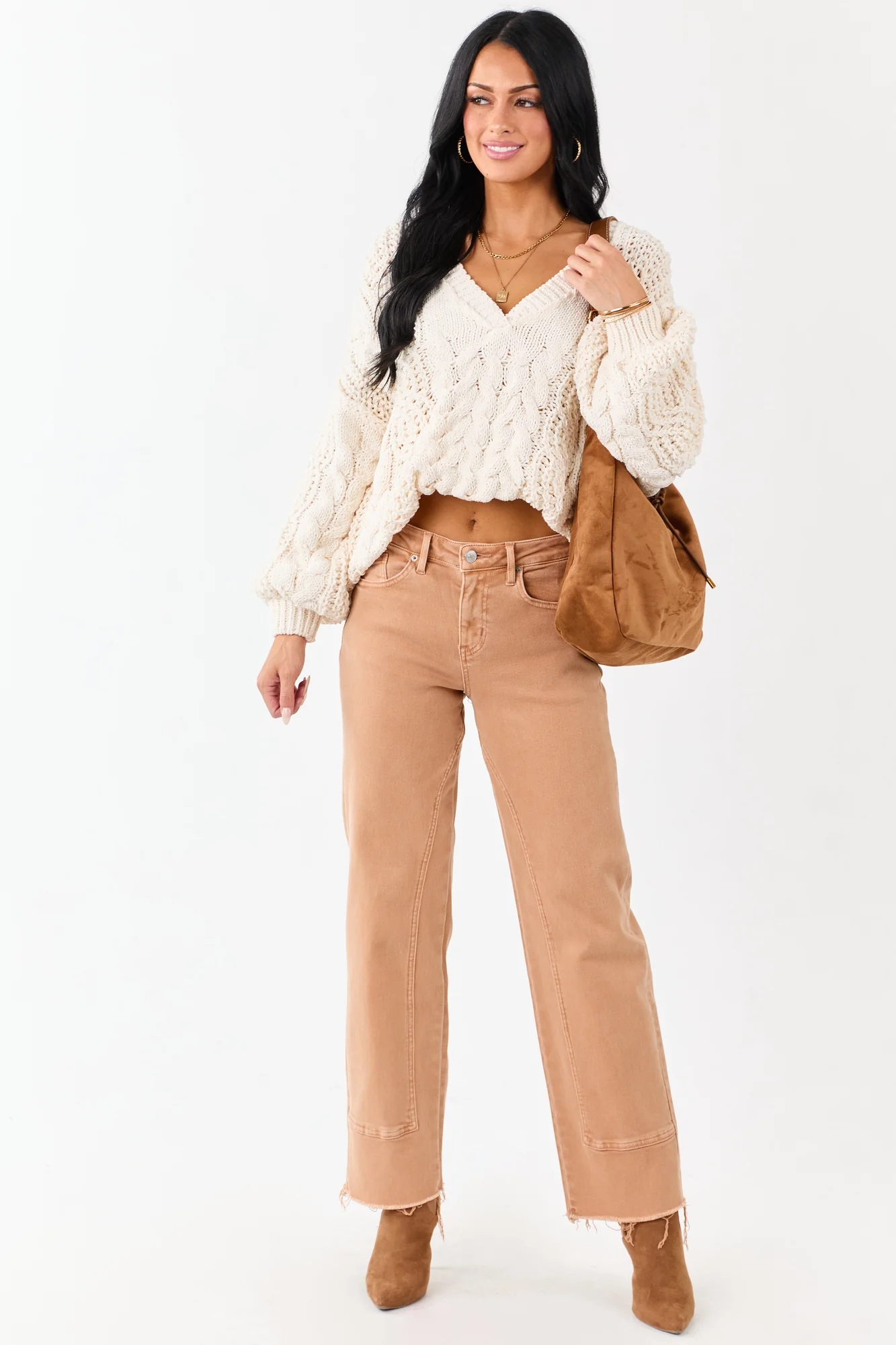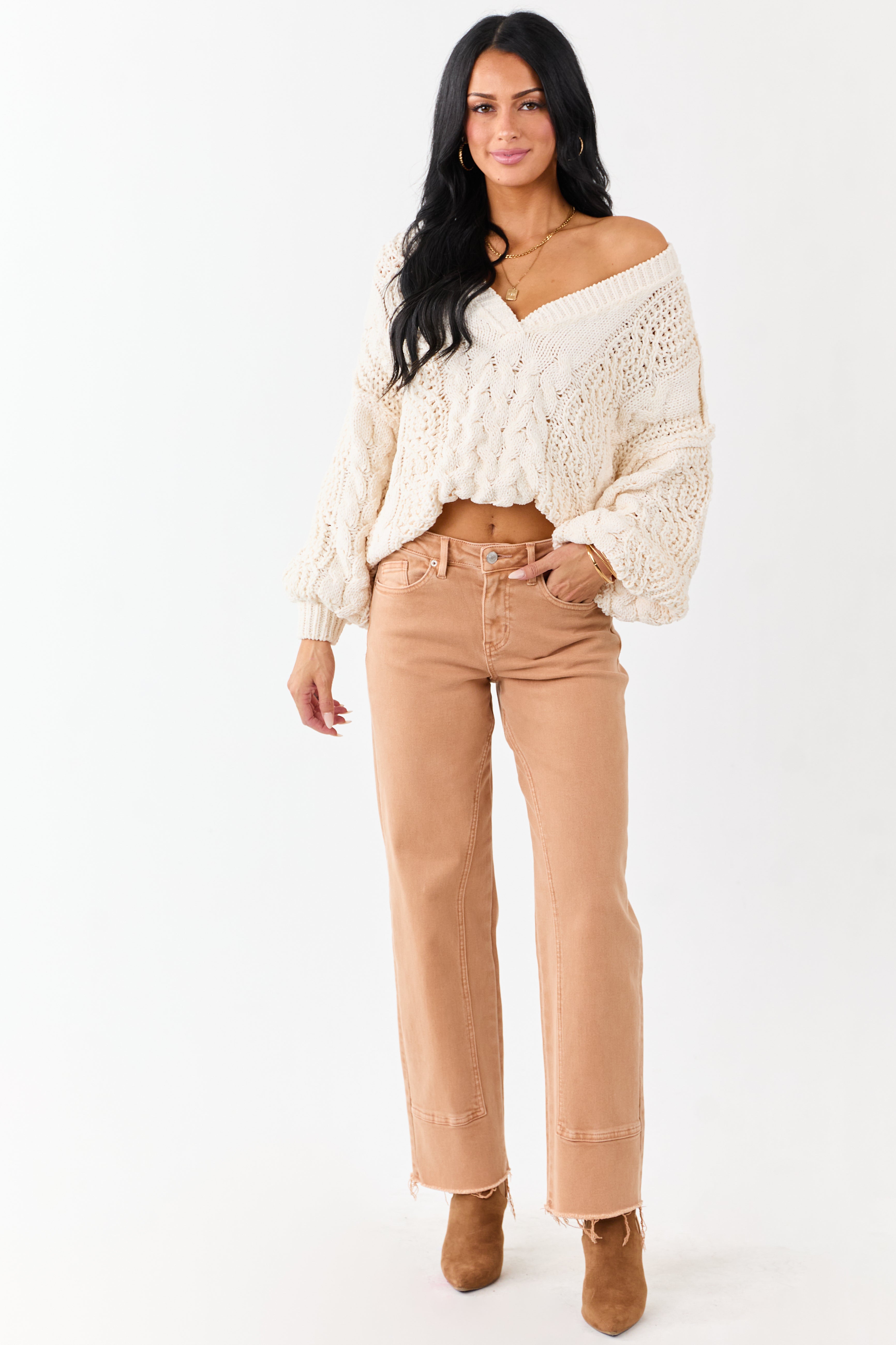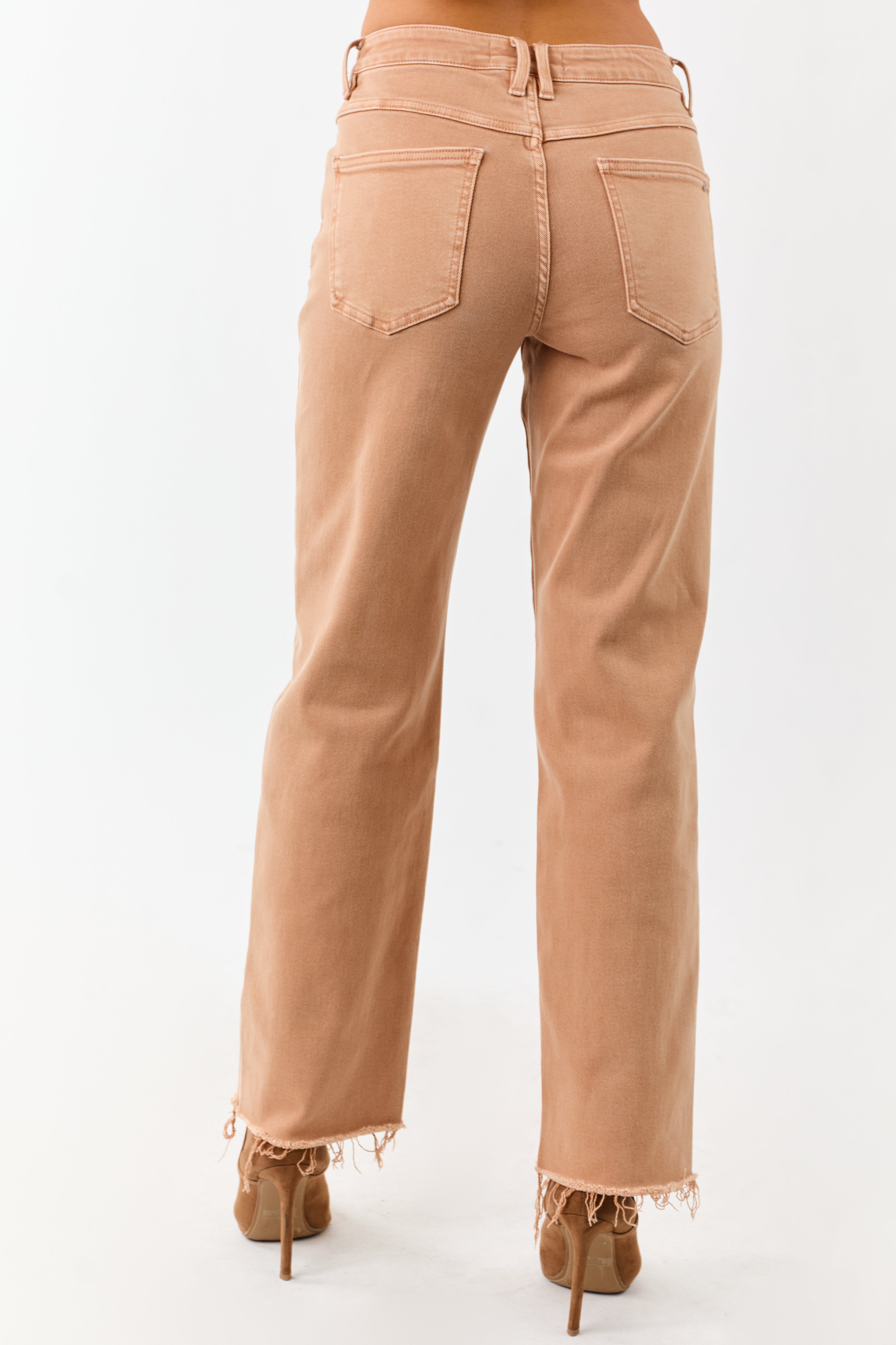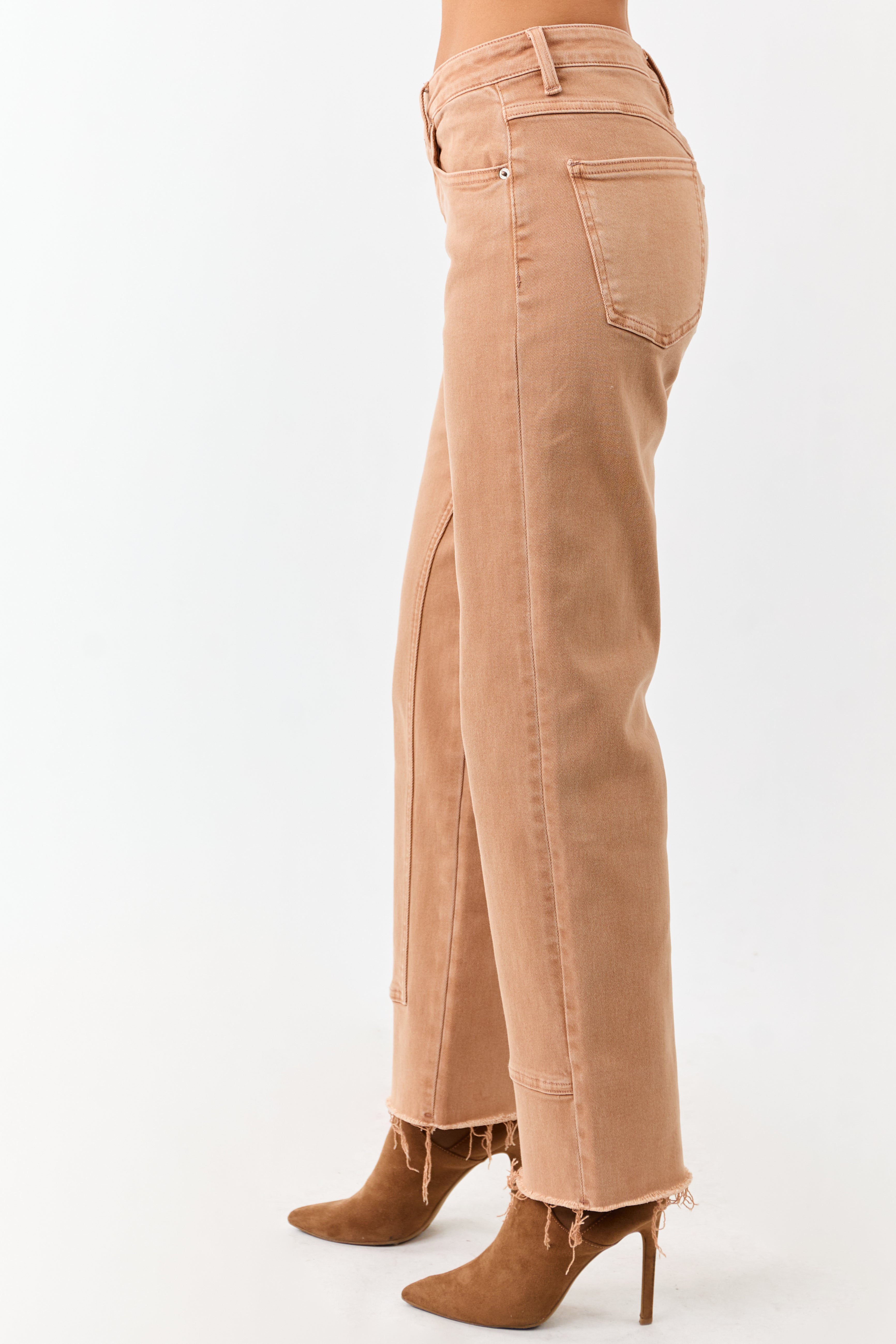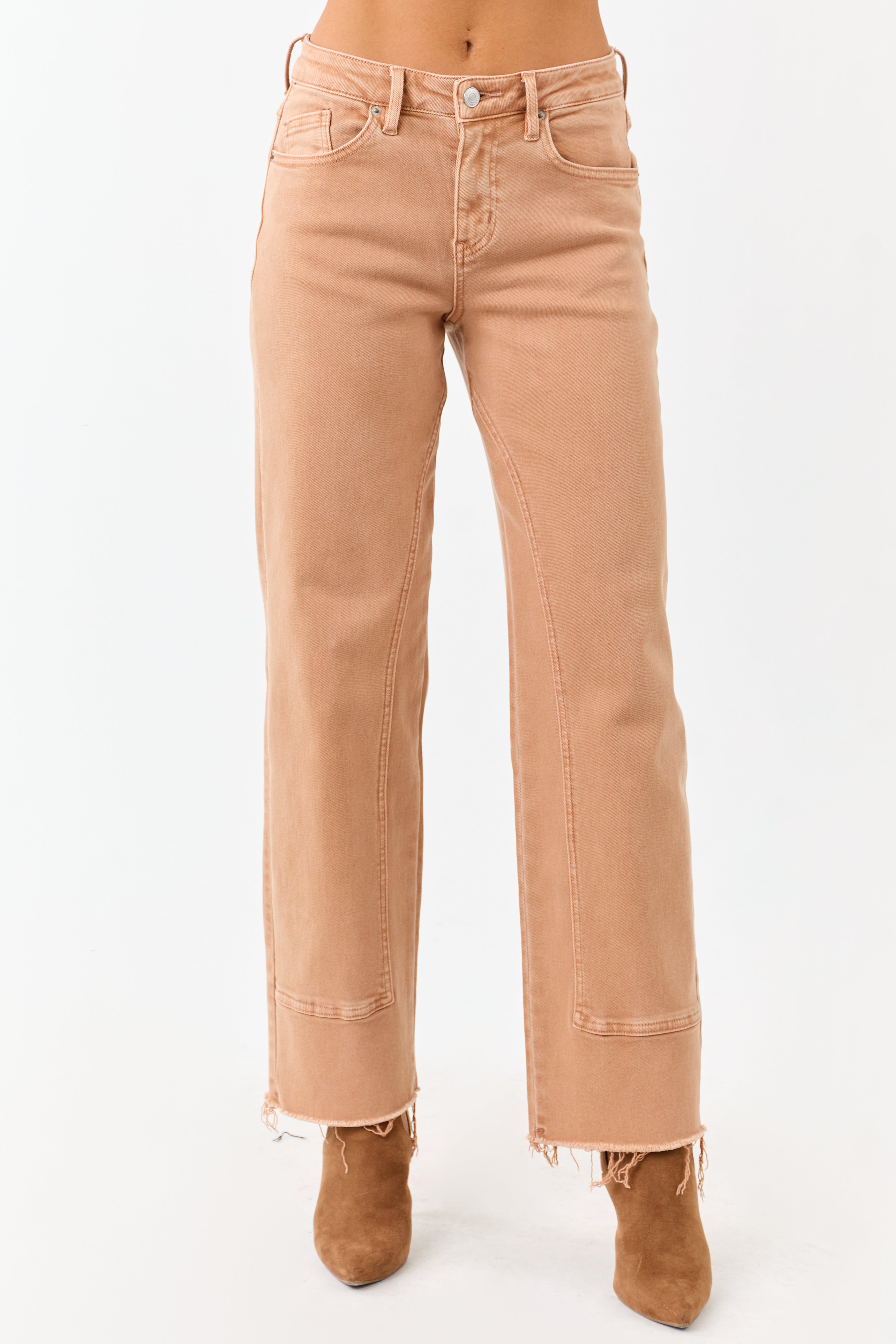 Elevate your casual style with these sandstone high rise straight jeans for women. Crafted from stretchy denim, these jeans feature a raw hem, front seam detail, and a comfortable fit. The high-rise design and raw cut off hem add a trendy touch. Made from 90% Cotton, 8% Polyester, and 2% Spandex for a perfect blend of comfort and style. Whether for a casual day out or a relaxed evening, these jeans are a versatile addition to your wardrobe. Available in waist sizes from 25 to 32 and hip sizes from 33 to 41. Inseam length is 29 inches.