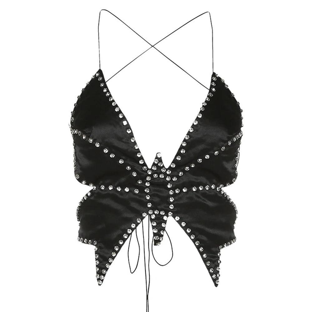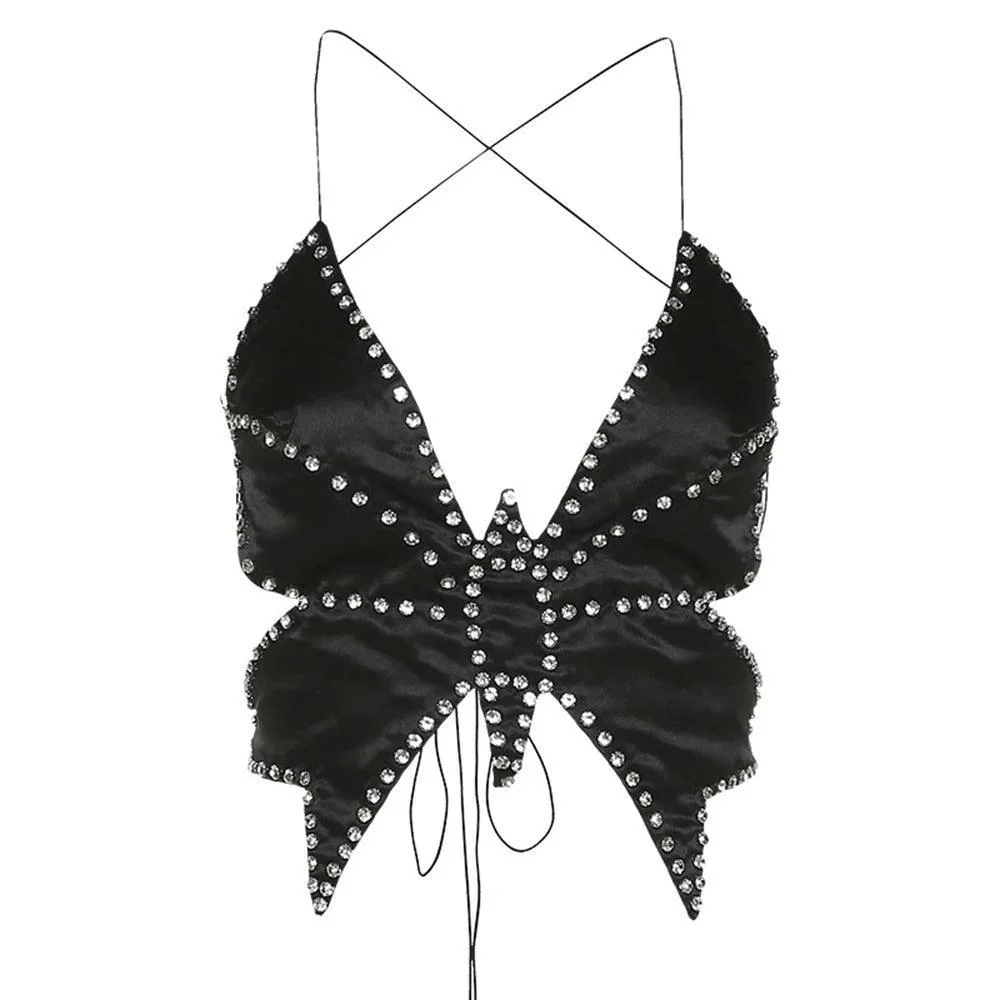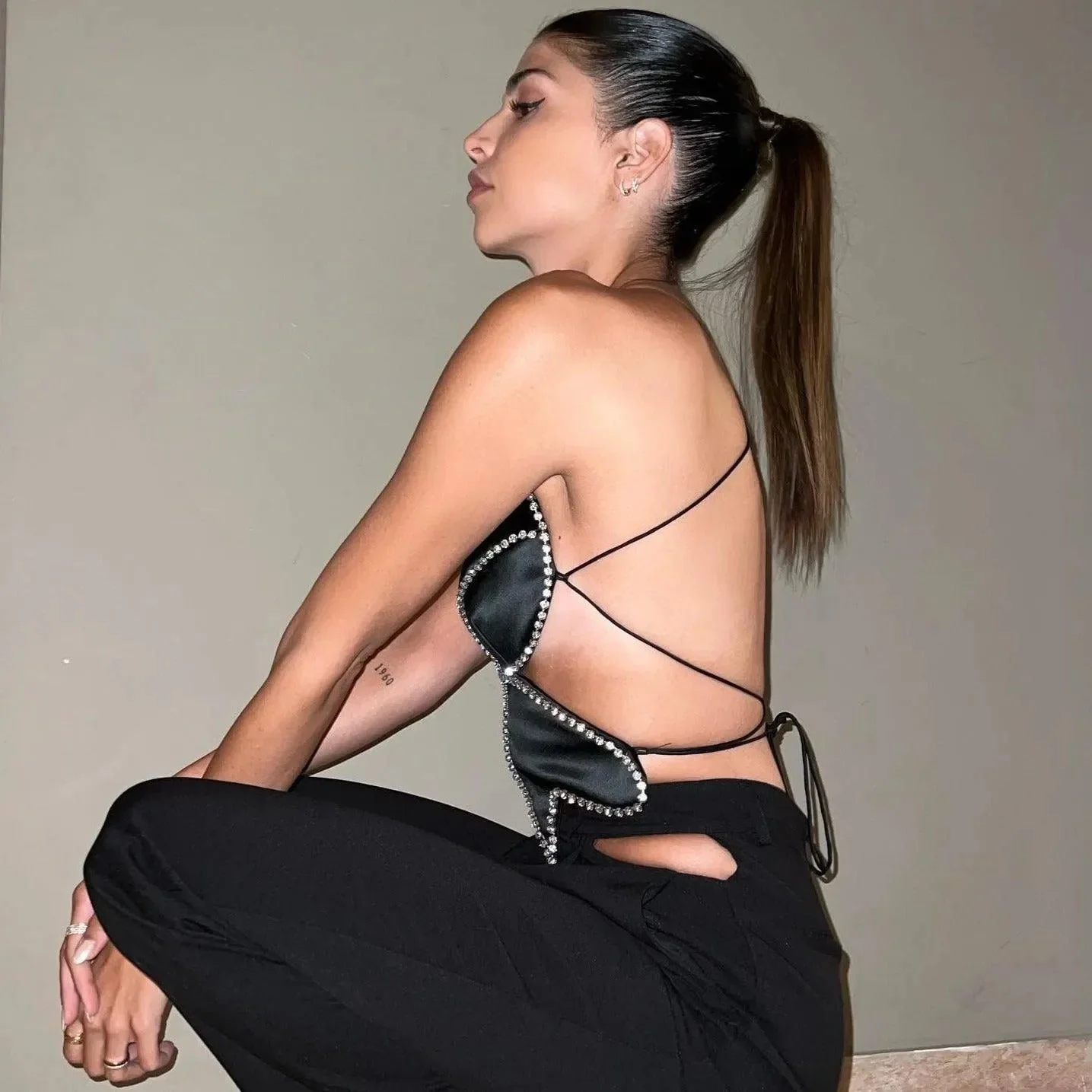 Elevate your wardrobe with our Satin Crystal Backless Crop Top. This glamorous top features intricate lace-up closures adorned with sparkling crystals, perfect for special events or a stylish night out. Made from luxurious satin, it drapes beautifully, enhancing your silhouette comfortably. The detailed crystal embellishments add a touch of glamour, making it a standout choice for any occasion. Add elegance and sparkle to your outfit effortlessly. Free size exchange available if needed.