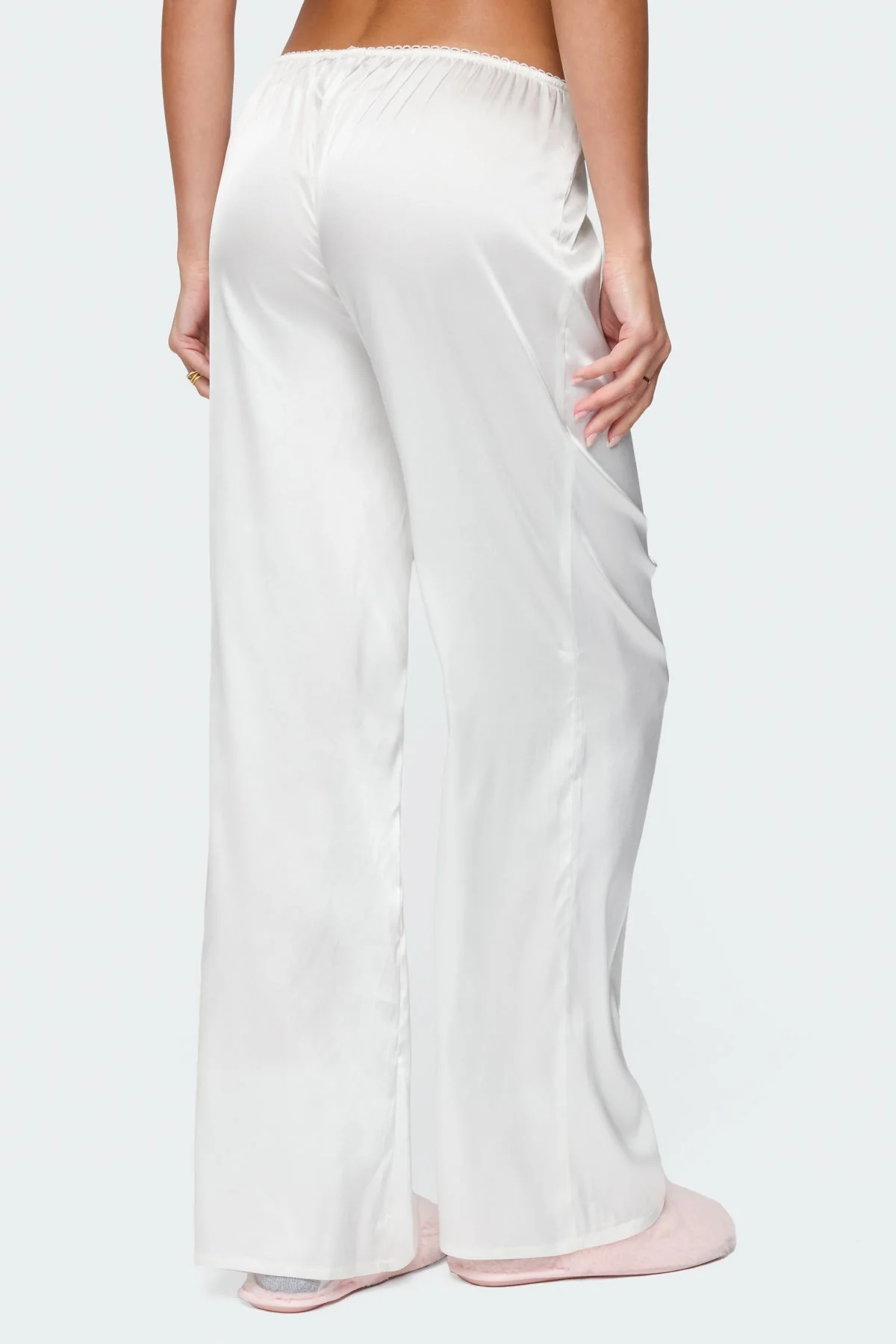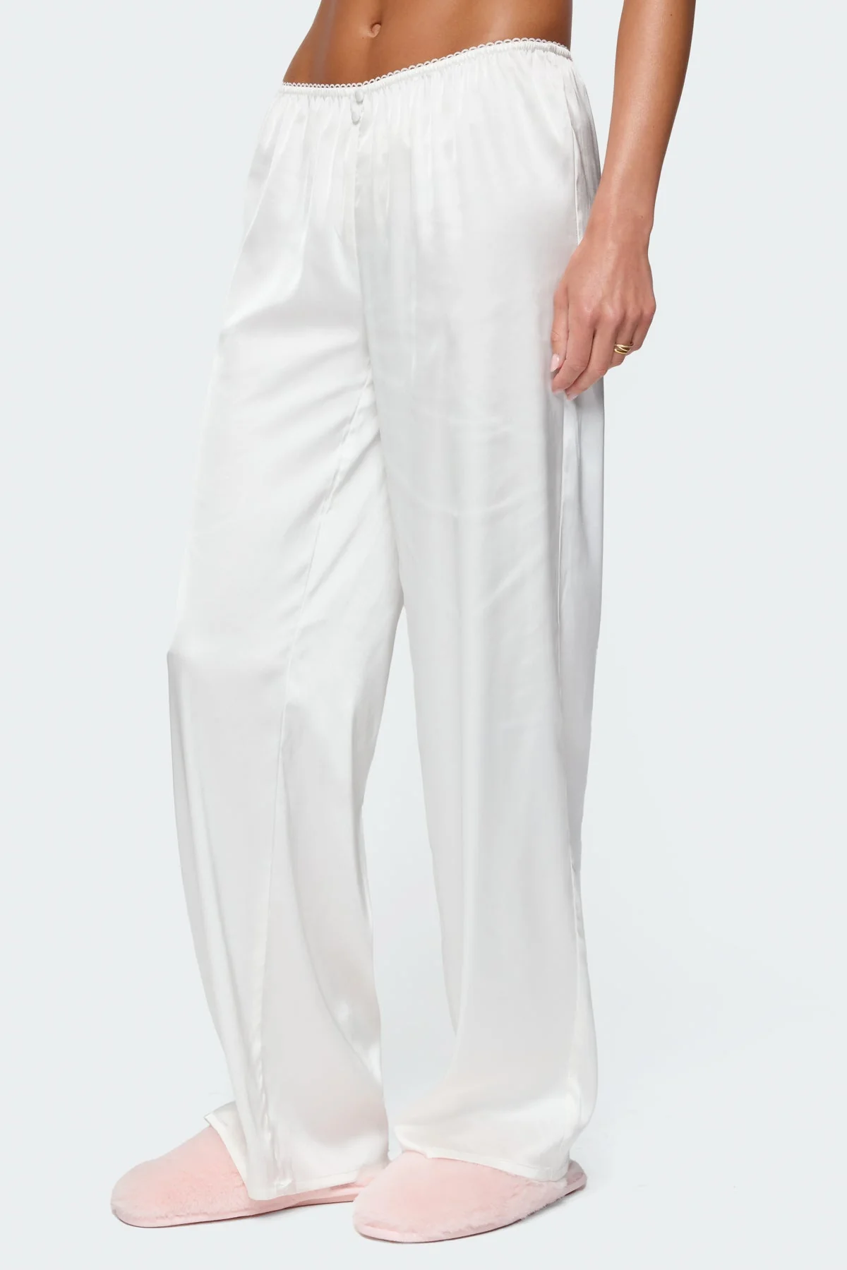 Indulge in luxurious comfort with these satin effect white sleepwear pants featuring an elastic waistband, frill trim, and button detailing. Crafted from a blend of polyester and spandex, these pants offer a sleek silhouette. The model wears size S with an inseam of 31.3 inches and a height of 59. Care instructions: Machine wash cold, do not bleach, tumble dry low, iron at a moderate temperature, do not dry clean.