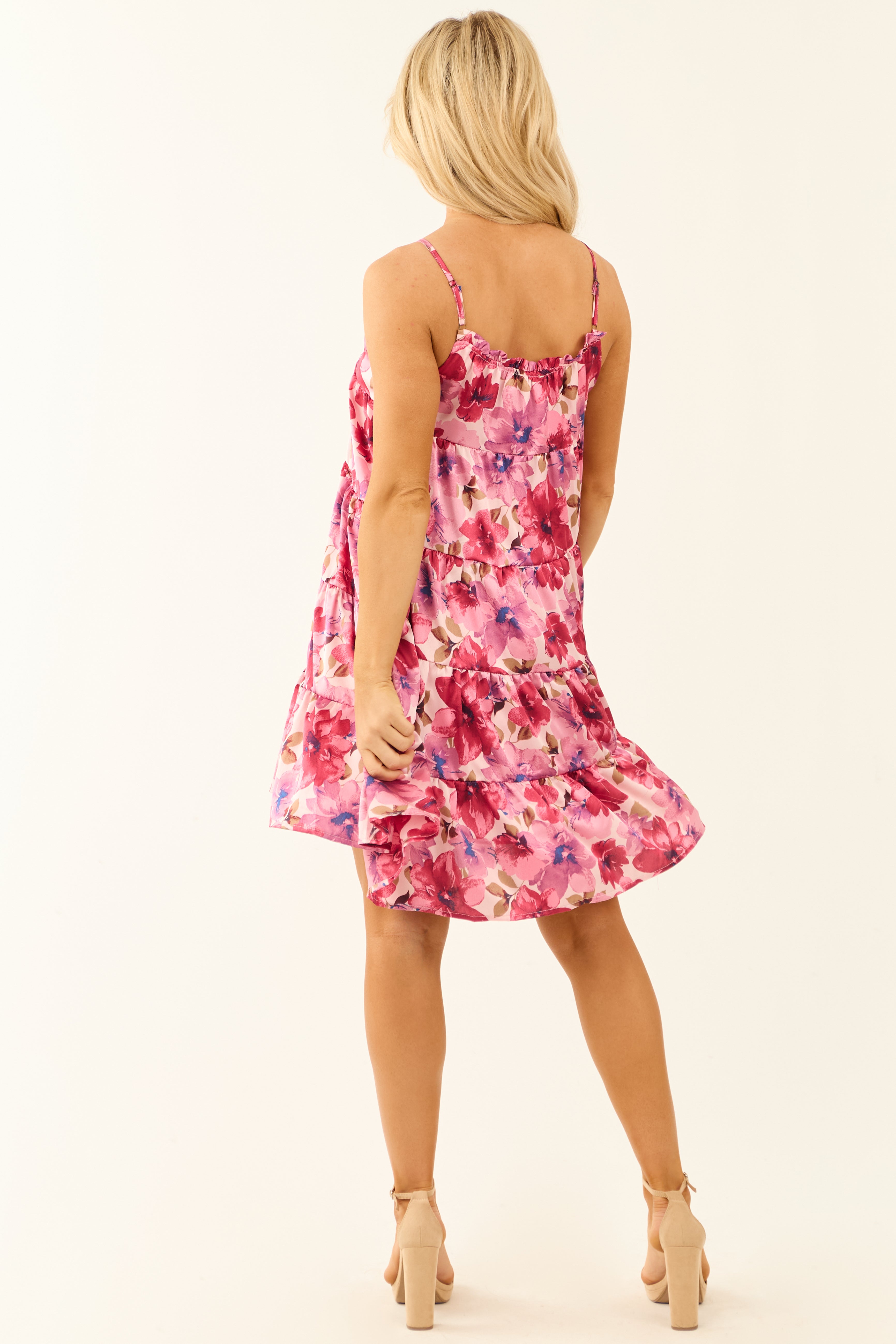 Indulge in the romantic charm of our Satin Floral Tiered Mini Dress in a stunning Magenta hue. This dress features a tent silhouette with a fringe elastic neckline, adjustable spaghetti straps, side pockets, and a non-stretch satin fabric adorned with a blend of Blush, Raspberry, Lavender, and Royal Blue blossoms. Available in sizes S, M, and L, this dress offers a loose fit that exudes effortless elegance. Hand wash recommended.
