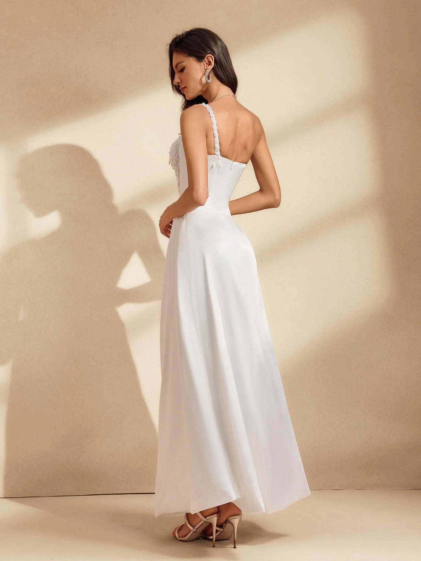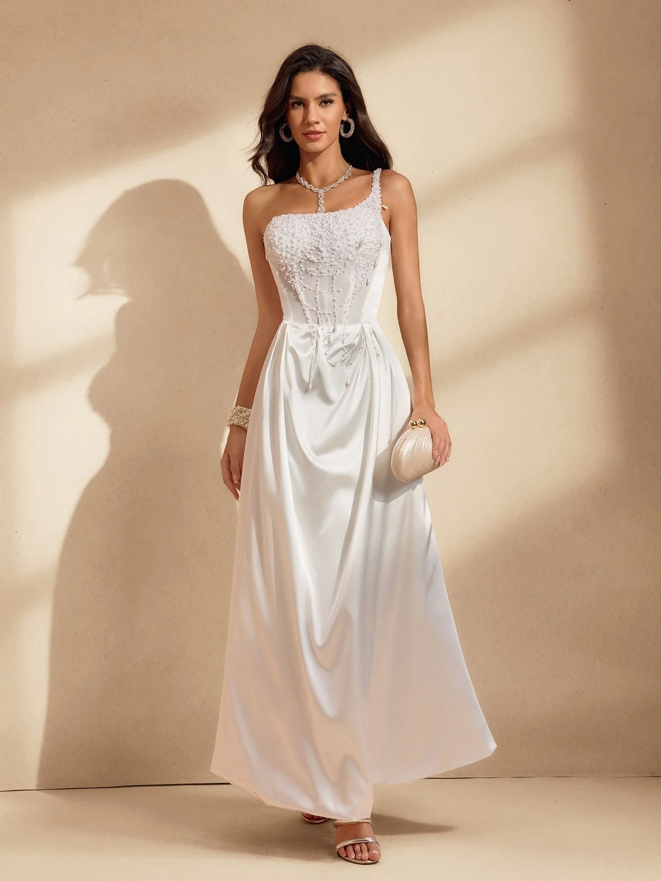 Elevate your style with the Satin One Shoulder Maxi Dress featuring exquisite pearl embellishments. Crafted from 100% Polyester with a slight stretch, this dress ensures luxurious comfort while creating a graceful silhouette. Perfect for formal events or special occasions, the sophisticated design and invisible zipper at the back add to its elegance. Dry clean only. Lighting may affect color perception. Model wears size S.
