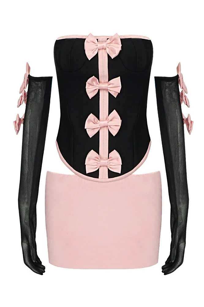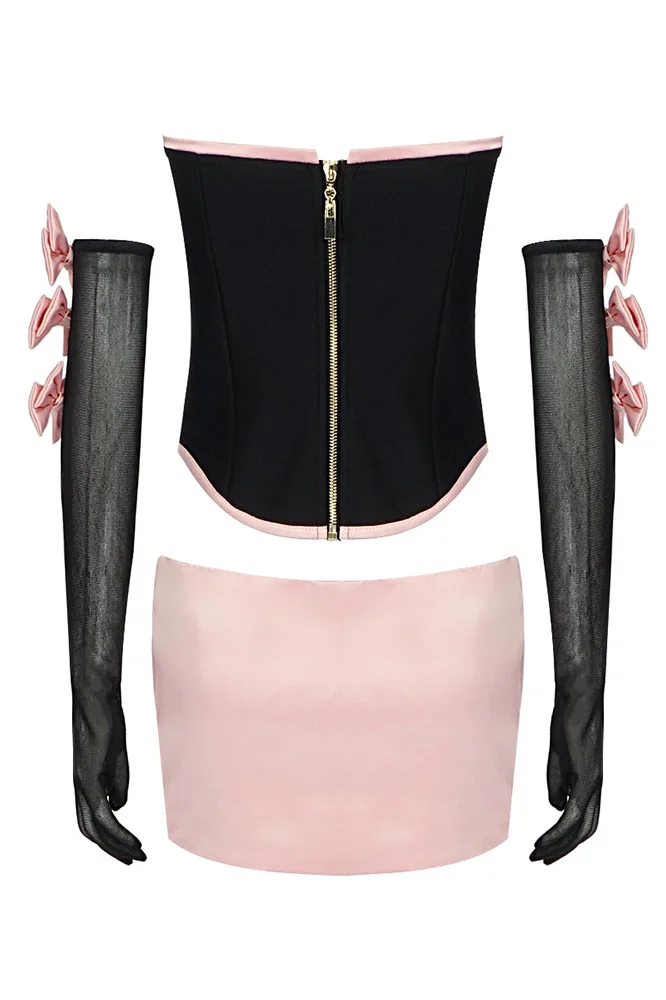 The Satin Strapless Bandage Skirt Set exudes luxury with its fine satin-finish fabric, bow-embellished bandage design, and comfortable support. This set includes gloves for a delicate finishing touch. Material: Bandage (95% Polyester, 5% Spandex), zippered back opening, high stretch factor. To maintain, hand wash cold. Colors may vary due to lighting. Images show true product color without a model. Model wears size S.