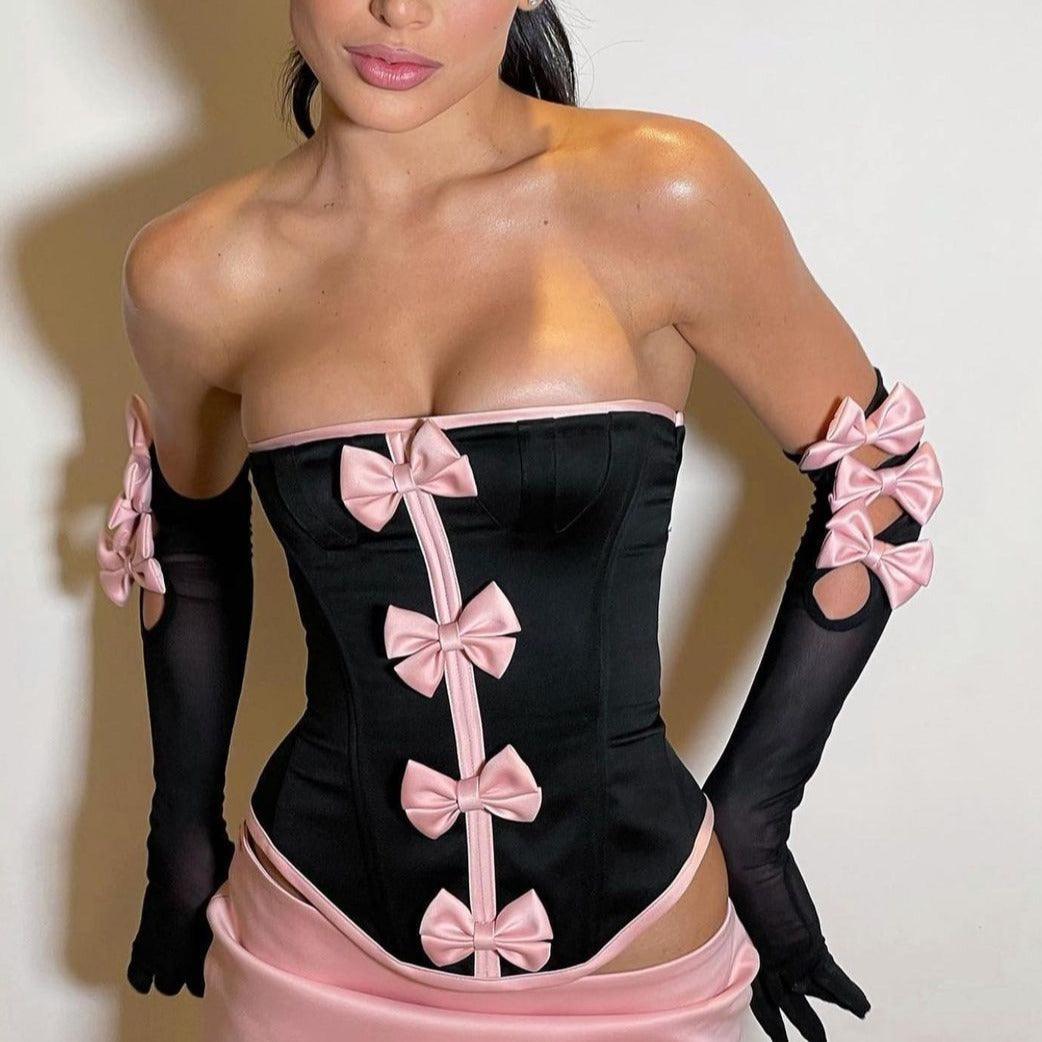 Indulge in luxurious elegance with our Satin Strapless Set in Black. This chic ensemble features a glamorous corset bowknot detail that adds a touch of sophistication to the strapless top. Crafted from premium satin and spandex, this set is designed to enhance your silhouette with a flattering fit and smooth, comfortable feel. Whether youre attending a special occasion or a stylish event, the Satin Strapless Set is the perfect choice to make a statement. Elevate your wardrobe with this versatile, high-quality set and shine bright at every gathering. Explore more fashion inspiration on Instagram @mermaid_way. MATERIAL: Satin, Spandex If you need a different size, we offer hassle-free exchanges.