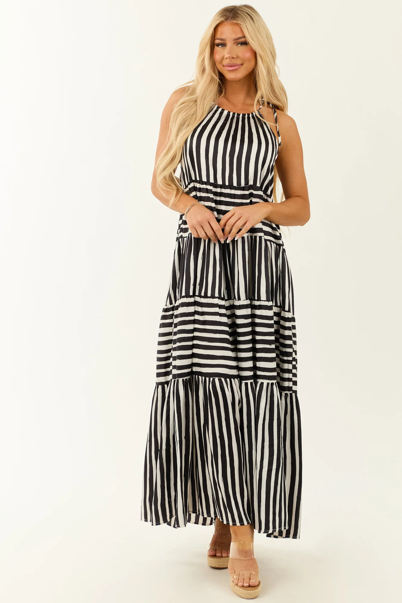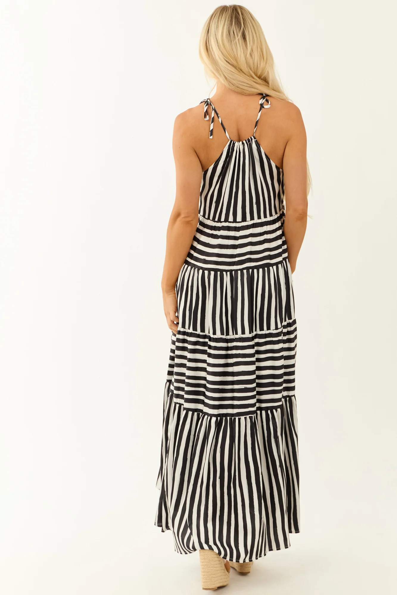 Unleash bold style with our striped satin flowy maxi dress! This loose-fitting dress features a round neckline, adjustable tie straps, tiered skirt, and wide arm holes. Crafted from 100% Polyester with a 96% Polyester, 4% Spandex lining, it offers a comfortable yet chic look. Ideal for spring and summer, this dress is versatile for any occasion. Each piece is unique due to the cutting and sewing process. Model is 57″ tall, wearing size Small.
