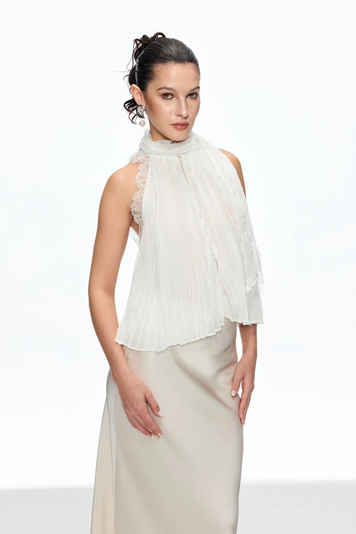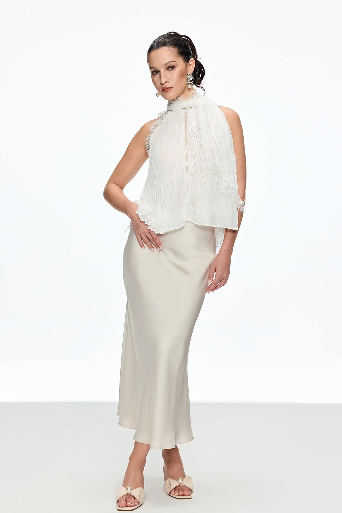 Elevate your wardrobe with the Satin White Sleeveless Skirt Set adorned with subtle pearl accents. This set features a sleeveless top paired with a coordinating skirt, both crafted with attention to detail for a refined and polished look. Suitable for professional settings and elegant occasions, the lightweight fabric ensures comfort and ease of movement. Perfect for those who appreciate timeless style with a modern edge. *Note: Skirt and top sold separately.