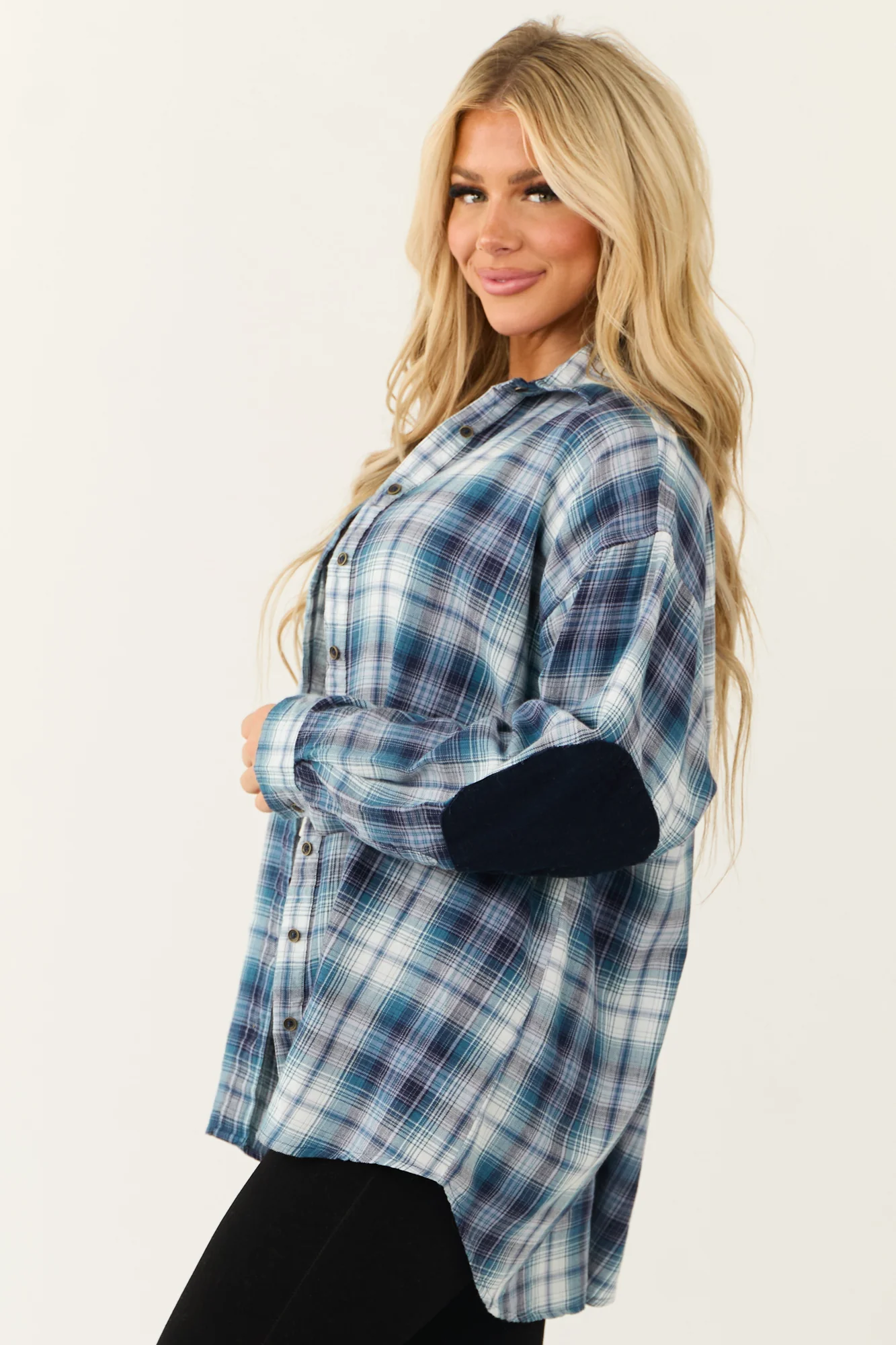 This premium Sea Blue plaid top is a versatile addition to your wardrobe. Made of 100% cotton, it features navy elbow patches, button cuffs, and a high-low hem for a fashionable look. Perfect for any occasion, pair it with your favorite bottoms for a trendy outfit. Hand wash cold for optimal care.