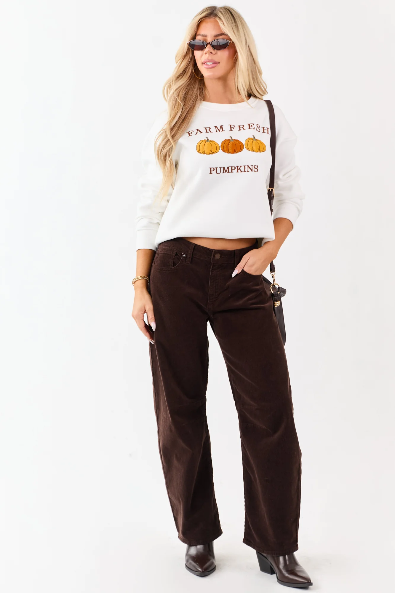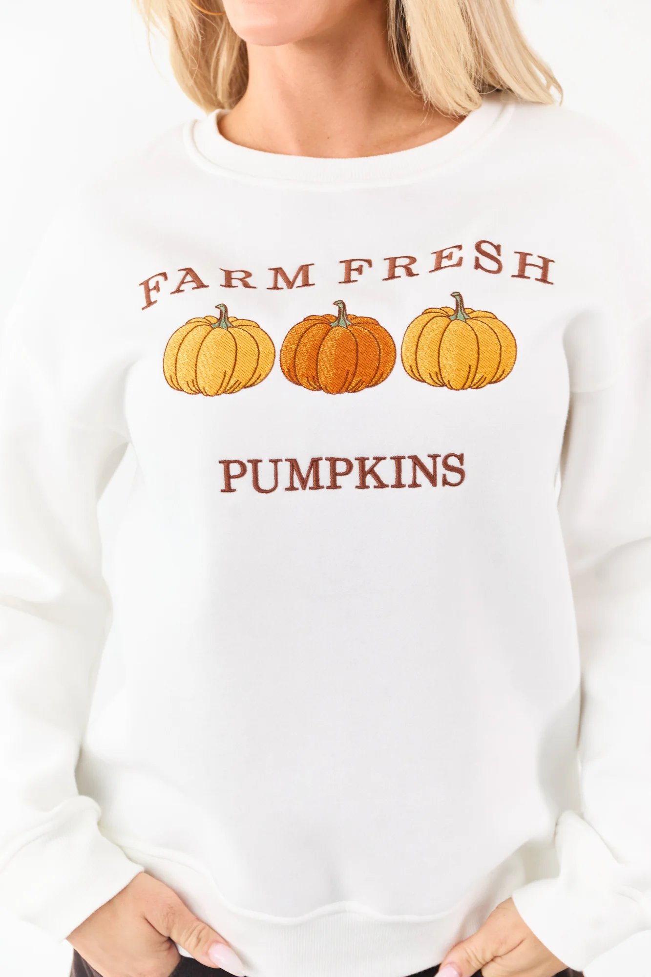 Celebrate the fall season in comfort with thisFarm Freshpumpkin graphic sweatshirt in shades of Sepia, Jade, Marigold, and Tawny. This relaxed fit sweatshirt features a drop shoulder design, ribbed trim, and is made of a semi-stretchy knit blend of 50% polyester and 50% cotton. Available in sizes S, M, and L, with bust measurements of 40, 43, and 46respectively. The length ranges from 26to 28, while the sleeve length is between 24and 26. Imported. Model is wearing a size Small. Model’s Profile: Size 3, Height 57, Bust 35, Waist 26.