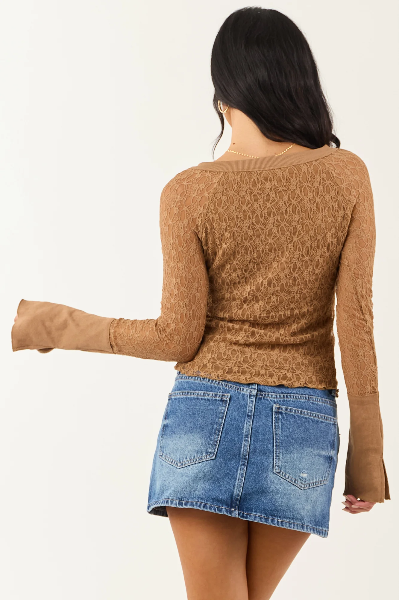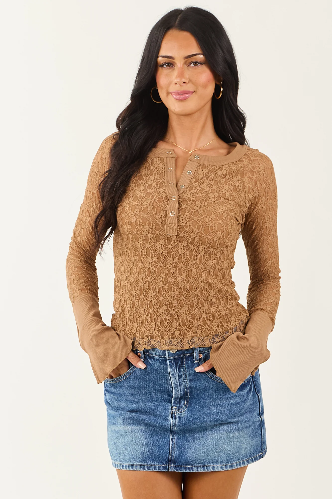 Embrace delicate charm with our sepia lace mesh top featuring banded cuffs for a modern romantic touch. Made of 90% Nylon and 10% Spandex with sheer sleeves, snap buttons, and a torso lining of 96% Polyester and 4% Spandex. This top exudes elegance effortlessly. Available in sizes S, M, and L.