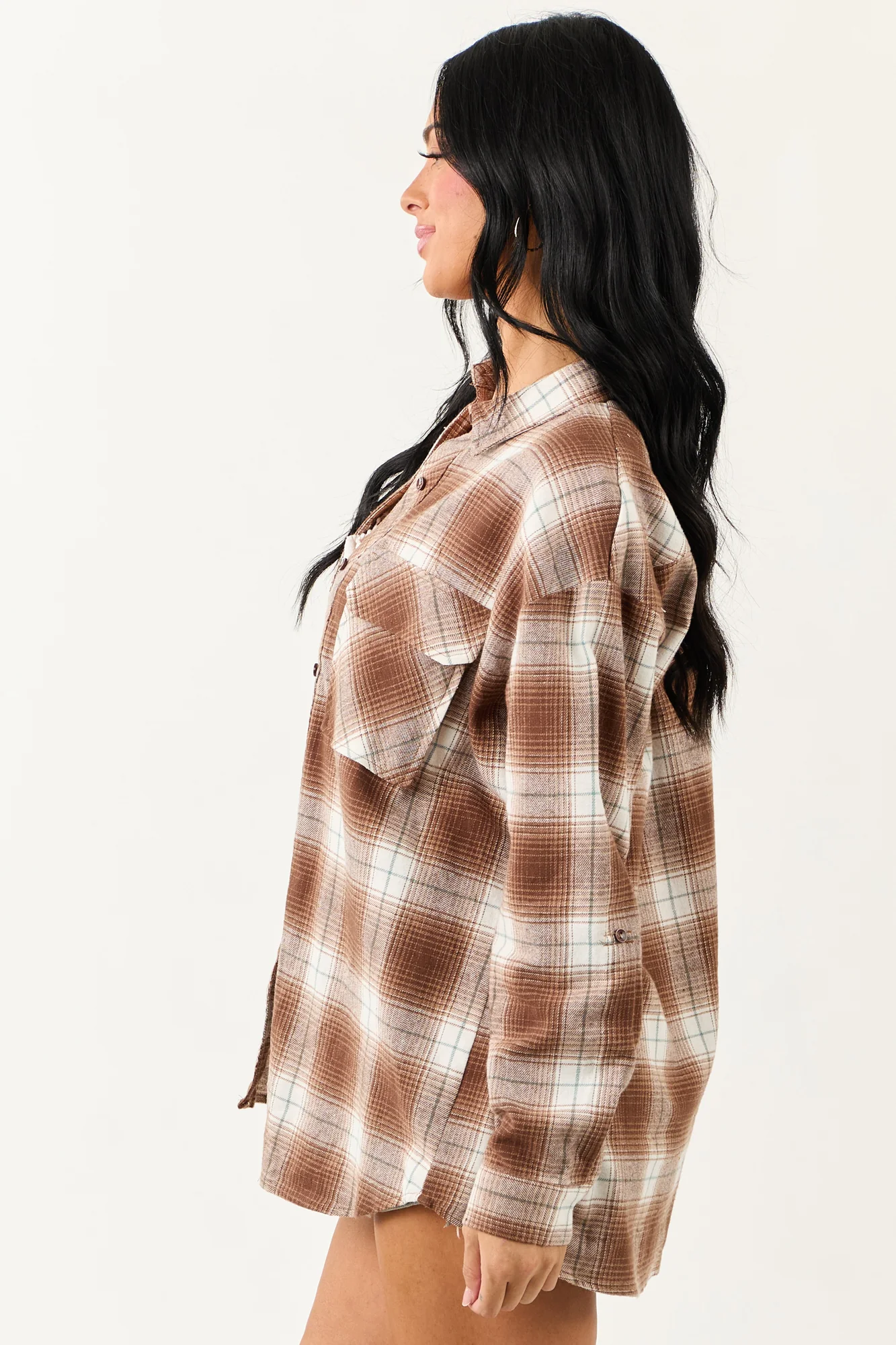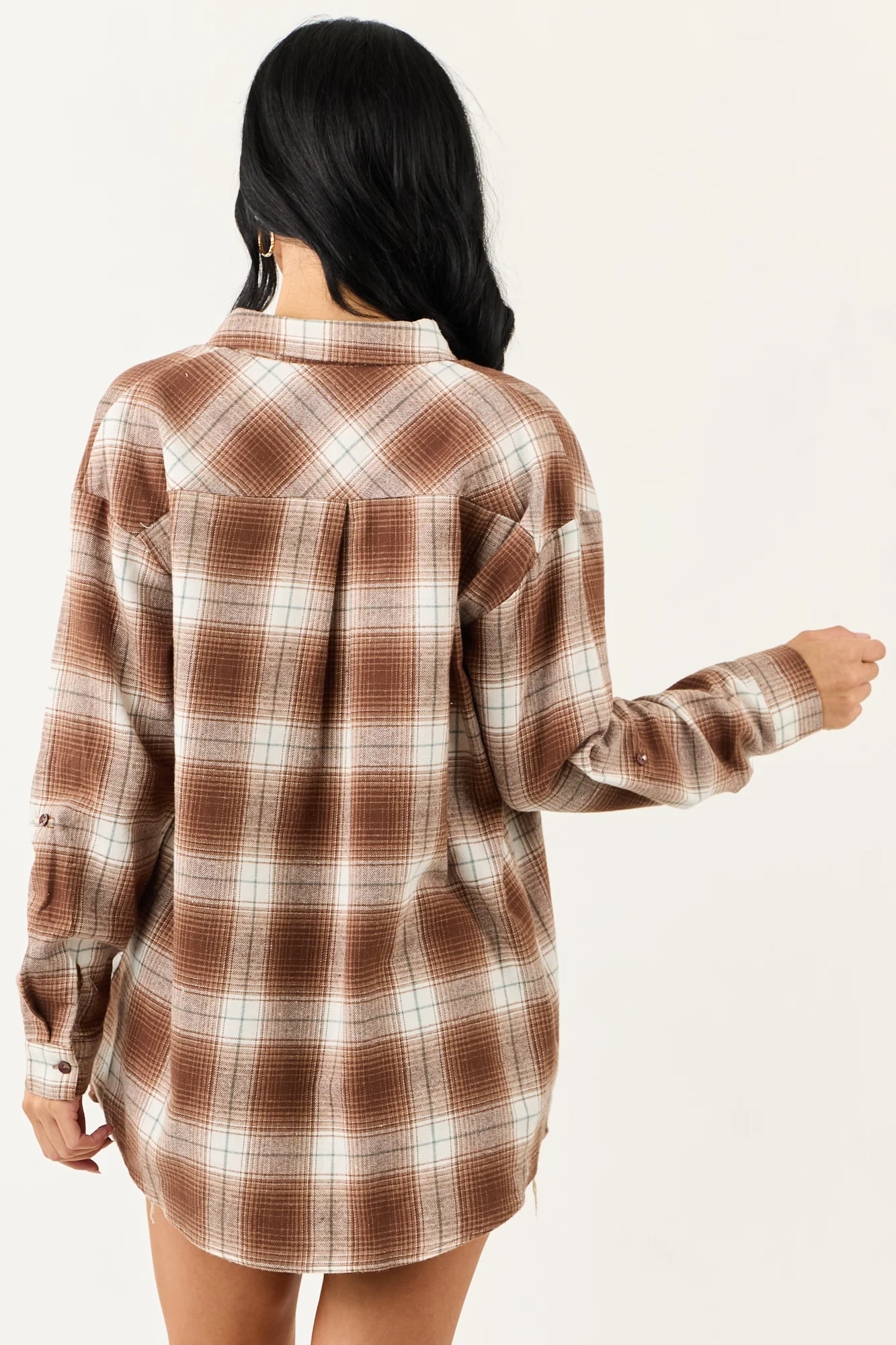Indulge in the cozy comfort of our sepia plaid flannel top. This cotton top features an oversized fit, collared neckline, and optional rolled cuffs for a relaxed yet stylish look. Perfect for layering or wearing on its own, this non-stretchy lightweight top comes in soothing shades of Ivory, Latte, Light Chestnut, and Juniper. With details like banded button cuffs, chest pockets, and drop shoulder design, this top is sure to elevate your casual style. Crafted from 100% imported cotton, it offers both warmth and breathability. Whether youre dressing up for the day or lounging at home, this versatile top is a must-have staple in your wardrobe. Available in sizes S, M, and L.