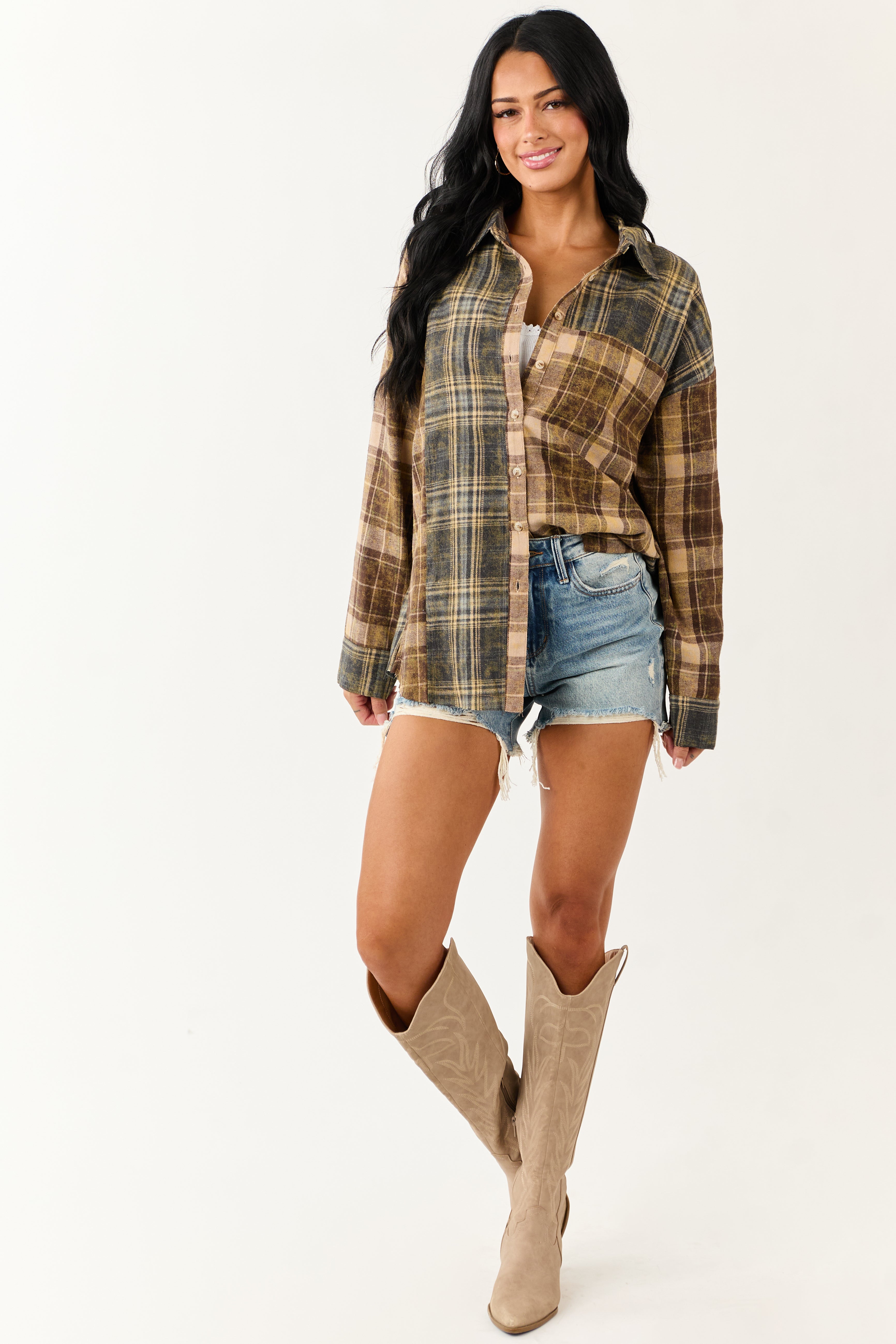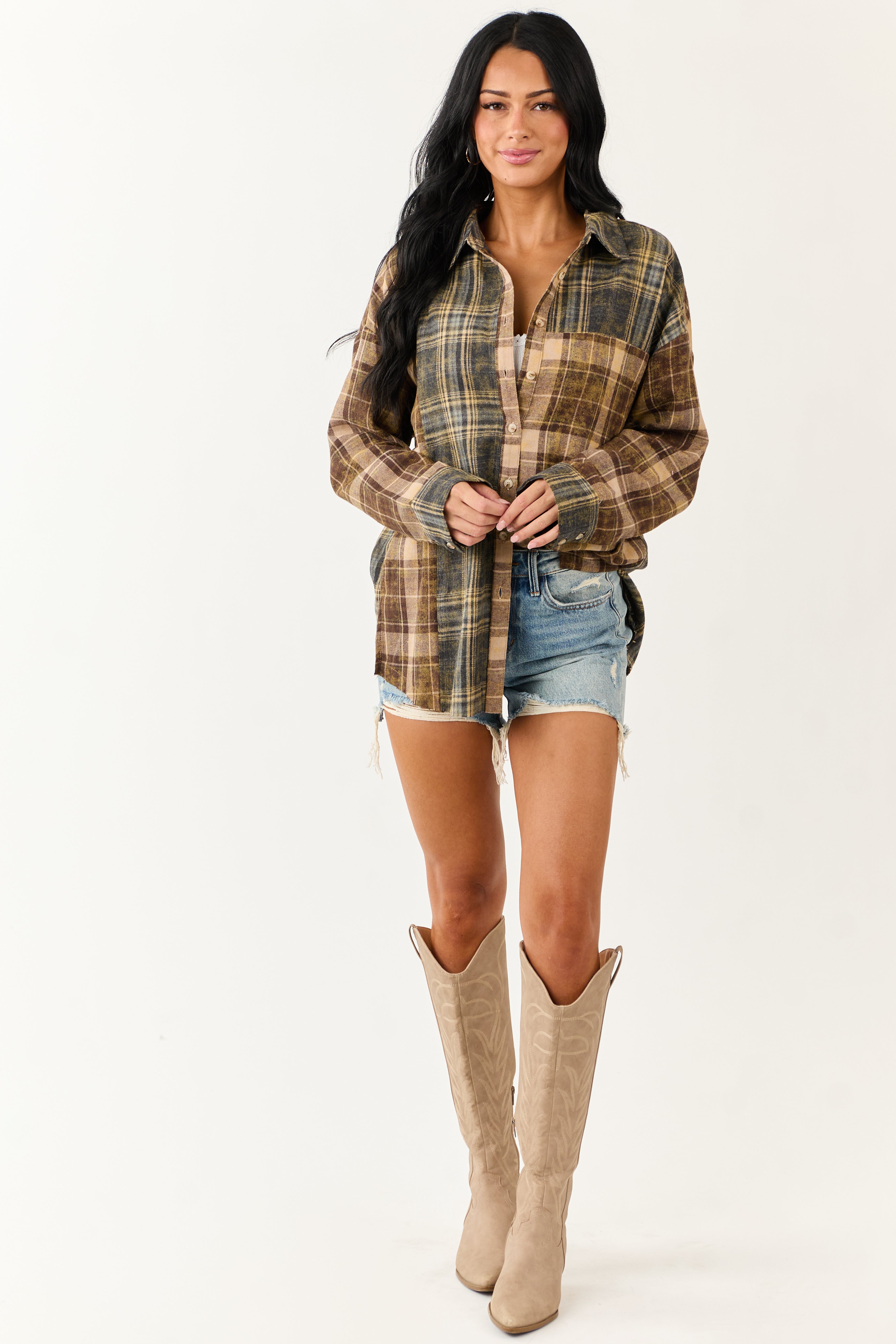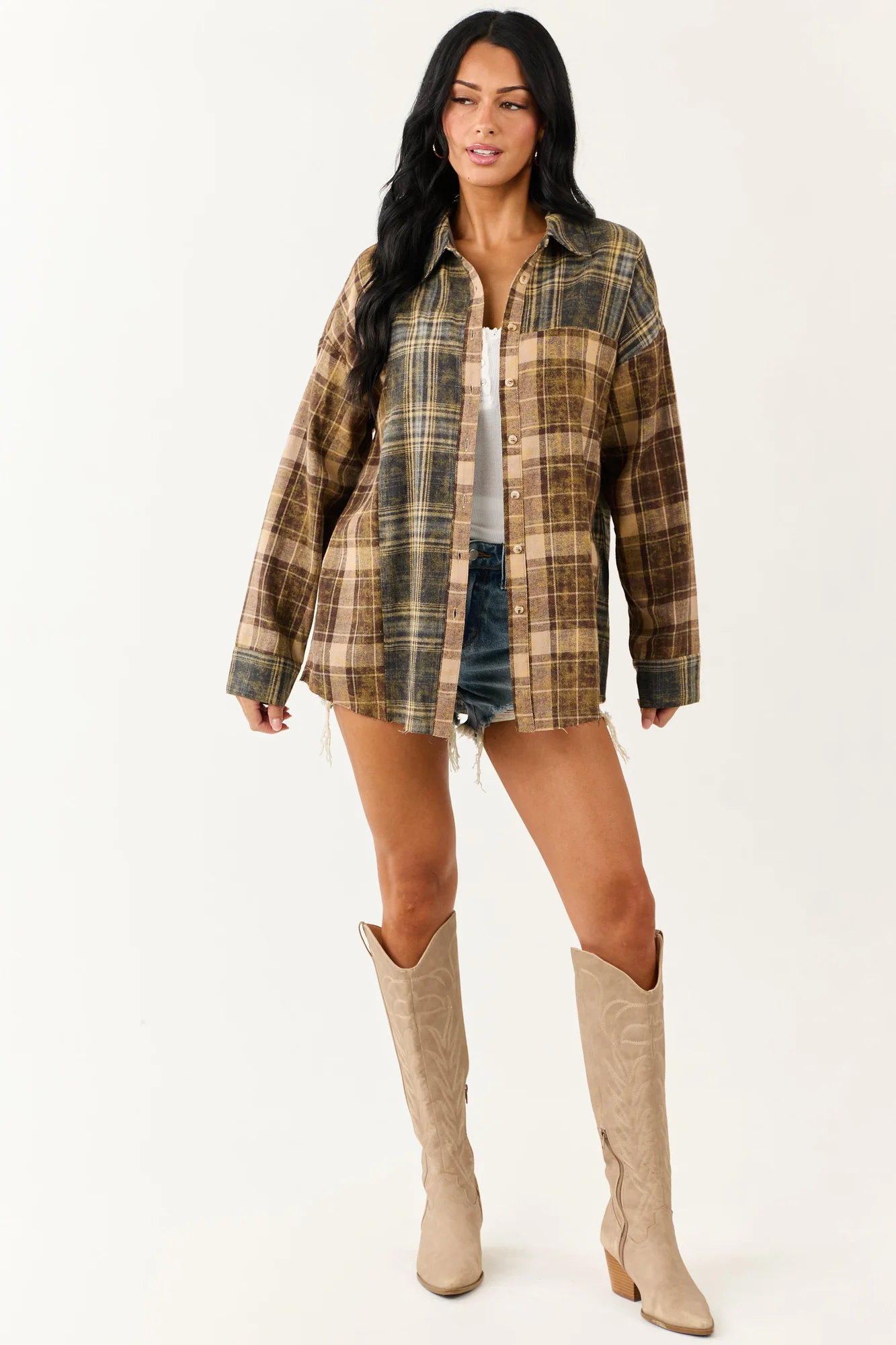 Stay stylish and comfortable with our Sepia Plaid Oversized Flannel Shirt. Crafted from a blend of polyester and cotton, this button-down top features a plaid pattern in Camel, Beige, Faded Navy, and Pistachio. The shirt boasts an oversized fit, banded cuffs, a raw frayed hem, and a collared neckline. Perfect for the fall season. Available in sizes S, M, and L.