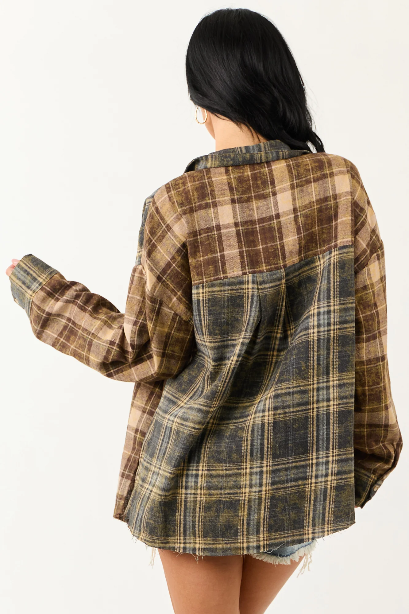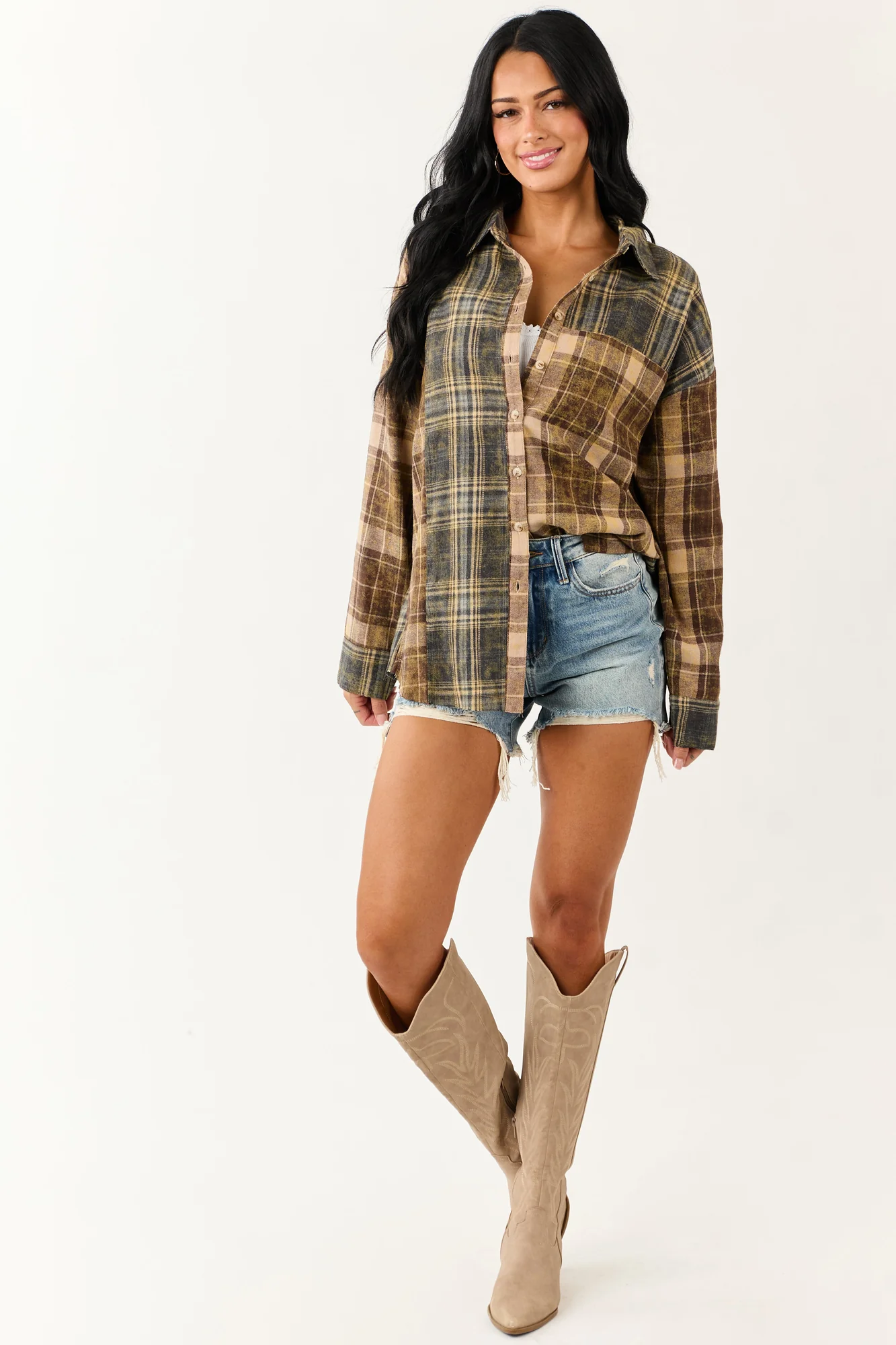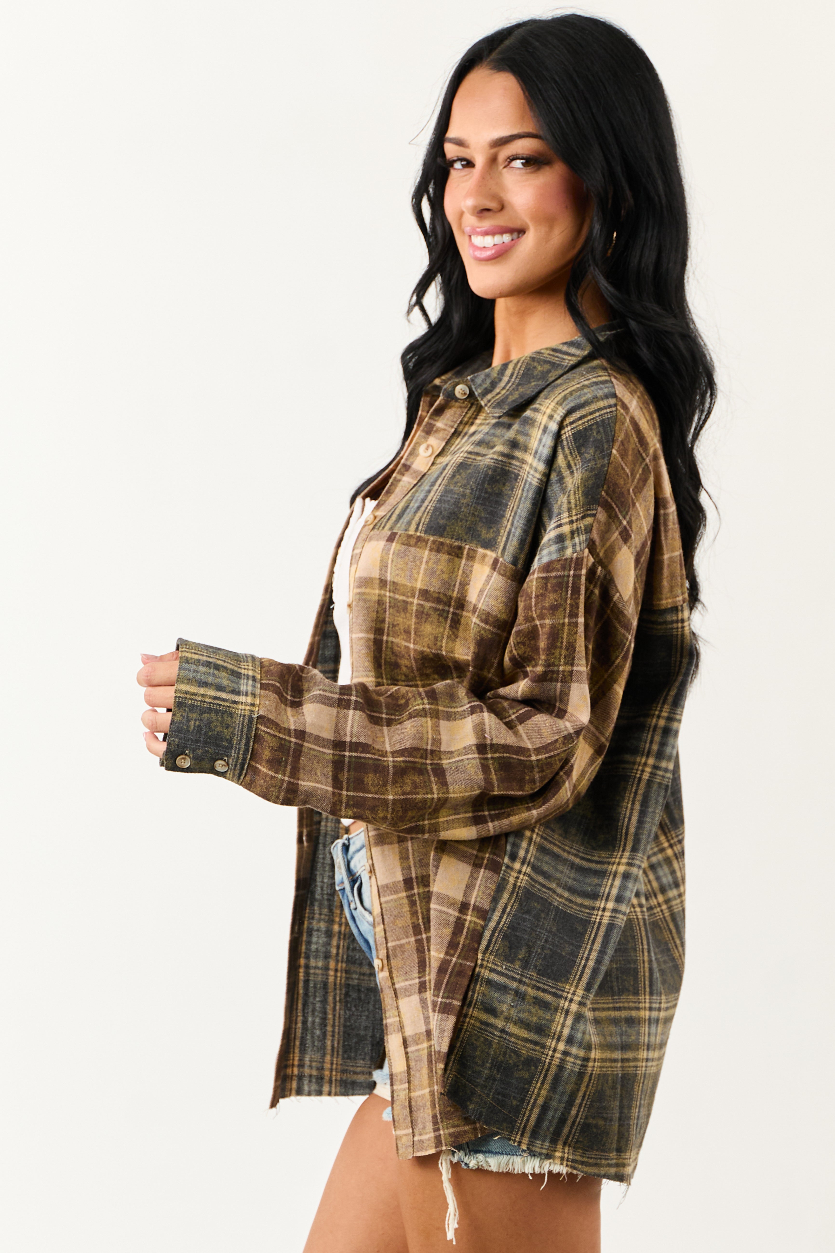 Stay stylish and comfortable with our Sepia Plaid Oversized Flannel Shirt. Crafted from a blend of polyester and cotton, this button-down top features a plaid pattern in Camel, Beige, Faded Navy, and Pistachio. The shirt boasts an oversized fit, banded cuffs, a raw frayed hem, and a collared neckline. Perfect for the fall season. Available in sizes S, M, and L.