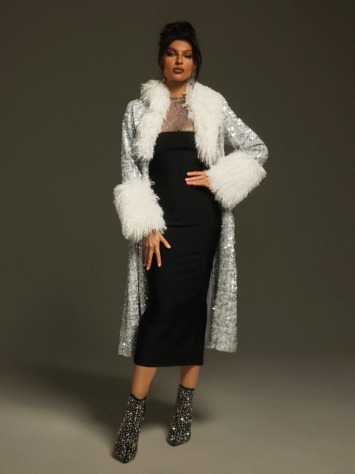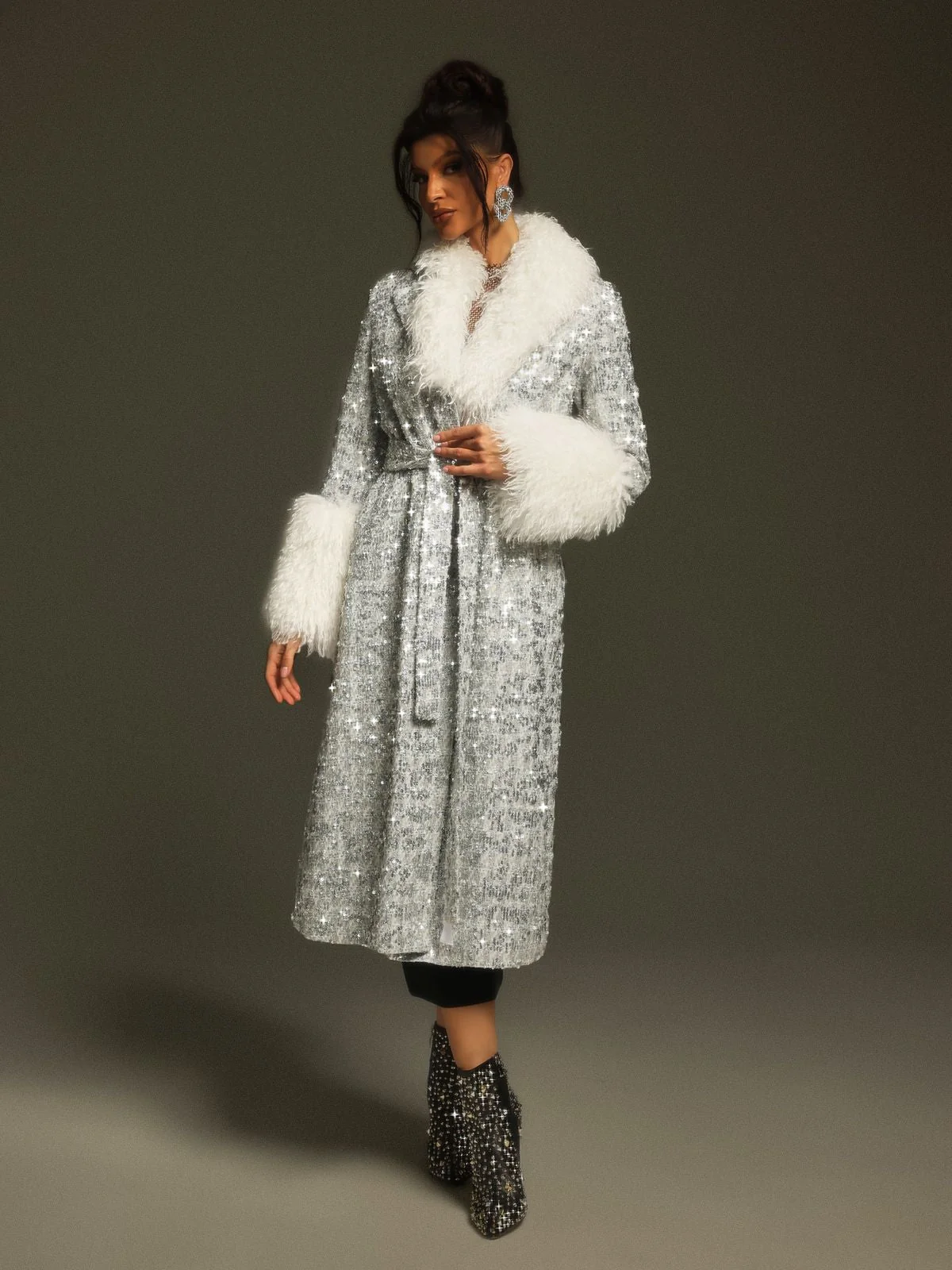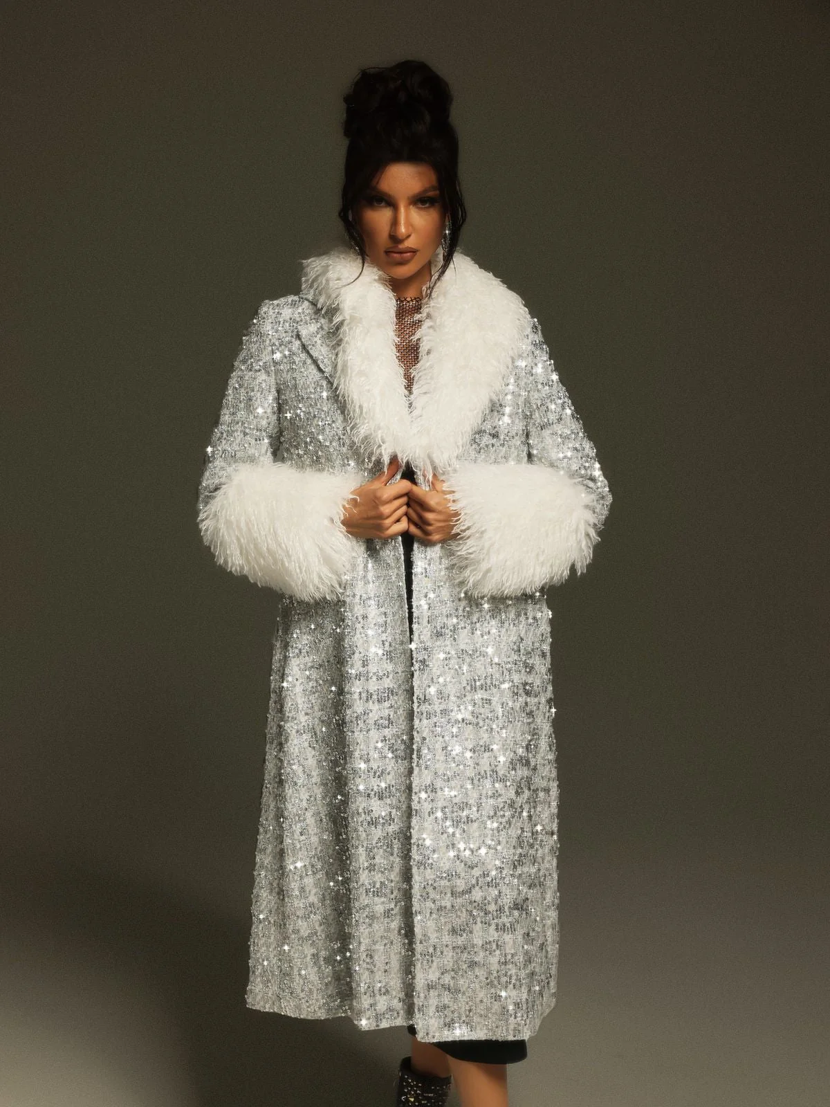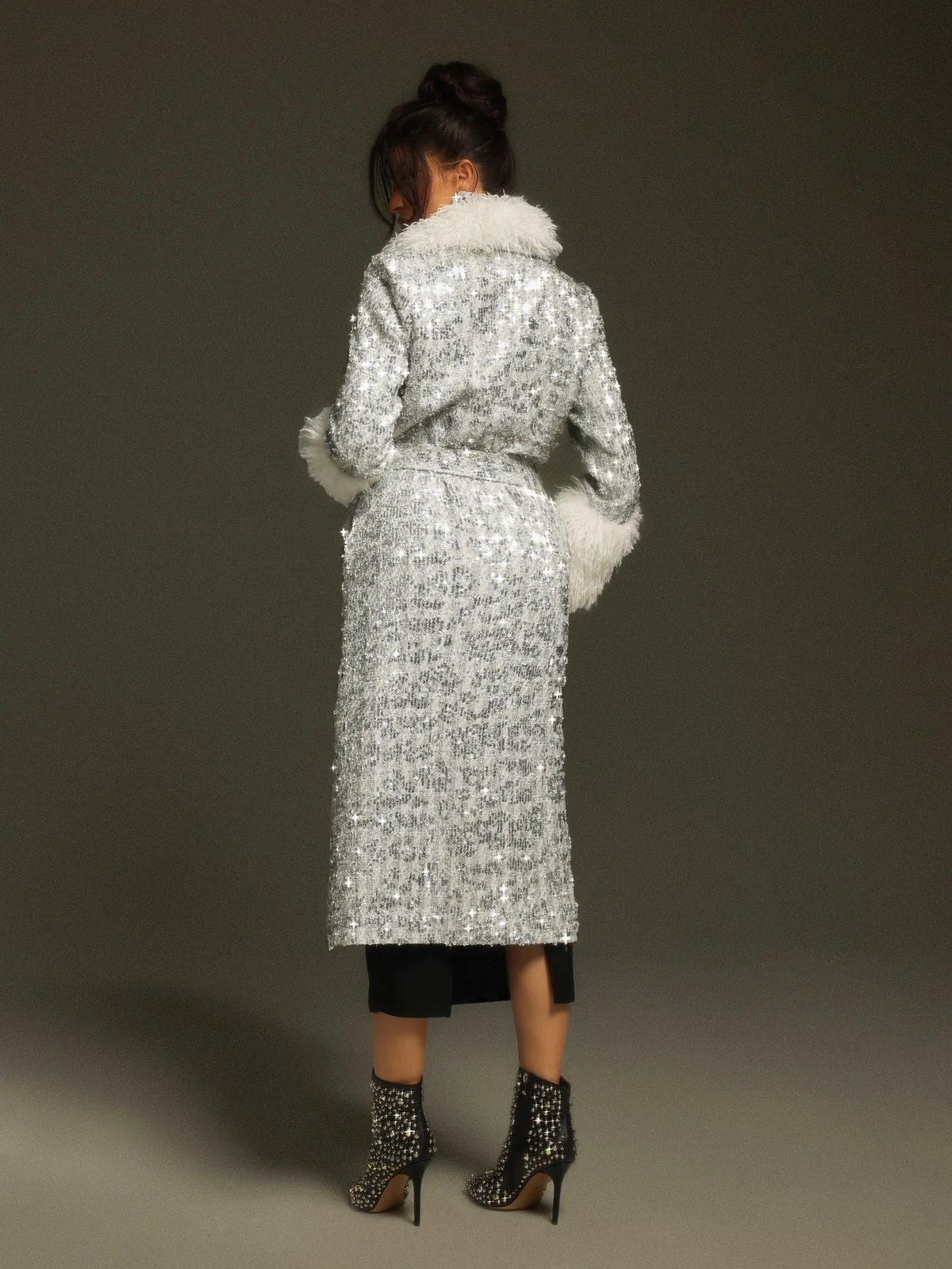 Transform into a stunning flower with the Sequin Collar Faux Fur Coat. Featuring intricate floral embellishments for a touch of elegance and femininity. Stand out at any event in this chic coat thats a must-have for making a bold fashion statement. Crafted from 100% Polyester with a slight stretch for comfort. Dry clean only. Model is wearing size S. Color may vary due to lighting.