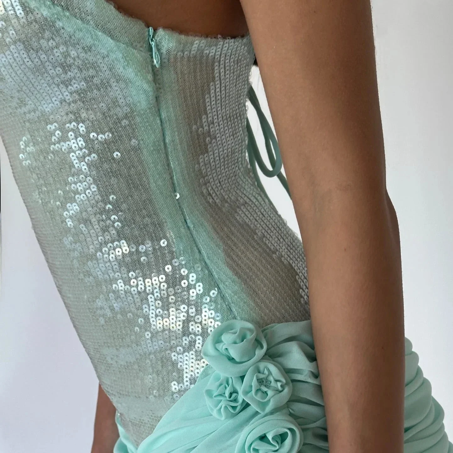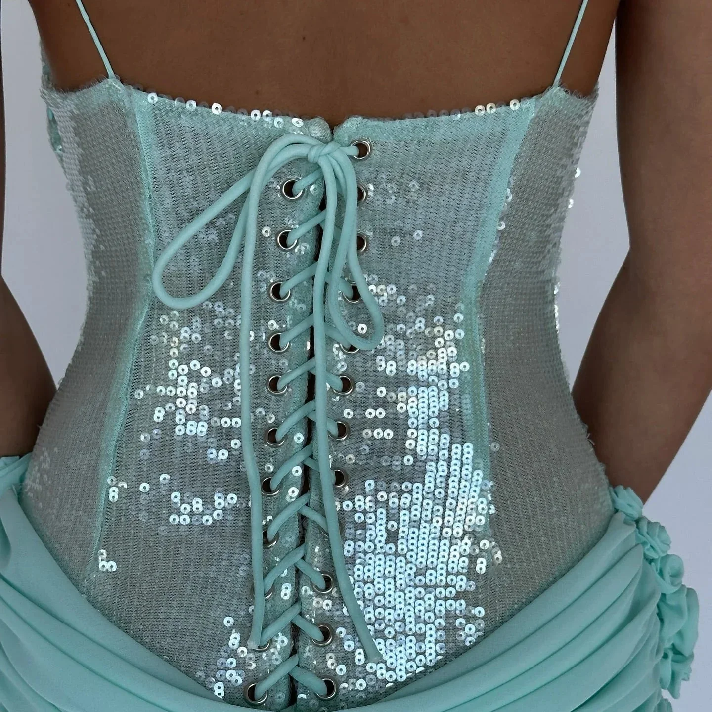 Feel your best in the Sequin Corset Mini Dress Light Green! This stunning dress is a perfect balance of allure and charm. Adorned with shimmering sequins that catch the light at every turn, it showcases dainty spaghetti straps and a corseted bodice that can be adjusted for a personalized silhouette. With a side zipper for a seamless look, the draped mini skirt offers fluidity and elegance. Finished with three hand-sewn rosettes at the hem, this dress exudes a romantic flair that complements its bold sparkle. Whether its a rooftop soirée, a night out, or an occasion to cherish, this dress will be the center of attention. Crafted from exquisite sequin and chiffon fabrics. Discover more fashion inspiration on our Instagram @mermaid_way. Enjoy hassle-free size exchanges if needed.