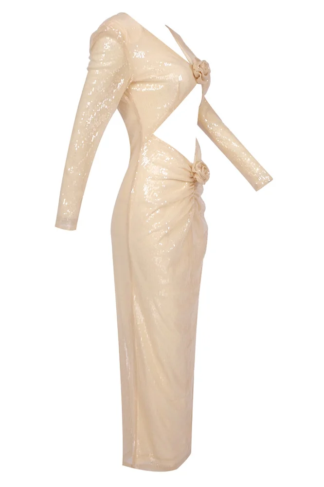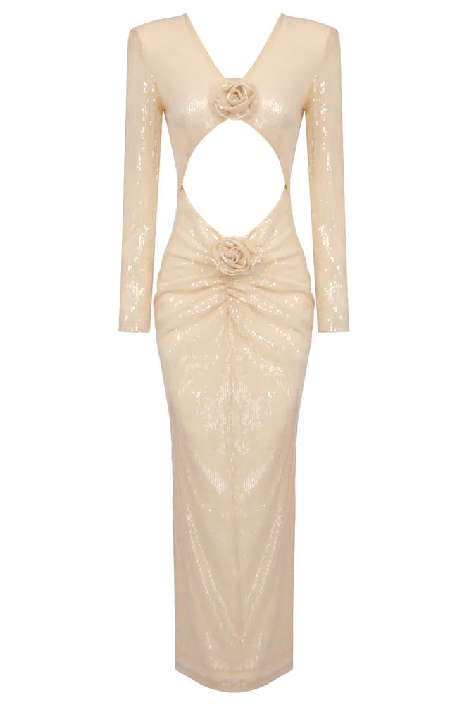 Indulge in sophistication with our Sequin Embellished Floral Midi Dress. Crafted from 100% polyester, this dress features an exquisite front cut-out, embellished rosettes, and sequined fabric for a touch of glamour. The padded shoulders and back slit add a modern edge. Imported from China, this dress is fully lined and comes with a hidden back zipper closure. Please note that the color may vary slightly due to lighting effects. Refer to our size chart for the perfect fit – true to its size. Elevate your evening look effortlessly!