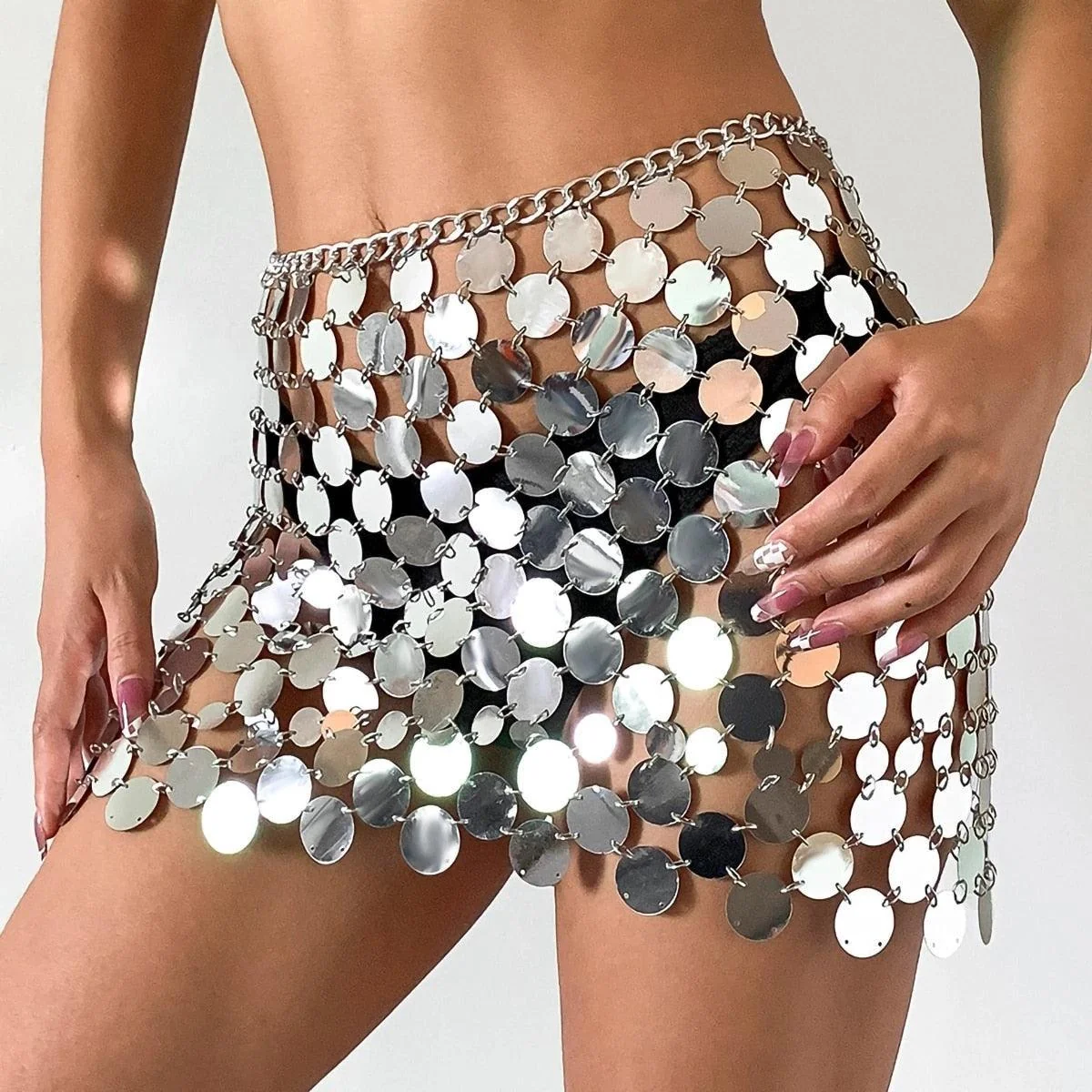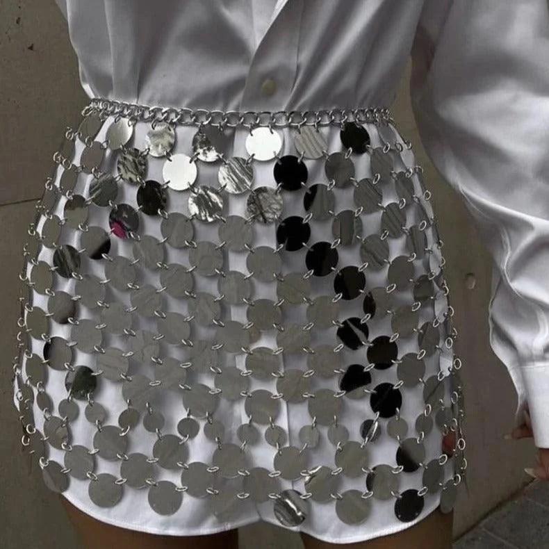 Elevate your party look with this dazzling Sequin Embellished Mini Skirt in silver. Sparkling with intricate sequin detailing that catches the light beautifully, this mid-rise skirt offers a playful yet elegant style. Made from a mix of pastel and metallic materials, the comfortable fit ensures you can dance the night away in style. For more outfit ideas, visit our Instagram @mermaid_way. Enjoy a complimentary size exchange if needed.