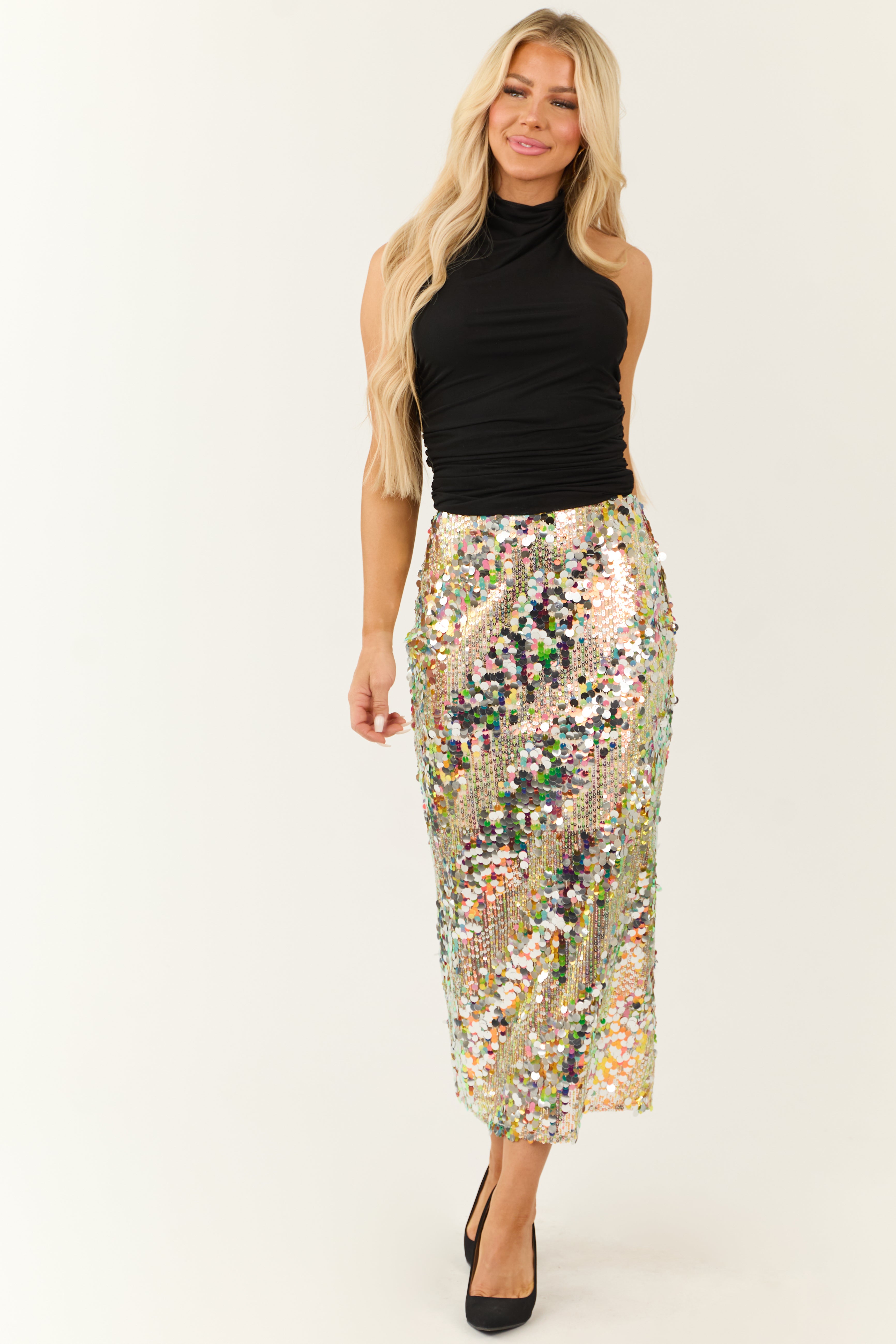 Indulge in luxury with our Sequin Embellished Pencil Skirt. This exquisite skirt features a stunning mix of Silver, Punch, Teal, Lime, Amber, and Lemon sequins adorning a non-stretchy woven fabric. The skirt comes in small and large sequins, a back slit for ease of movement, and a back zipper with hook and eye closure. Crafted with 100% Polyester, this elegant piece is fully lined for a comfortable fit. Perfect for special occasions. Available in sizes S, M, and L. Note: Dry clean only.