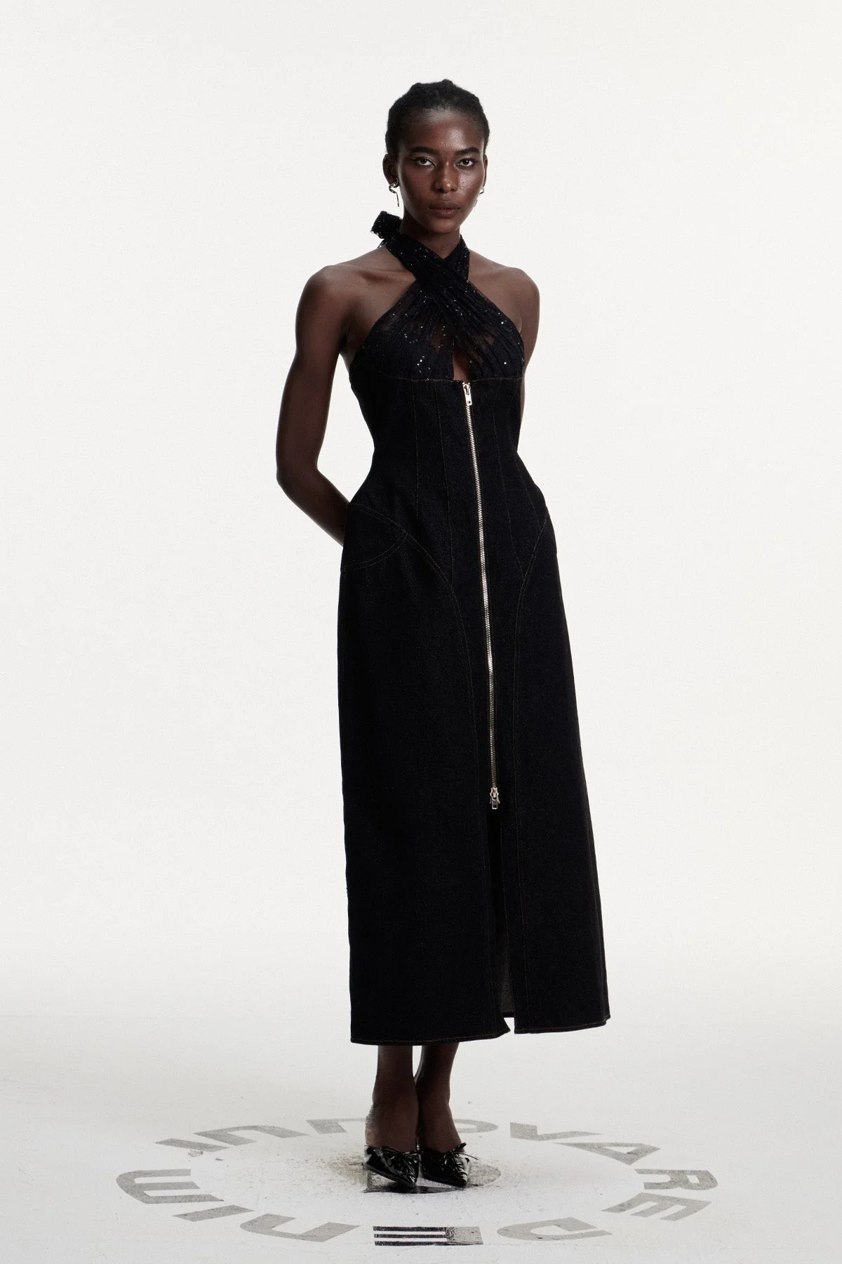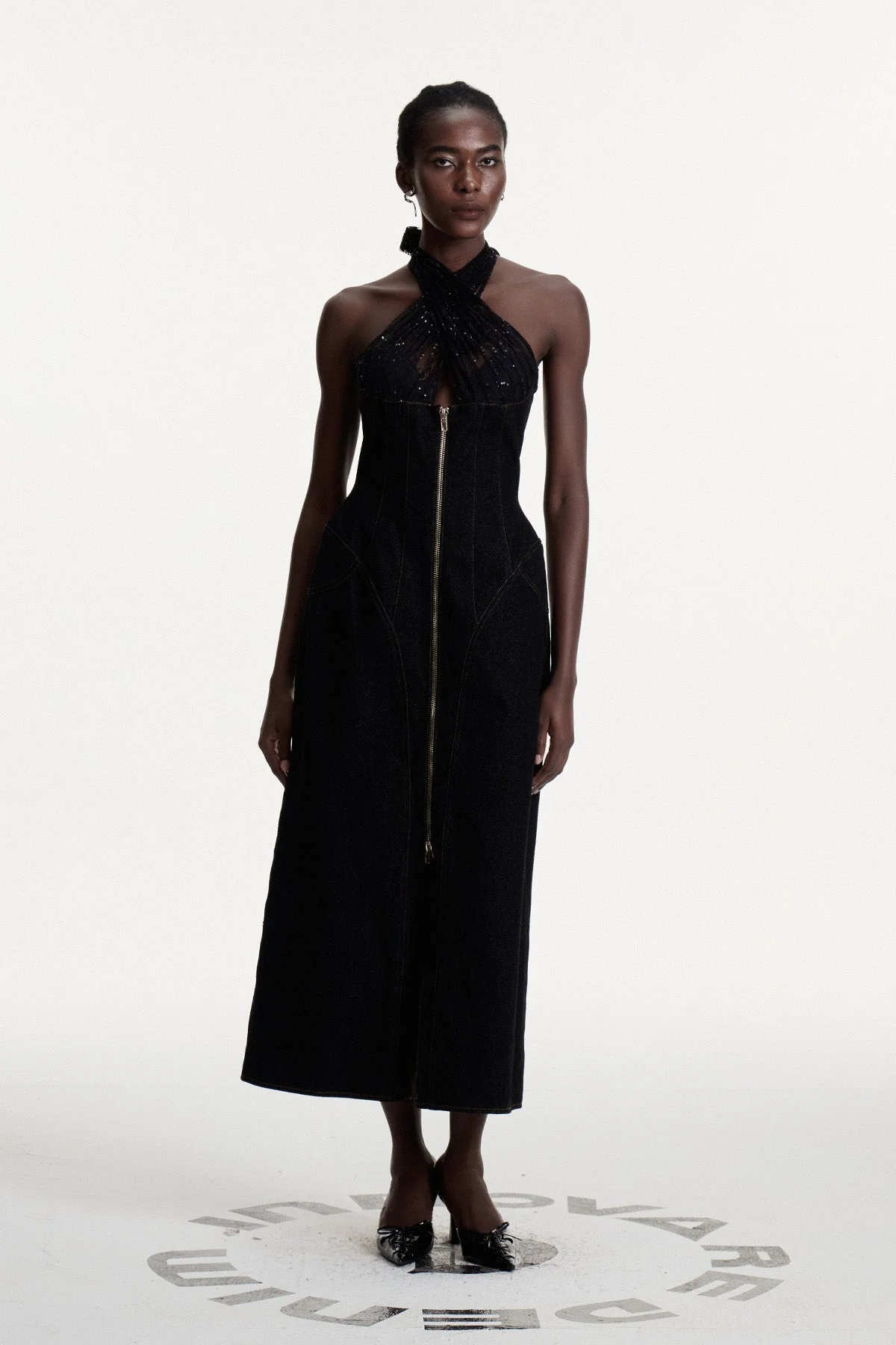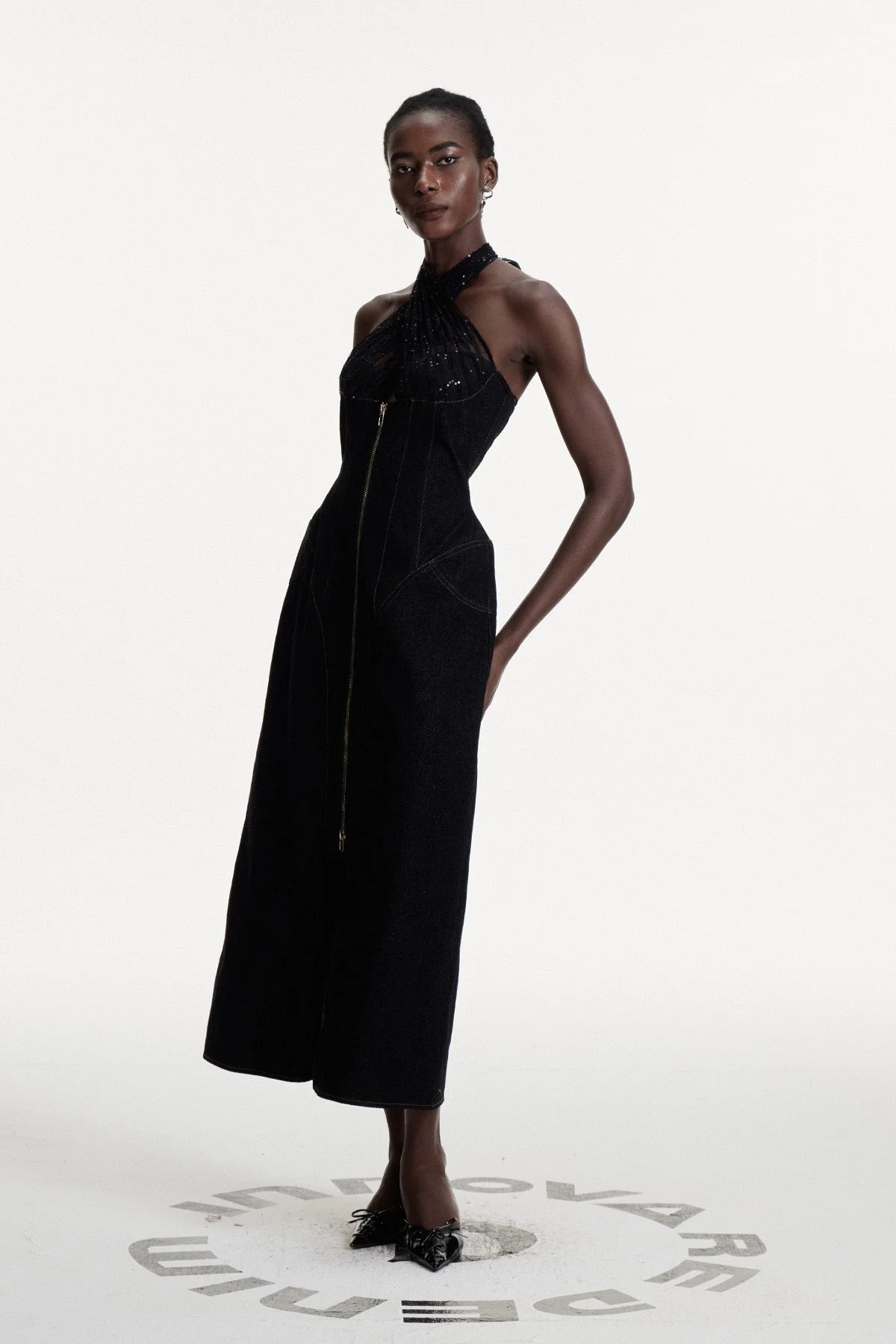 Elevate your evening attire with this Sequin Halter Neck Denim Maxi Dress in Black. Experience the casual charm of denim fused with upscale glamour through intricate sequin embellishments. The halter neck design creates a stunning neckline and silhouette, while the maxi length exudes grace and elongates your figure. Perfect for sophisticated events that demand a unique yet refined appearance. Combining comfort and style effortlessly, this dress is a standout piece in any fashion-forward wardrobe. Stretch Factor: Non-Stretch; Care: Gentle machine wash; *Color may vary slightly due to differences in lighting during photography.