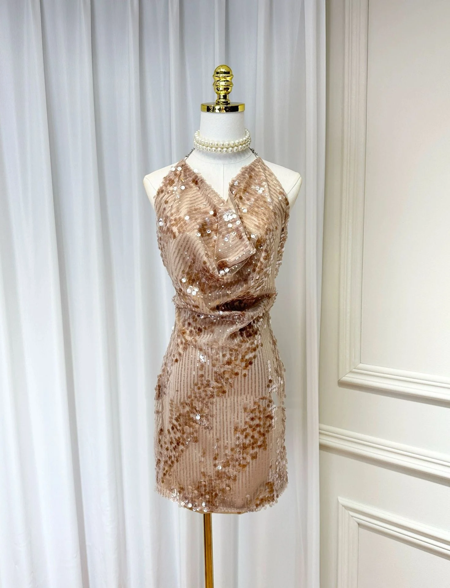 Elevate your evening look with our Sequin Halter Sleeveless Mini Dress in Khaki Brown. This chic and trendy dress features a halter neckline and sleeveless design for a glamorous yet comfortable fit. Perfect for a night out, the sequin detailing adds a touch of sophistication. Made with high-quality materials, this dress exudes both style and luxury. Model Stats: Height – 68.9”/175 cm, Bust – 36.6”/93cm, Hips – 36.6”/93 cm, Waist – 25.5”/65 cm. Please check our size chart for the perfect fit.