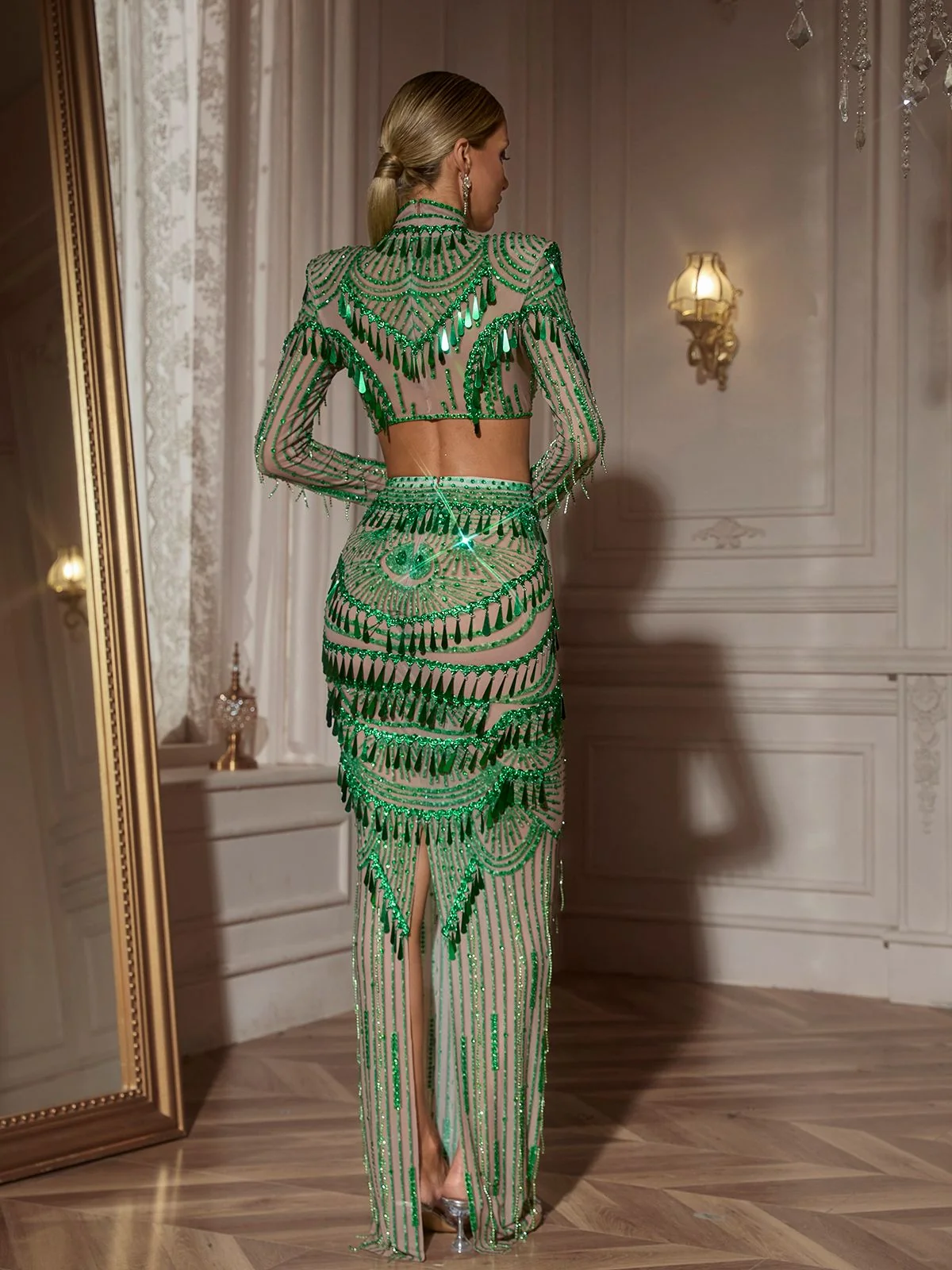 Indulge in elegance and radiance with our Sequin Long Sleeve Skirt Set. This exquisite set showcases a dazzling sequin skirt and long sleeves, creating an alluring ensemble for any special event. Crafted from 100% Polyester with a slight stretch, it offers comfort and style. Adorned with rhinestones, this set is perfect for those seeking a glamorous look. Available in multiple sizes (XS- XL). Dry clean only. *Model in image is wearing size S.