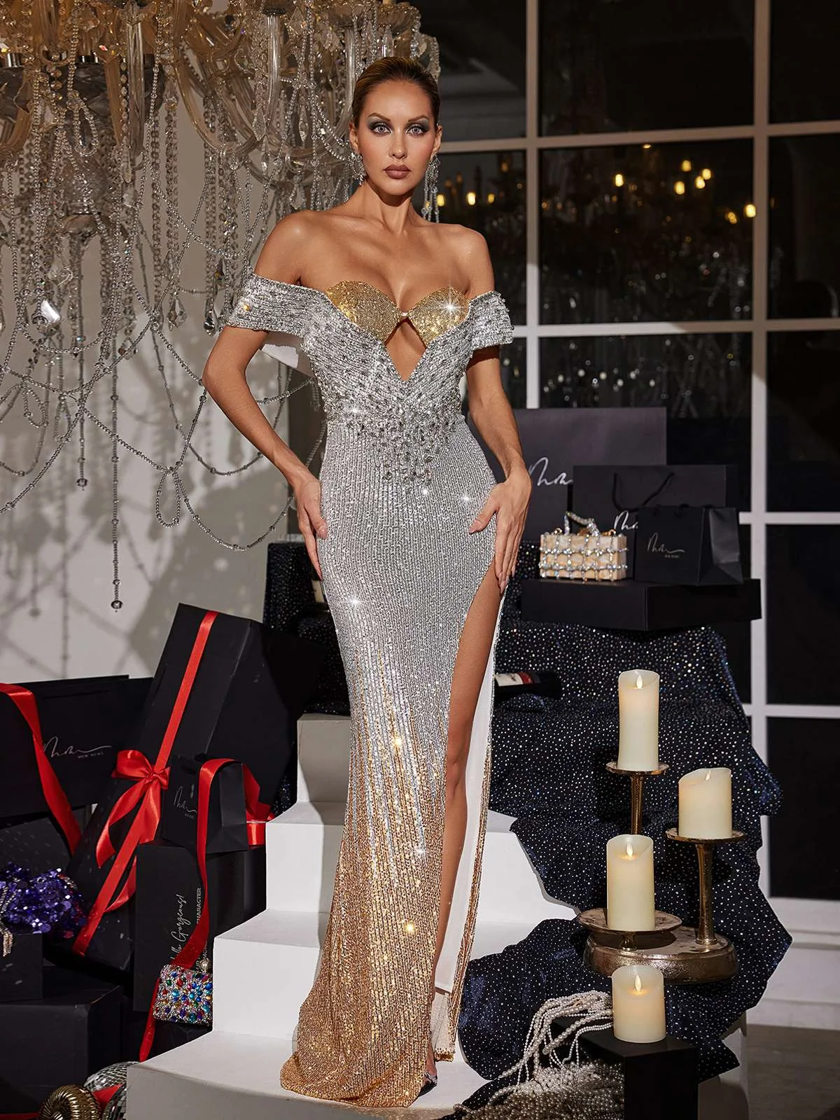 Make a statement with our Sequin Maxi Dress featuring a stunning sequin design, off-shoulder, and cutout details. Perfect for formal events, this dress exudes allure and sophistication. The maxi length adds elegance, ensuring you turn heads wherever you go. Crafted from 100% Polyester with slight stretch for comfort. Invisible zipper closure at the back. Dry clean only. Model is wearing a size S. Sparkle, shine, and stand out with this show-stopping piece.