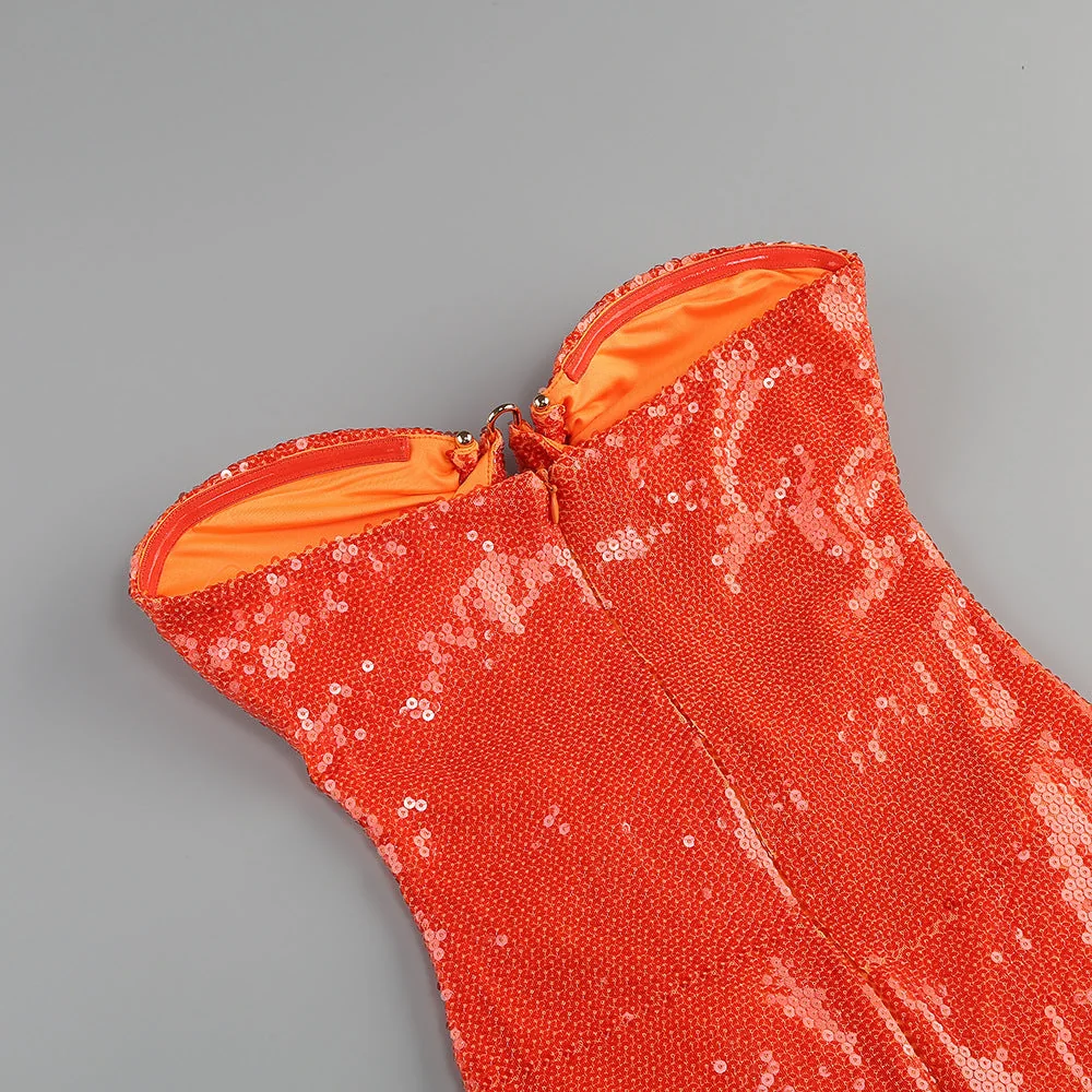 Elevate your style with our Sequin Strapless Midi Dress. The gold hardware cut-out detail adds a touch of edge, making you stand out in any crowd. This unique and bold piece is perfect for adventurers looking to make a statement. With sequin embellishments and a concealed zip fastening, this dress is a must-have. Please note, color may vary due to lighting on images. Refer to our size chart for the best fit.