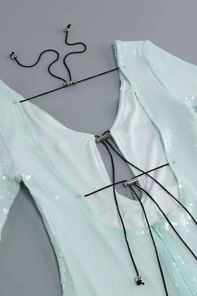 The Sequin Teal Maxi Dress is a stunning piece featuring a keyhole cutout neckline with a drawstring closure, crafted from 100% Polyester with a slight stretch for comfort. Designed for easy wear with its pull-on style, this glamorous dress is perfect for special occasions. Stun in Cambridge Blue, available in XS, S, M, and L sizes. Hand wash cold for care instructions. Please note that color may vary in different lighting conditions. Get ready to shine brightly in this Sequin Teal Maxi Dress from Night Novas!