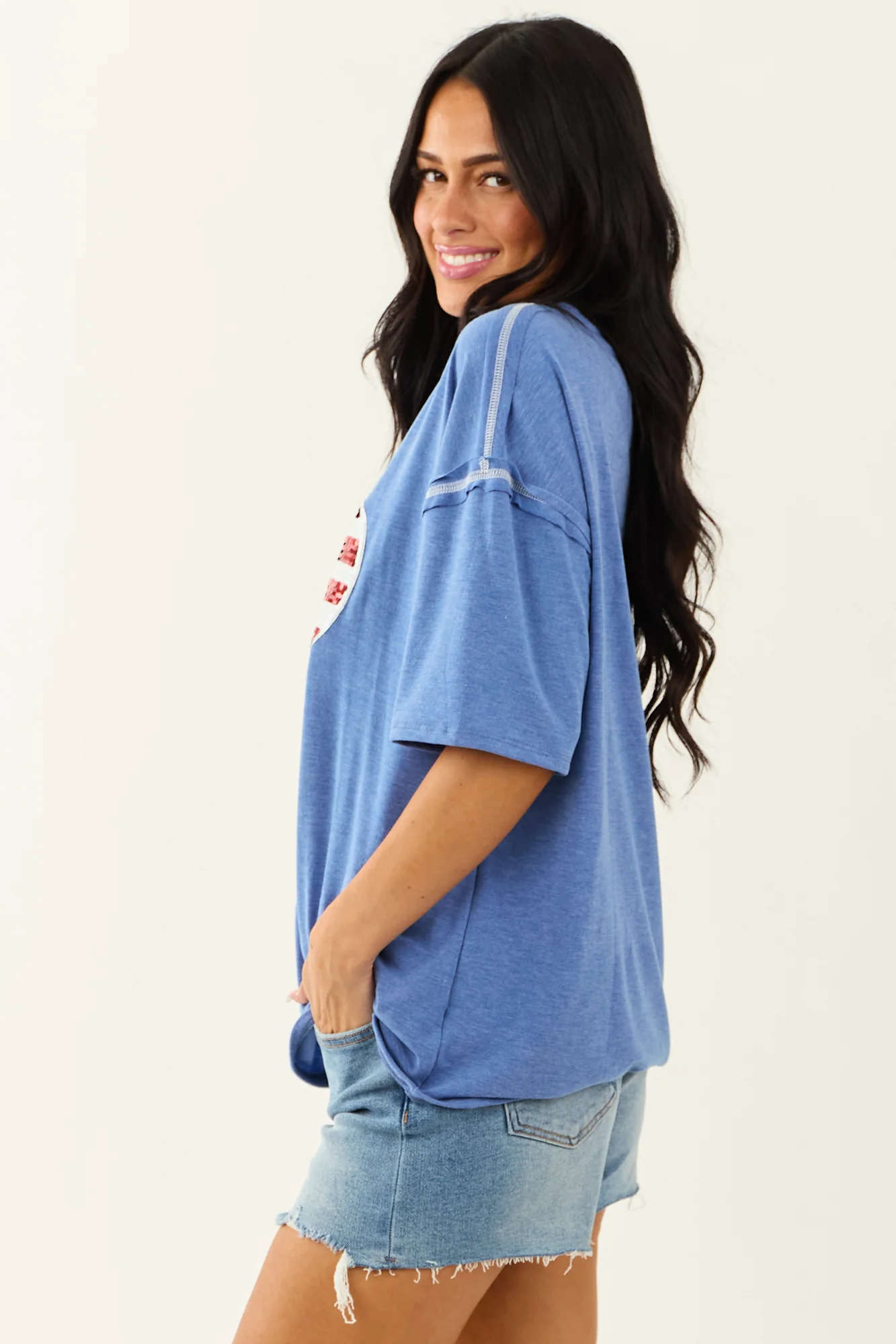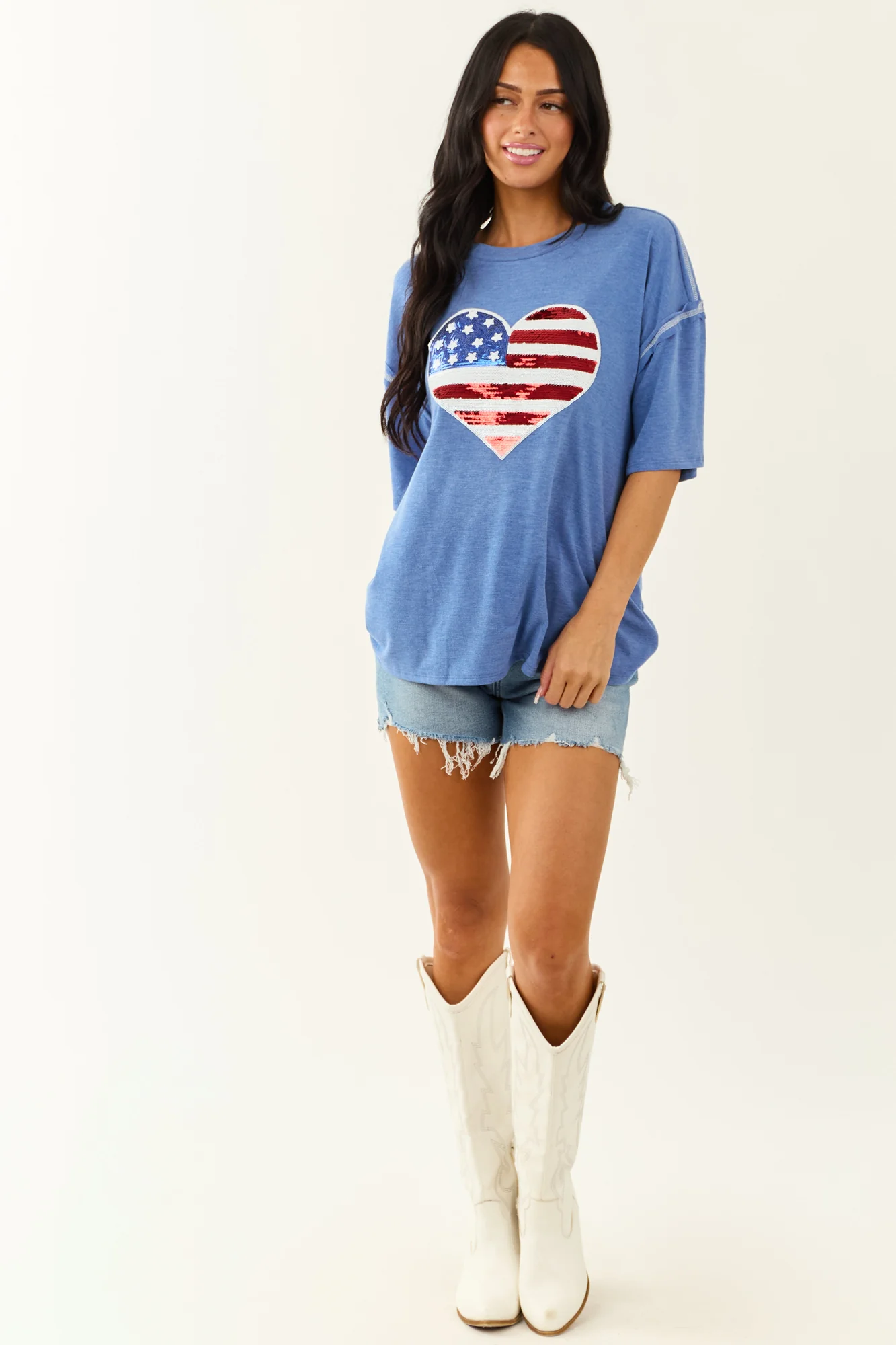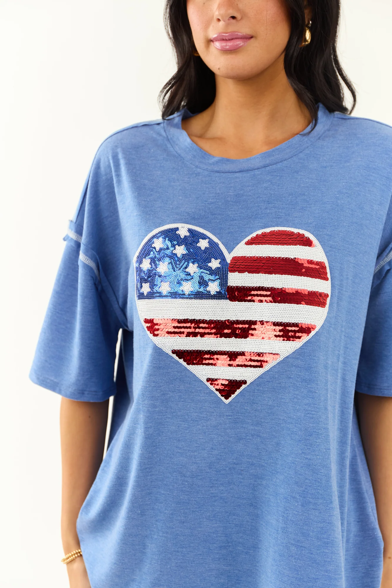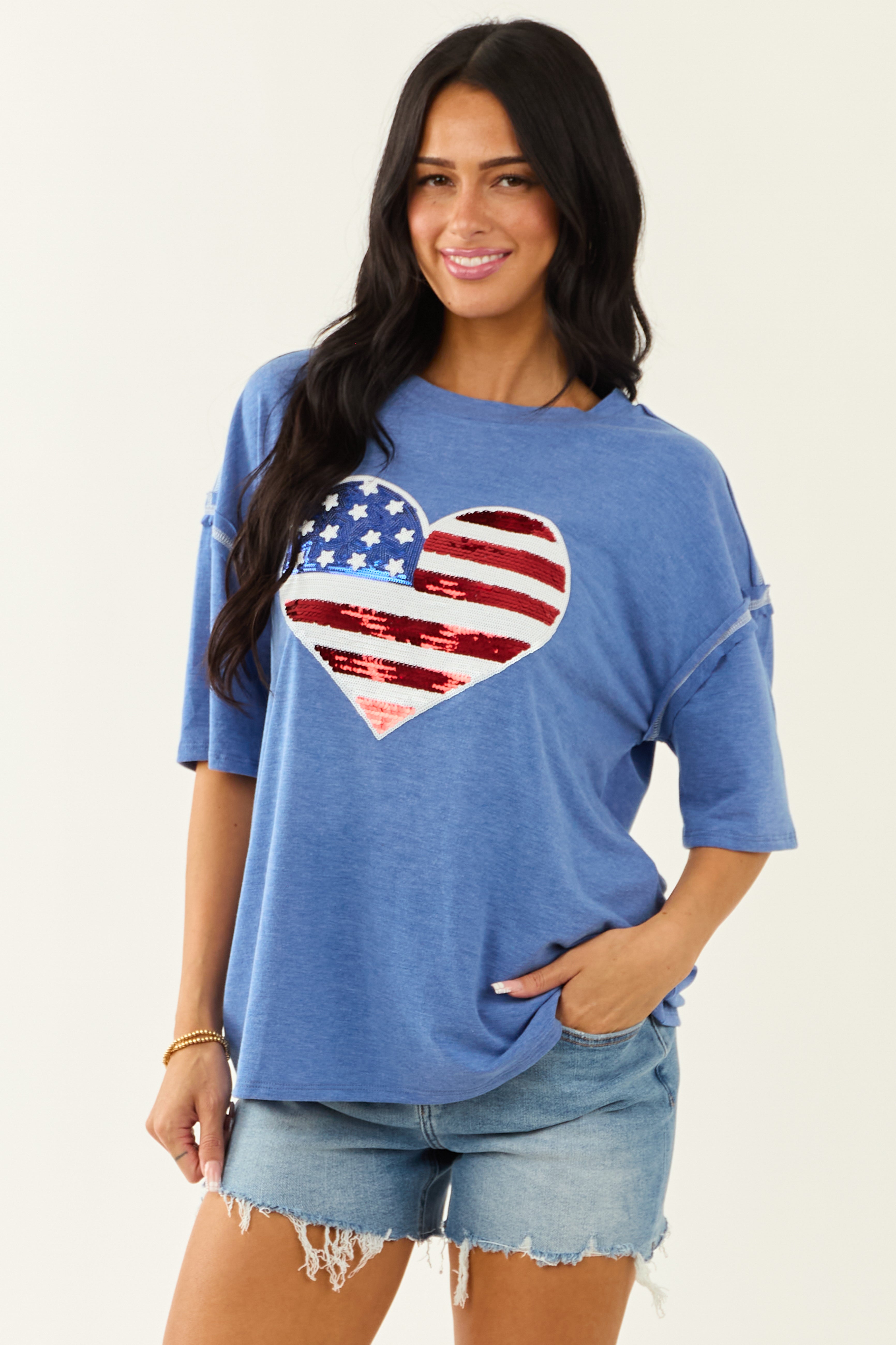 Make a bold star-spangled statement with our Dusty Blue Sequined Heart Flag Knit Top. This top offers an oversized fit with sequins in shades of Off White, Cherry, and Cobalt, creating a comfortable yet iconic look. The stretchy knit, drop shoulder design, and exposed seams add to its unique charm. Slightly sheer and unlined, it is made of 62% Polyester, 34% Rayon, and 4% Spandex. Stand out in style with this patriotic piece!