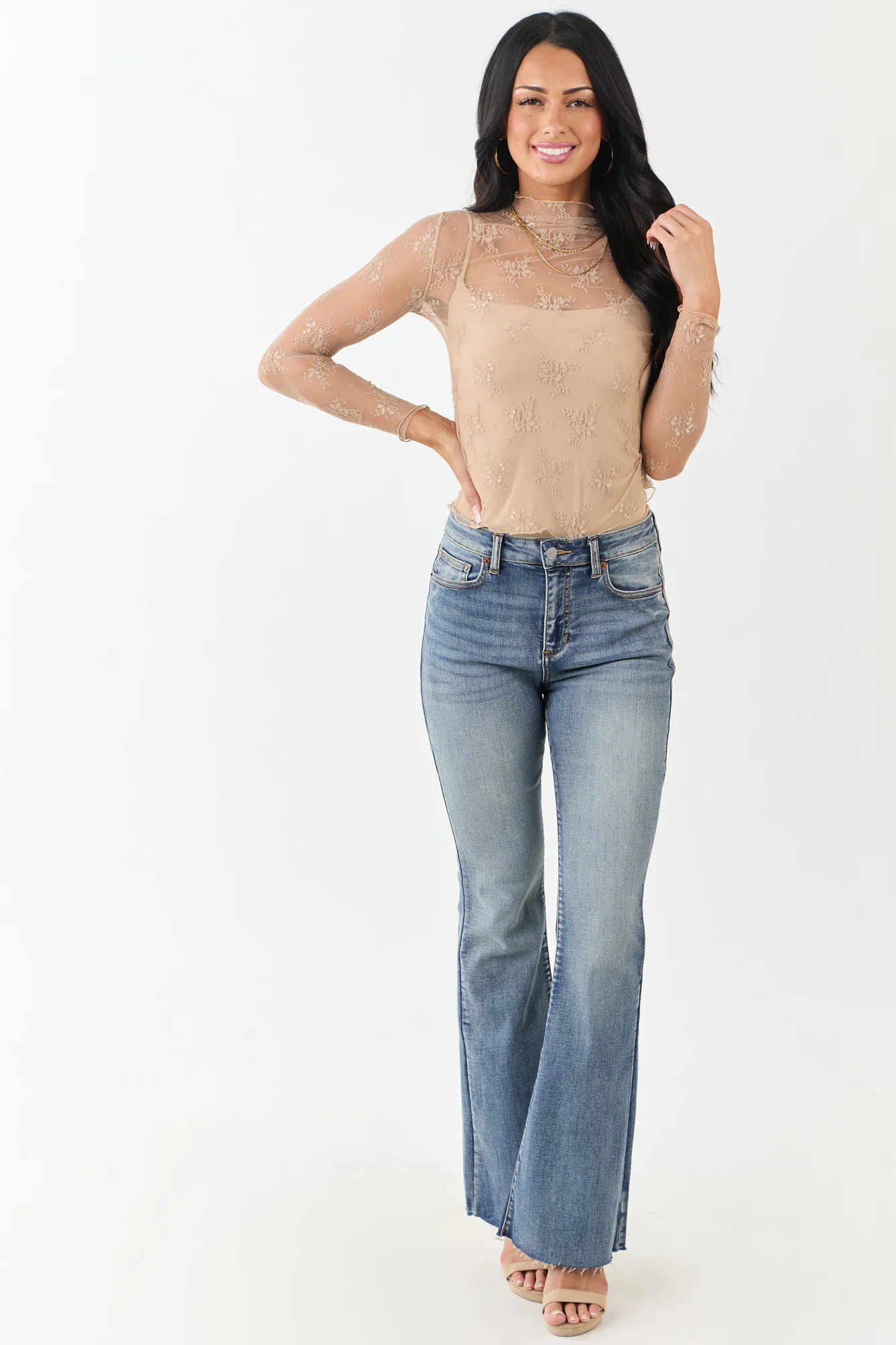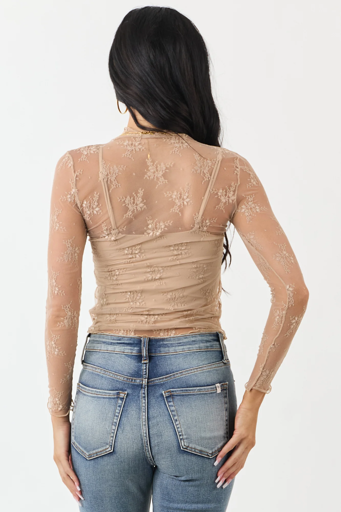 This delicately dreamy sheer floral lace top in beige is fitted and lightweight, perfect for romantic layering. The stretchy sheer mesh with a high neckline and lettuce trim exudes elegance. Made of 92% Polyester and 8% Spandex, this top is ideal for a stylish and sophisticated look. Imported. Available in sizes S, M, and L. Model is wearing a size Small. Model’s Profile: Size 1, Height 59″, Bust 34″, Waist 26″. Add a touch of romance to your wardrobe with this exquisite lace top.