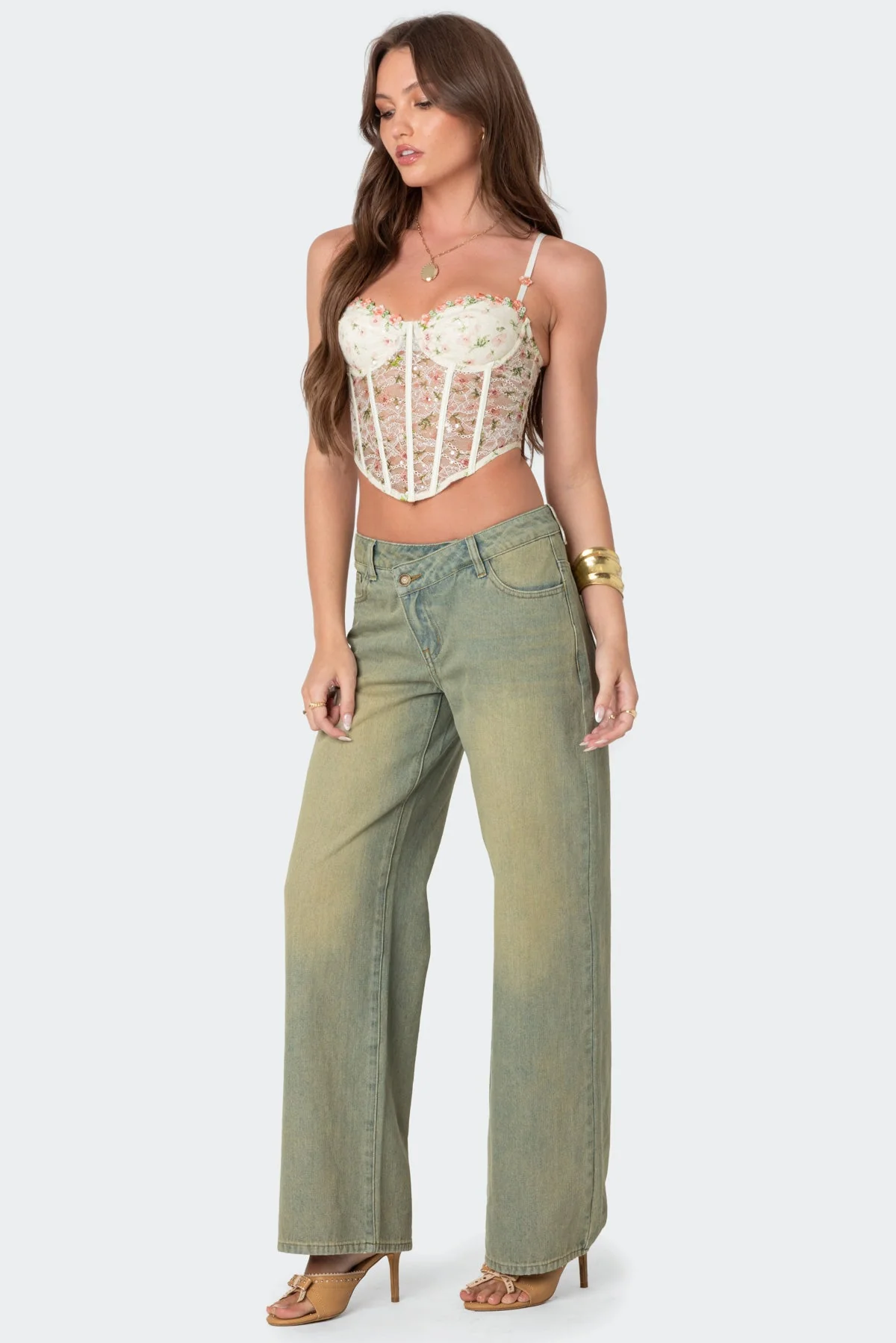 This stunning corset features adjustable straps, cupped construction, boned bodice, lined bust, and a lace-up back closure. Made from quality polyester and spandex, it boasts intricate floral detailing on sheer embroidered lace fabric. Perfect for adding a touch of elegance to any outfit. Hand wash in cool water for easy care.