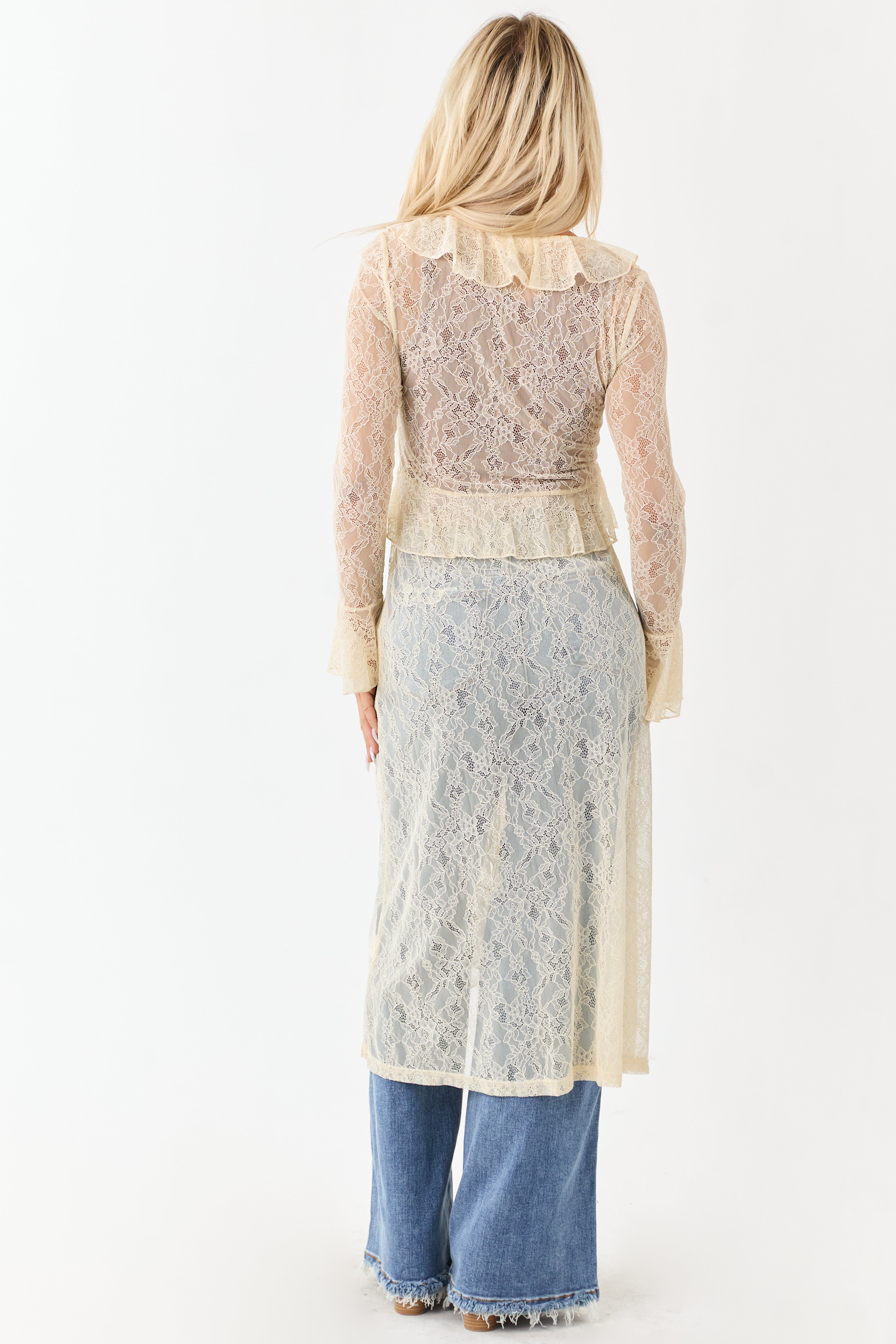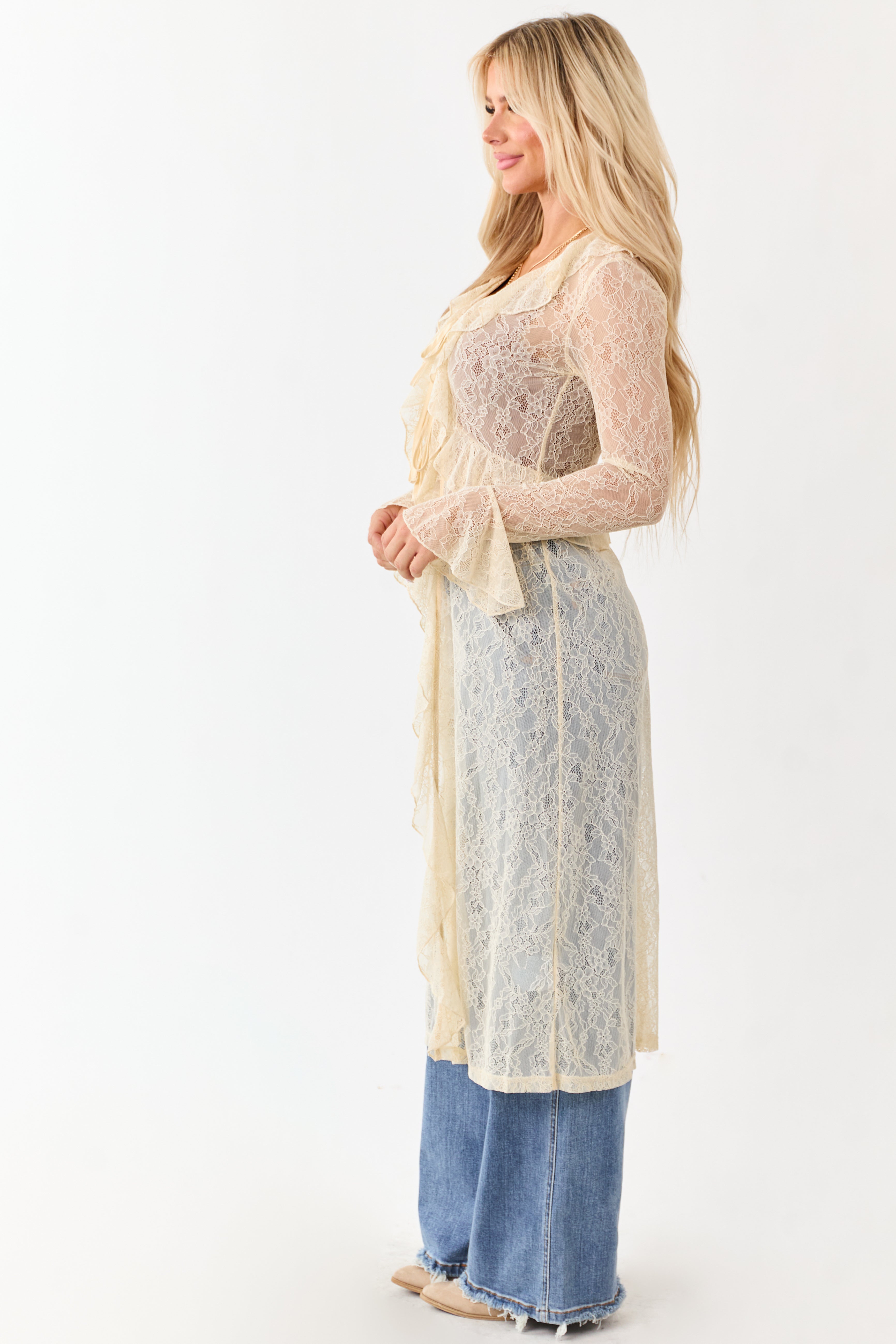 Indulge in romance with our sheer lace duster cardigan in a charming cream hue. Adorned with a delicate ruffle trim, this piece exudes femininity effortlessly. Crafted with stretchy lace, adjustable front ties, and a V neckline, it offers both style and comfort. Made of 95% Nylon and 5% Spandex with contrast detailing in 100% Polyester. Imported. Available in sizes S, M, and L. Ideal for those seeking a chic and sophisticated addition to their wardrobe.