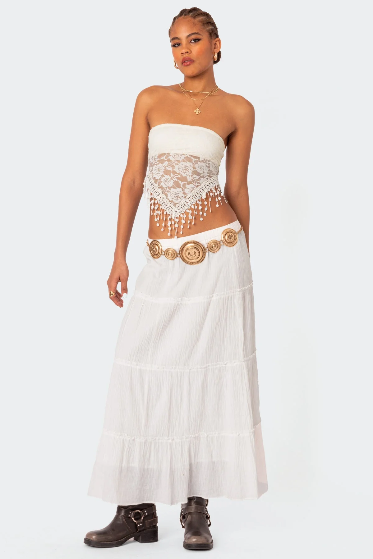 Experience unparalleled elegance with our Cream Sheer Lace Strapless Top. This top features a strapless fit, full coverage bust, lace fringe hem, and sheer lace fabric for a charming and alluring look. Crafted from a blend of Polyester and Spandex, it offers both style and comfort. Available in sizes XS to XL. Ideal for various occasions, this top pairs perfectly with skirts, jeans, or shorts. Elevate your wardrobe with our India-inspired design.