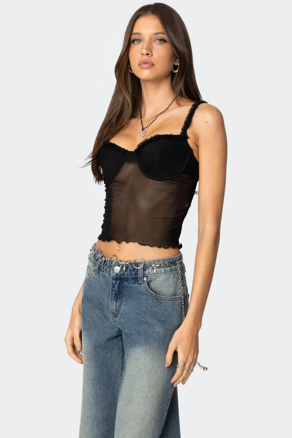 Discover the perfect blend of comfort and style with our Sheer Mesh Corset Bra Top in Black. Designed with lined cups, ruffled straps, and a lettuce hem for a flirty look. Crafted from sheer mesh fabric of polyester and spandex blend, this top offers a sophisticated touch to your outfit. Adjust the fit with the adjustable straps and back clasp. Perfect for various occasions. Model wears size S and is 57 tall. Care instructions: Wash with similar colors.