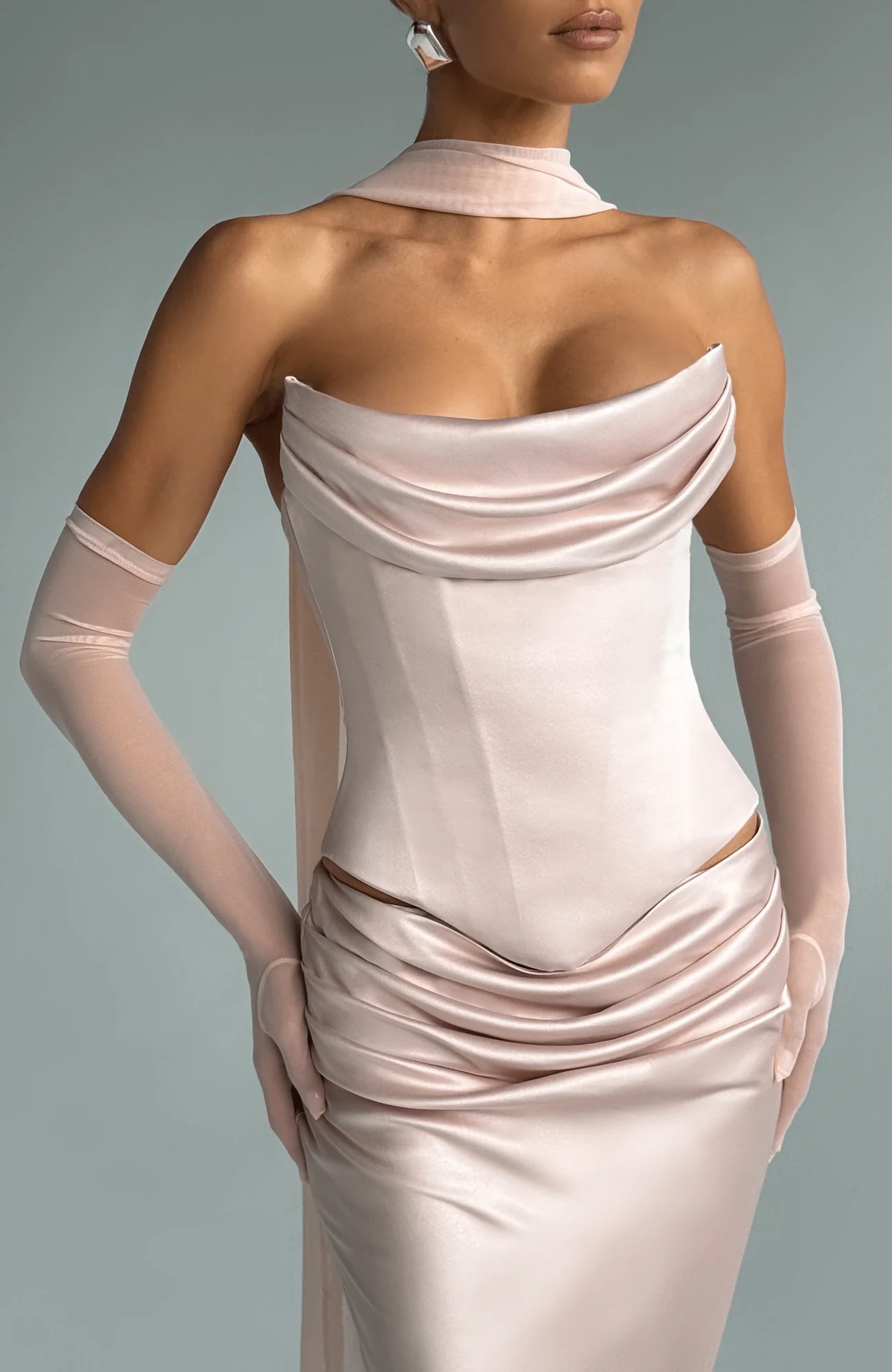 Indulge in elegance with our Sheer Mesh Elbow-Length Gloves in Soft Peach. Crafted from delicate stretch mesh, these gloves offer a lightweight and sheer finish that delicately contours to your arms. Enhance your ensemble with a soft, ethereal touch by pairing these gloves with our Ayla Scarf, Calista Corset, and Bernadette Maxi Skirt. Elevate your style effortlessly with our exquisite Soft Peach gloves. Experience luxury and sophistication like never before.