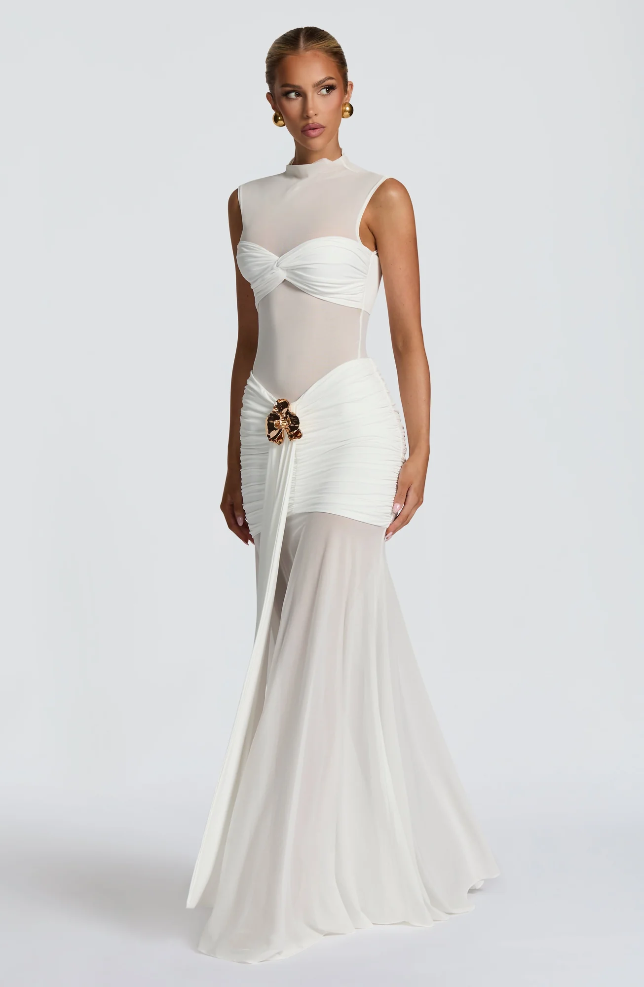 The Sheer Mesh White Dress Top is longline and stylish with a high mock neck and sleeveless design. It features double slinky twist bandeau overlay detail for an elegant look. Made of quality jersey and mesh materials, this bodycon top can be paired perfectly with the Fae Maxi Skirt for a coordinated outfit. The soft and breathable fabric ensures comfort throughout the day, making it suitable for various occasions. Elevate your wardrobe with this flattering piece. *Note: Brooch sold with Fae Maxi Skirt included in the package.
