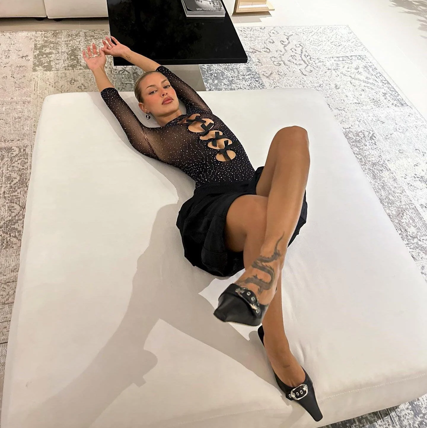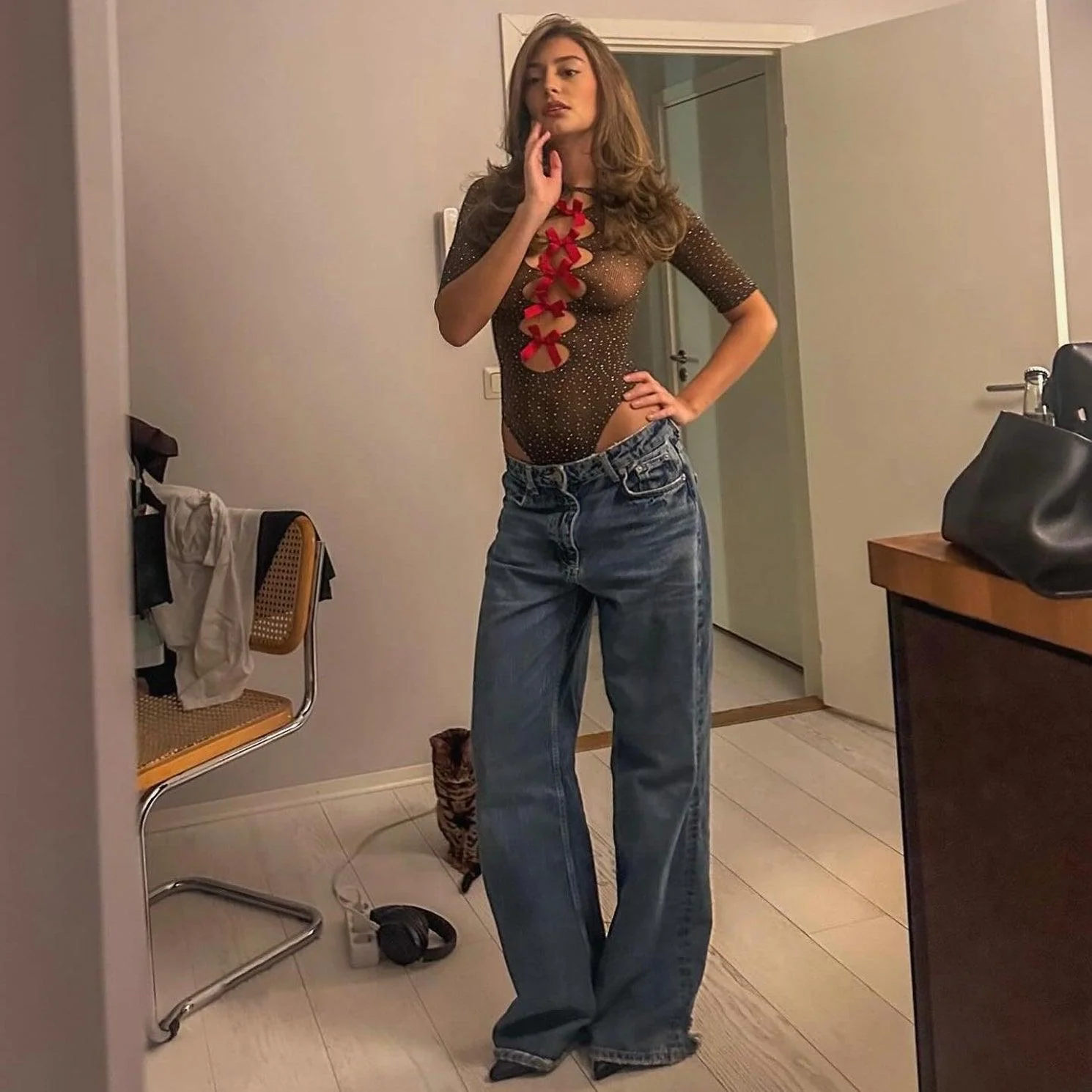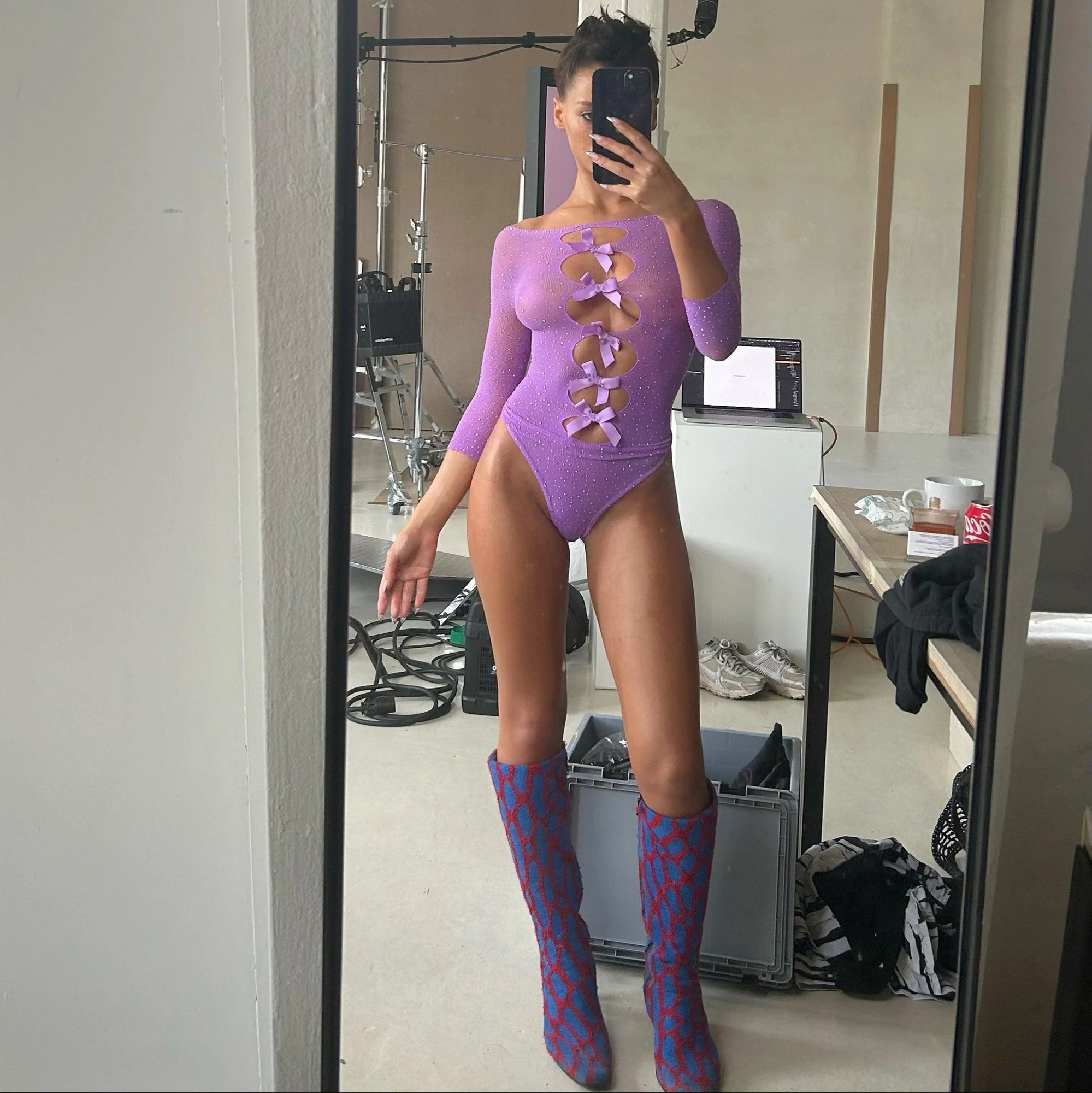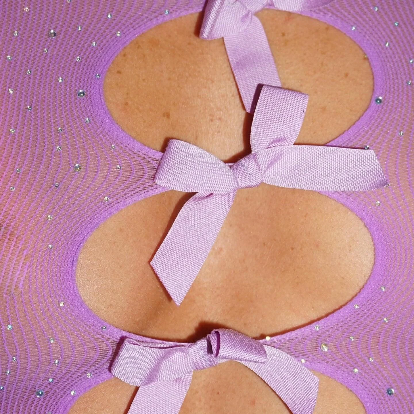 Make a bold statement with our stunning sheer Rhinestone Embellished Bodysuit available in purple, blue, black, and brown. This bodysuit features playful bow details, a slim and flattering fit, and is made of breathable stretchable fabric (75% Polyester & 25% Spandex). Pair it with jeans or a mini skirt for an elegant and playful ensemble. Explore more styling ideas on our Instagram @mermaid_way! If you need a different size, we offer a complimentary exchange. Elevate your wardrobe with this stylish bodysuit!