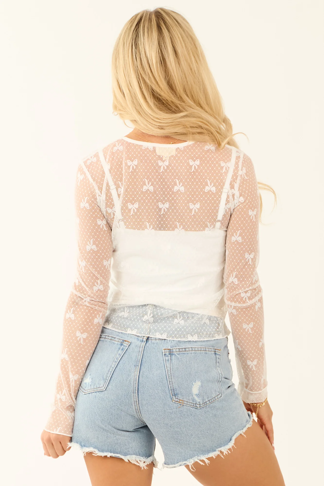 Discover charm and sophistication with our Sheer White Bow Print Mesh Long Sleeve Top. Made with stretchy mesh fabric featuring a delightful polka dot and bow pattern, this top exudes elegance. The round neckline and unlined design add to its allure. Available in sizes S, M, and L with sleeve lengths from 26″ to 27″, and length options of 21″ to 23″, bust sizes from 36″ to 42″. Suitable for any occasion, this top fits slightly large, but if between sizes, we recommend sizing down. Crafted from 95% Polyester and 5% Spandex for the perfect blend of comfort and style. Imported, brand: Umgee. Ideal for hand wash only in cold water, separately, as colors may bleed. Avoid bleach and dry by hanging. Model pictured is wearing a size Small. Model’s Profile: Size 1, Height 57″, Bust 34″, Waist 26″.
