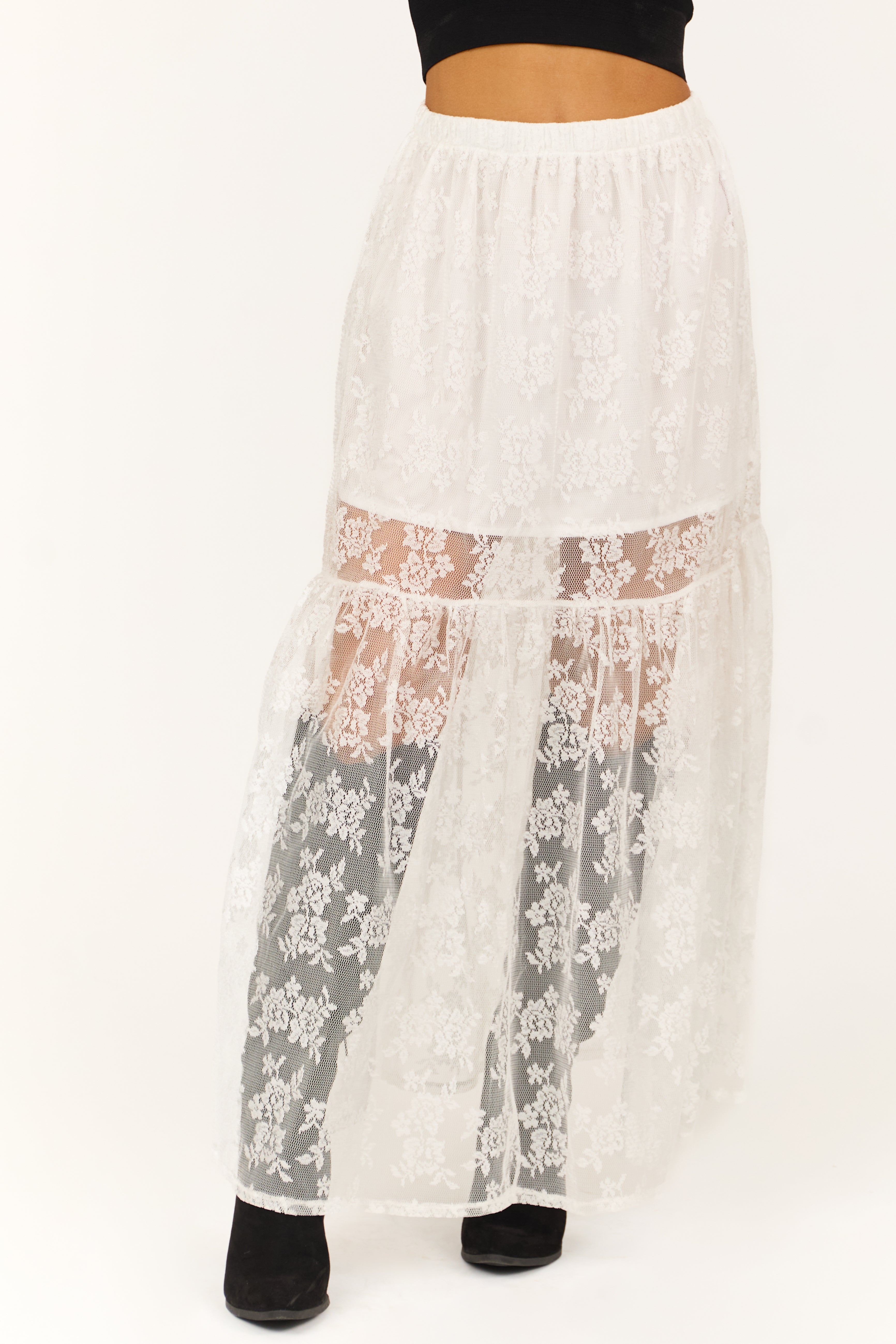 Indulge in feminine elegance with our Sheer White Lace A-Line Maxi Skirt. Crafted from non-stretchy woven fabric, featuring a delicate floral lace pattern, elastic waistband, and lined to mid-thigh for a graceful silhouette. This skirt adds a touch of sophistication to your wardrobe. Available in sizes S, M, and L. Perfect for a romantic evening out or special occasions. Care instructions: Cold wash, professional dry clean recommended, cool iron, do not bleach. Model is wearing a size Small – Height: 57, Bust: 34, Waist: 26.