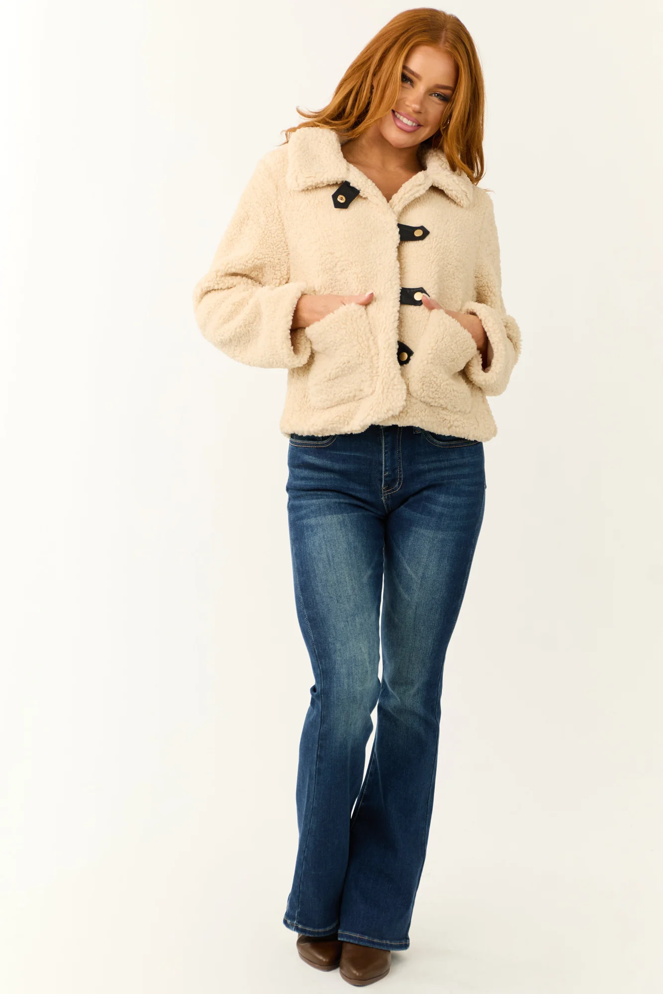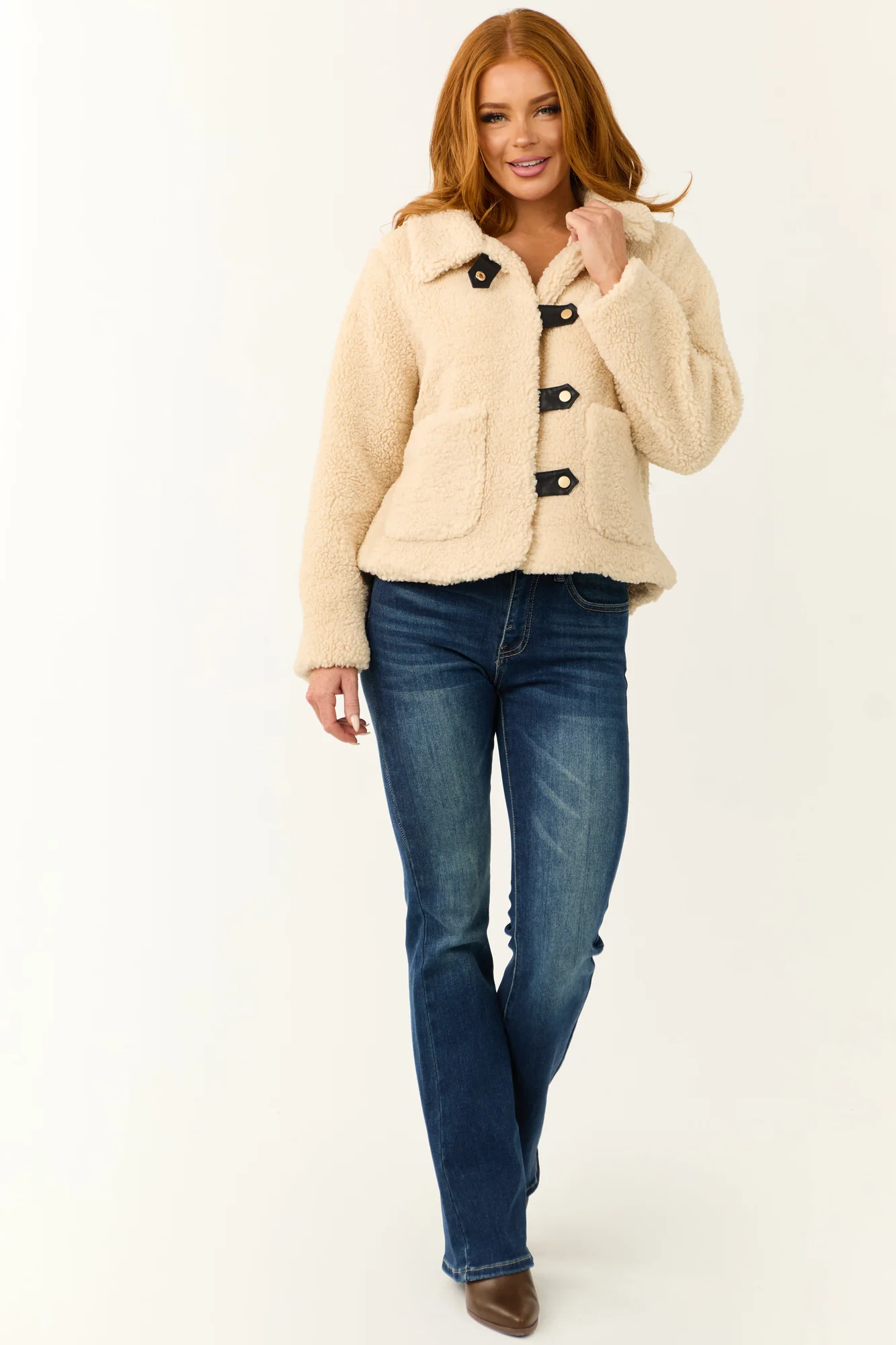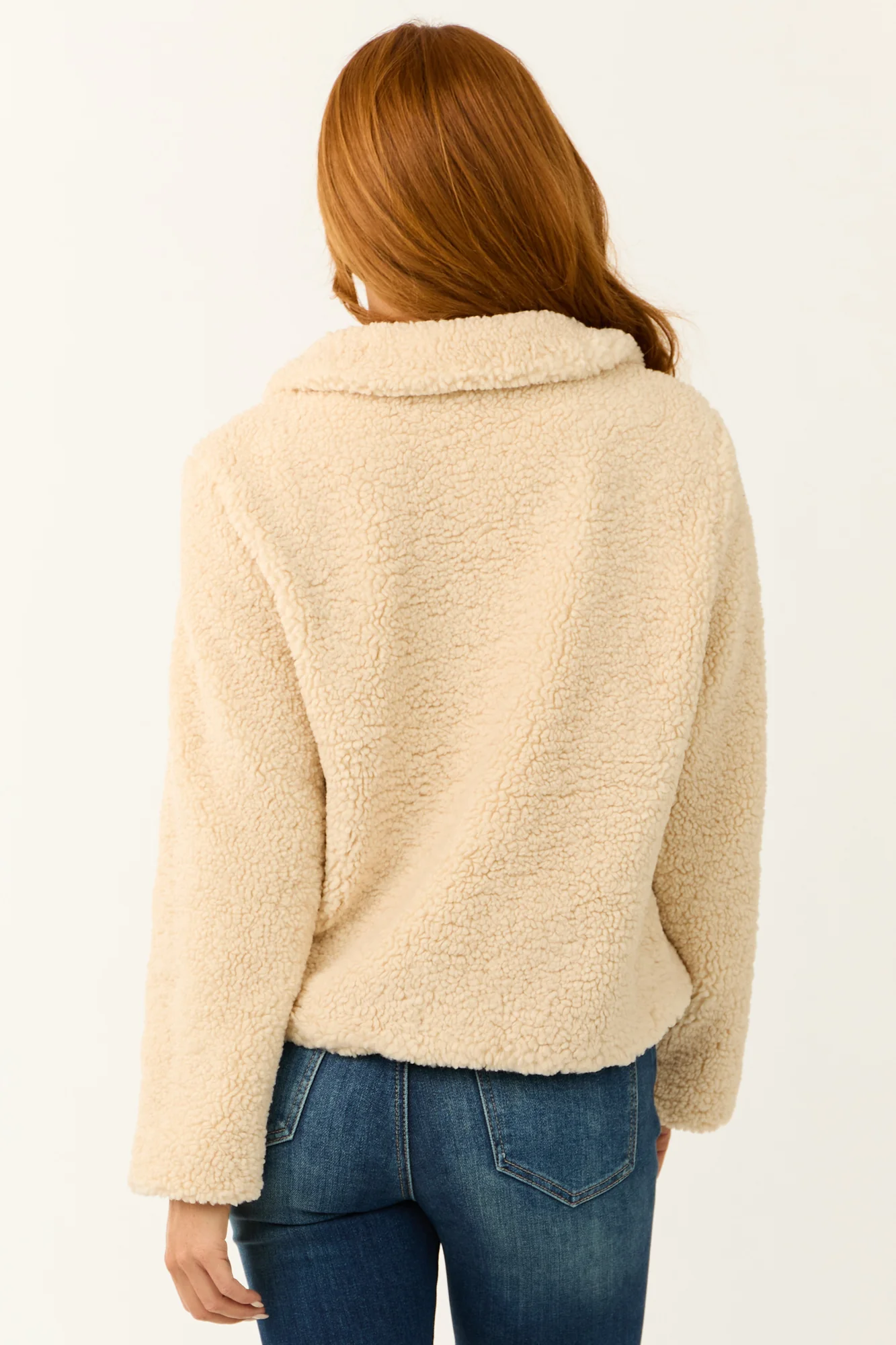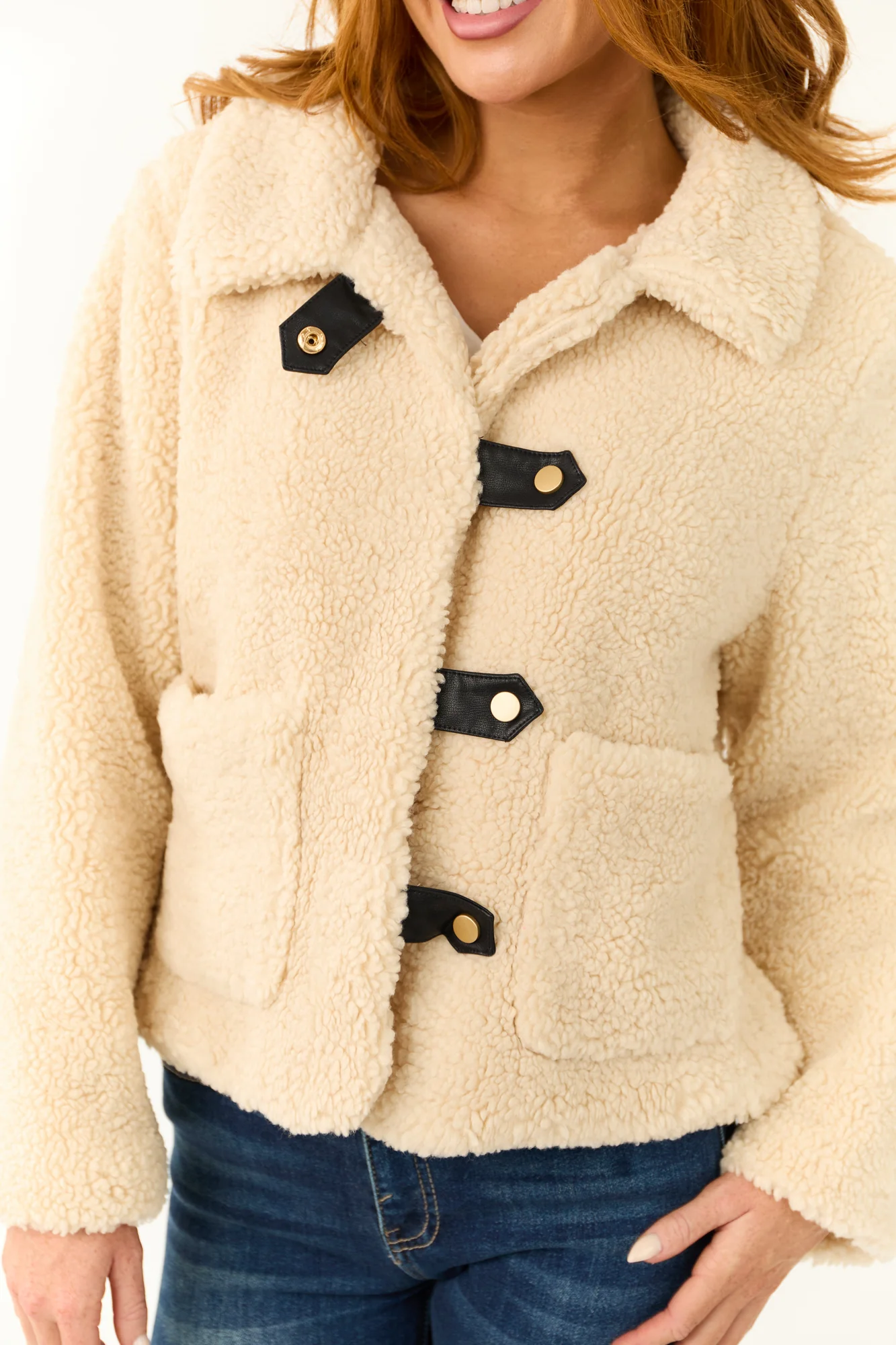 Stay cozy and stylish with our Cream Sherpa Long Sleeve Button Down Jacket. Made from non-stretchy soft sherpa with black and gold button details, this jacket features a collared neckline, side pockets, and a comfortable lining. Available in sizes S, M, L, and XL. Self and lining crafted from 100% Polyester. Imported. Care instructions: Hand wash cold, do not wring or twist, use non-chlorine bleach, line dry, iron on low if needed, or dry clean. Model is wearing a size Small. Model’s Profile: Size 1, Height 55″, Bust 31″, Waist 24″.