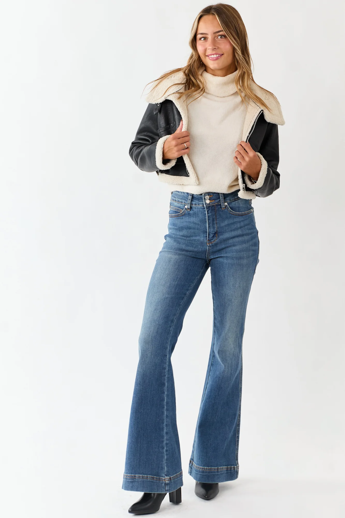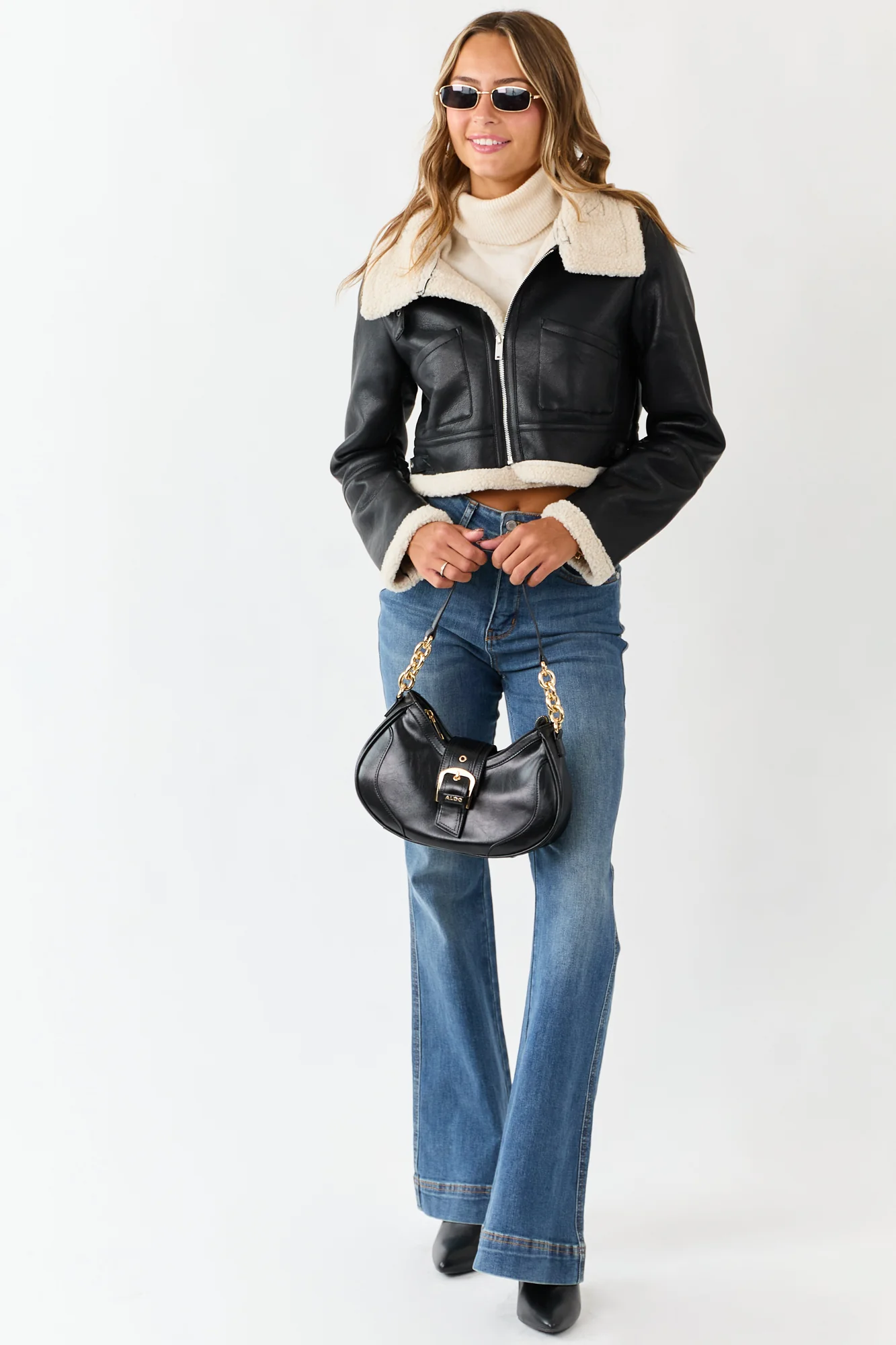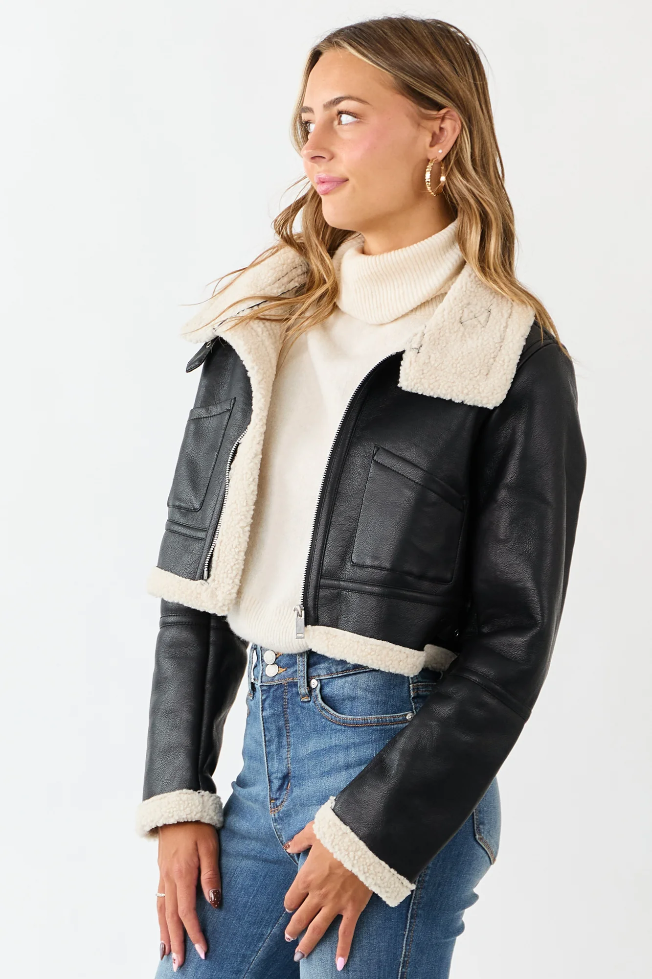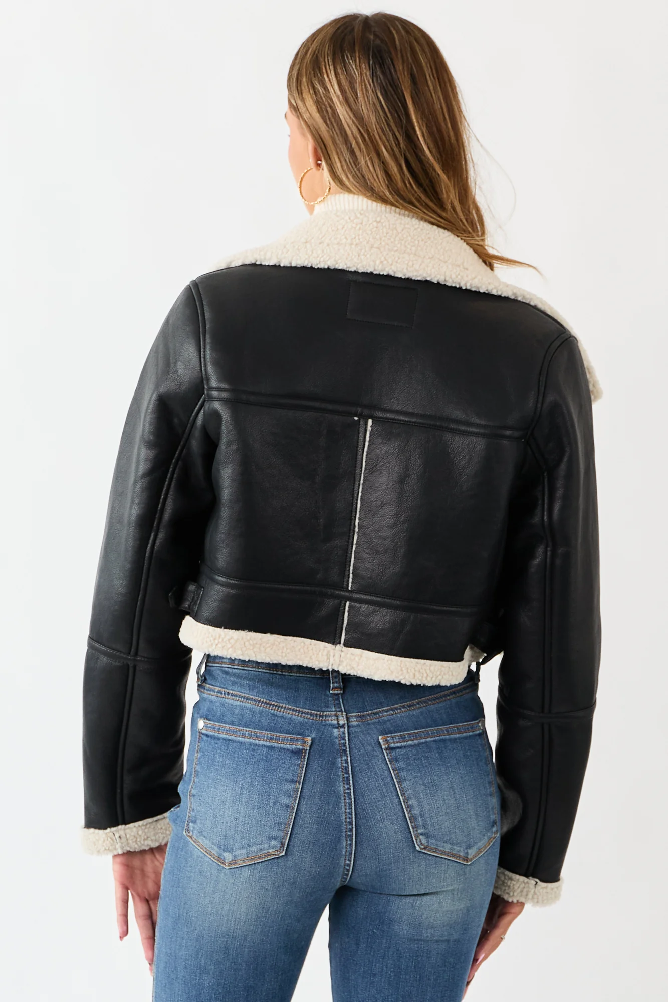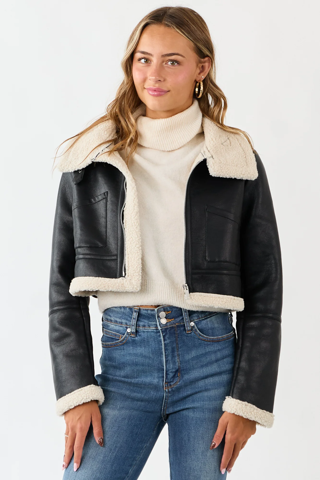 Indulge in luxury with our Sherpa Lined Cropped Faux Leather Jacket in Black. Made from soft faux leather with a cozy sherpa lining, this trendy jacket features a semi-cropped design, adjustable buckle closures, side pockets, and camel sherpa details. The semi-stretchy faux leather ensures a comfortable fit. Perfect for the cooler seasons, this jacket is a must-have addition to your outerwear collection. Available in sizes S, M, L.