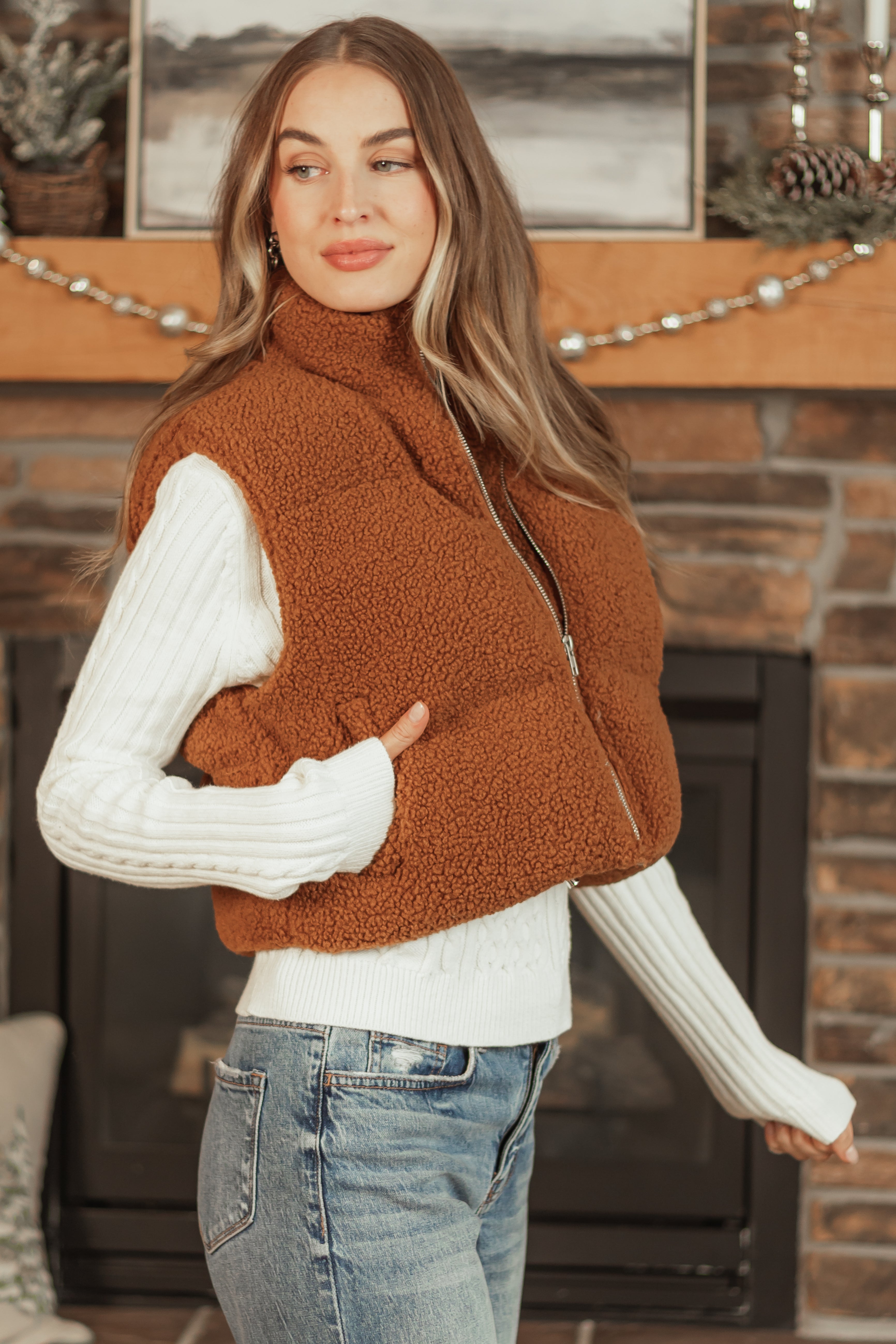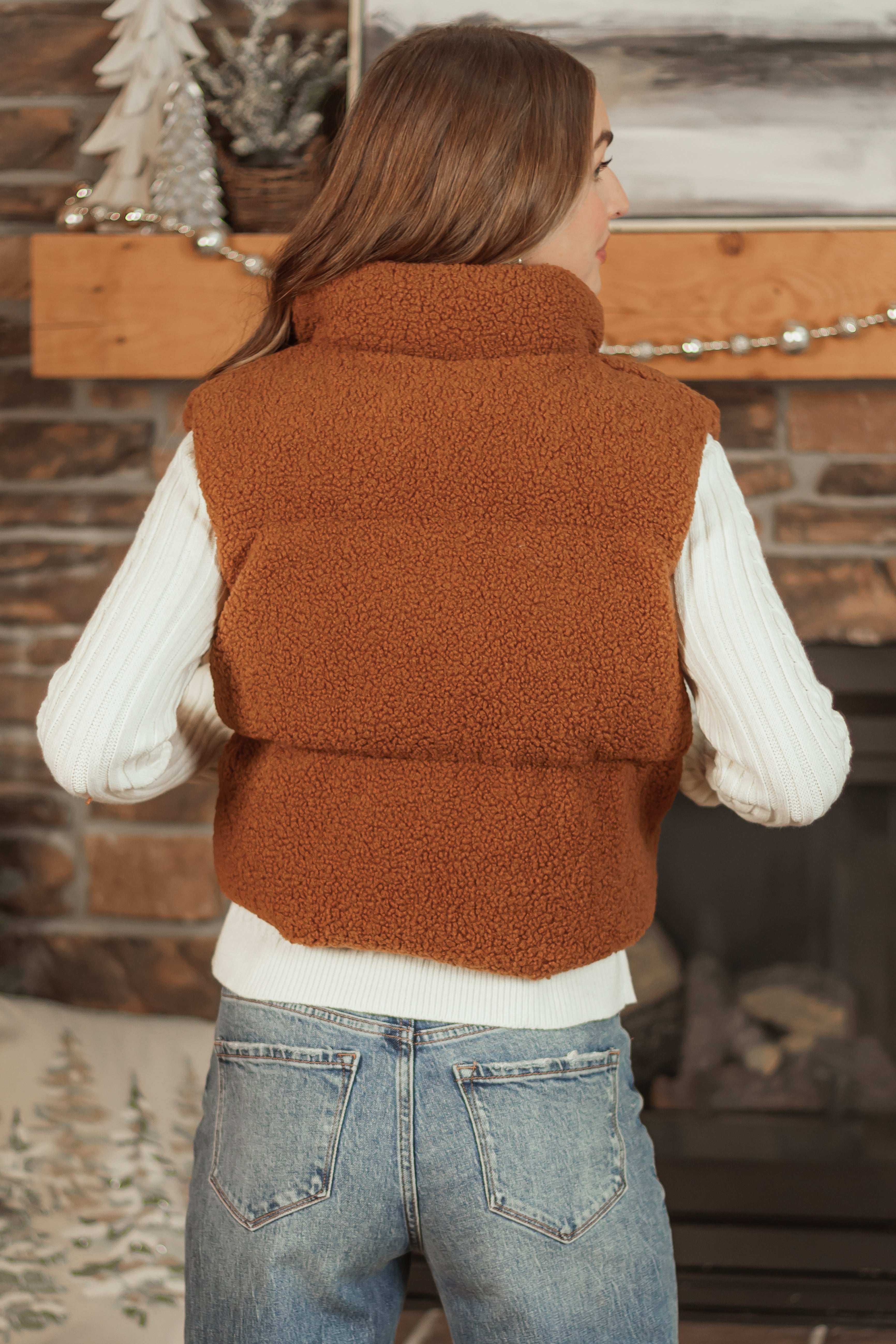 Stay warm and stylish with our Sherpa Zip Up Puffer Vest in spice color. This non-stretchy vest features side pockets, a cinched waistband, and a soft lining for comfort. Made of 100% polyester, it is ideal for winter days. Hand wash in cold water and line dry for best care. Model is wearing a size Small. Perfect for daytime outings!