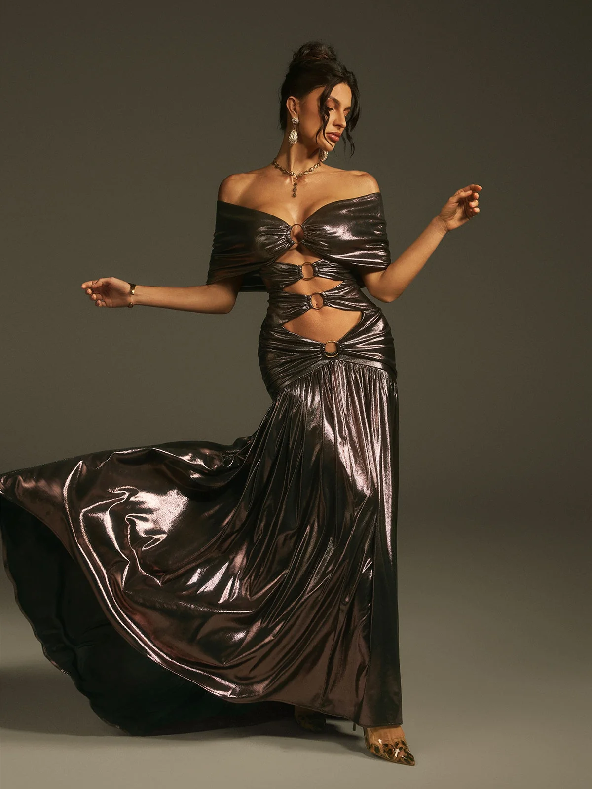 Tags: Glamorous Dress, maxi dress, metallic dress, off-shoulder dress, special occasion dress