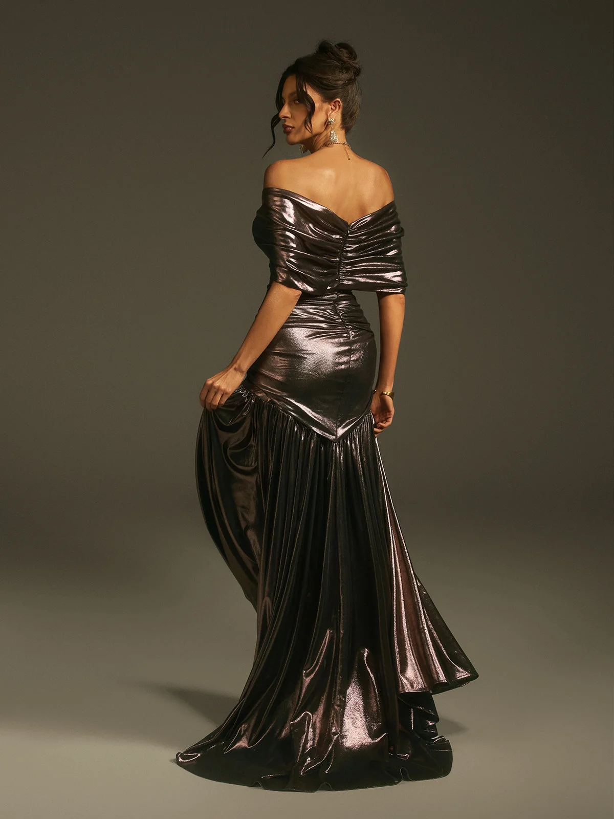 Shimmering Off-Shoulder Metallic Maxi Dress