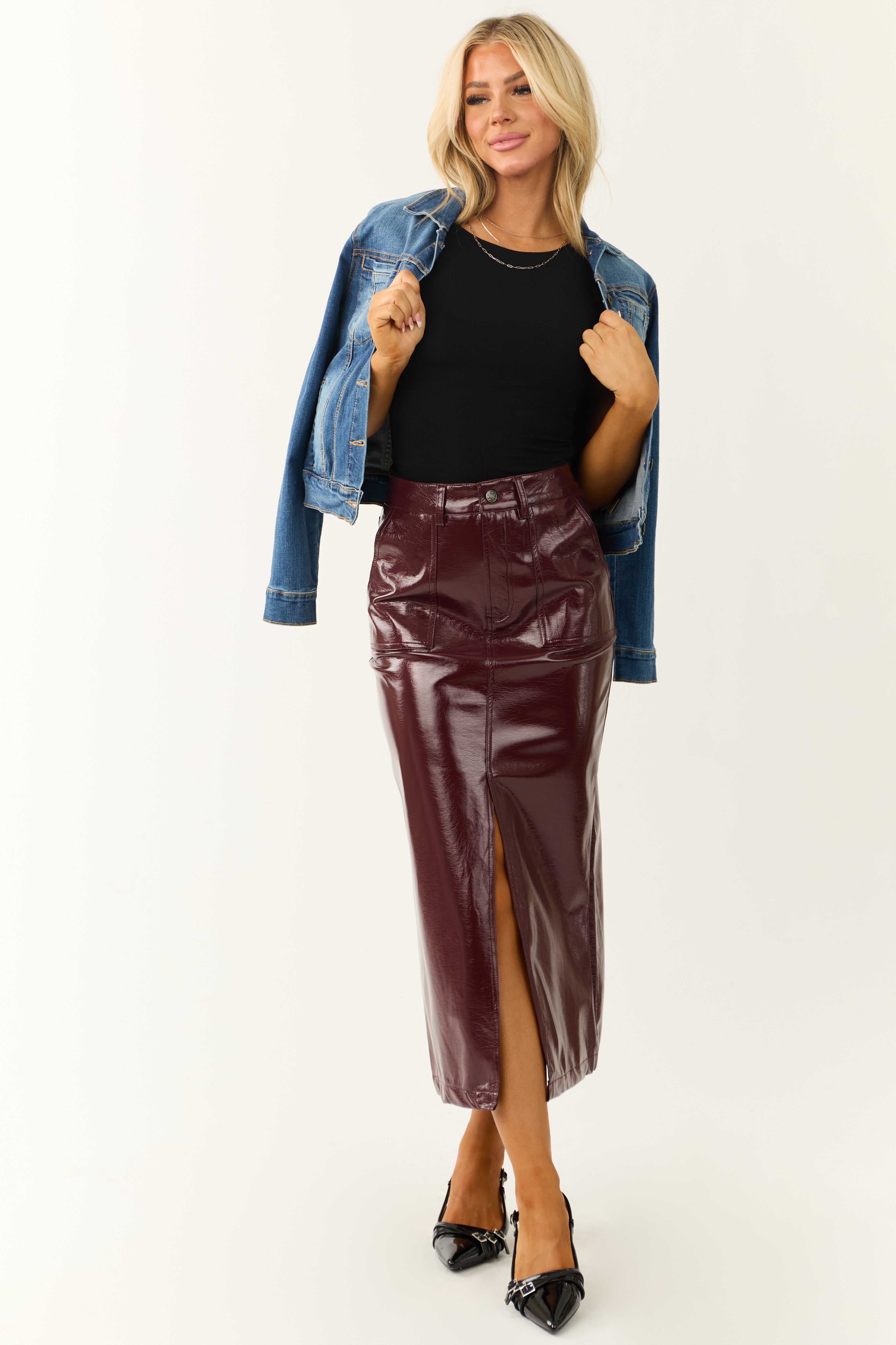 Upgrade your wardrobe with our stunning Shiny Red Faux Leather Front Slit Midi Skirt. Available in sizes Small, Medium, and Large, this semi-stretchy skirt features a zipper fly with button closure, belt loops, side pockets, and is unlined for comfort. Crafted from 55% Cotton and 45% PU, its perfect for various occasions. Care instructions: Hand wash cold, do not bleach, do not iron. Modelsstats: Model #1 – Size 1, Height 55″, Bust 31″, Waist 24″. Model #2 – Size 1, Height 57″, Bust 34″, Waist 26″.