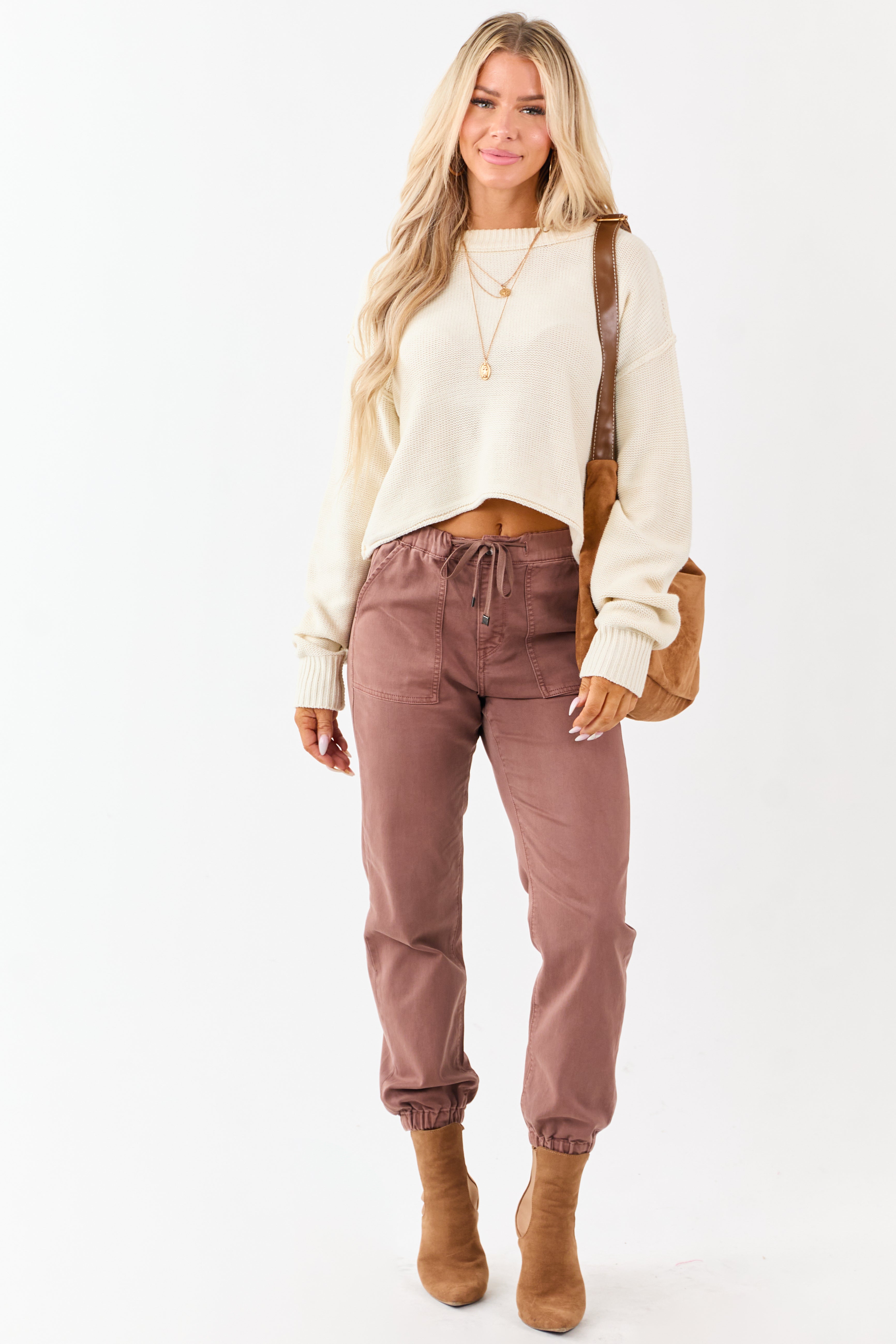 Discover comfort and style with our Sienna Cropped Jogger Jeans for women. These soft, lightweight denim jeans feature an adjustable drawstring waistband, elastic hem, and four pockets. Made with a blend of 68% Cotton, 30% Polyester, and 2% Spandex for a semi-stretchy fit. High rise design with a 27-inch inseam. Stay on-trend and cozy with our stylish jogger jeans. Ideal for everyday wear, pair them with your favorite top and sneakers for a fashionable look. Model is wearing size small. Available in sizes XS to XL.